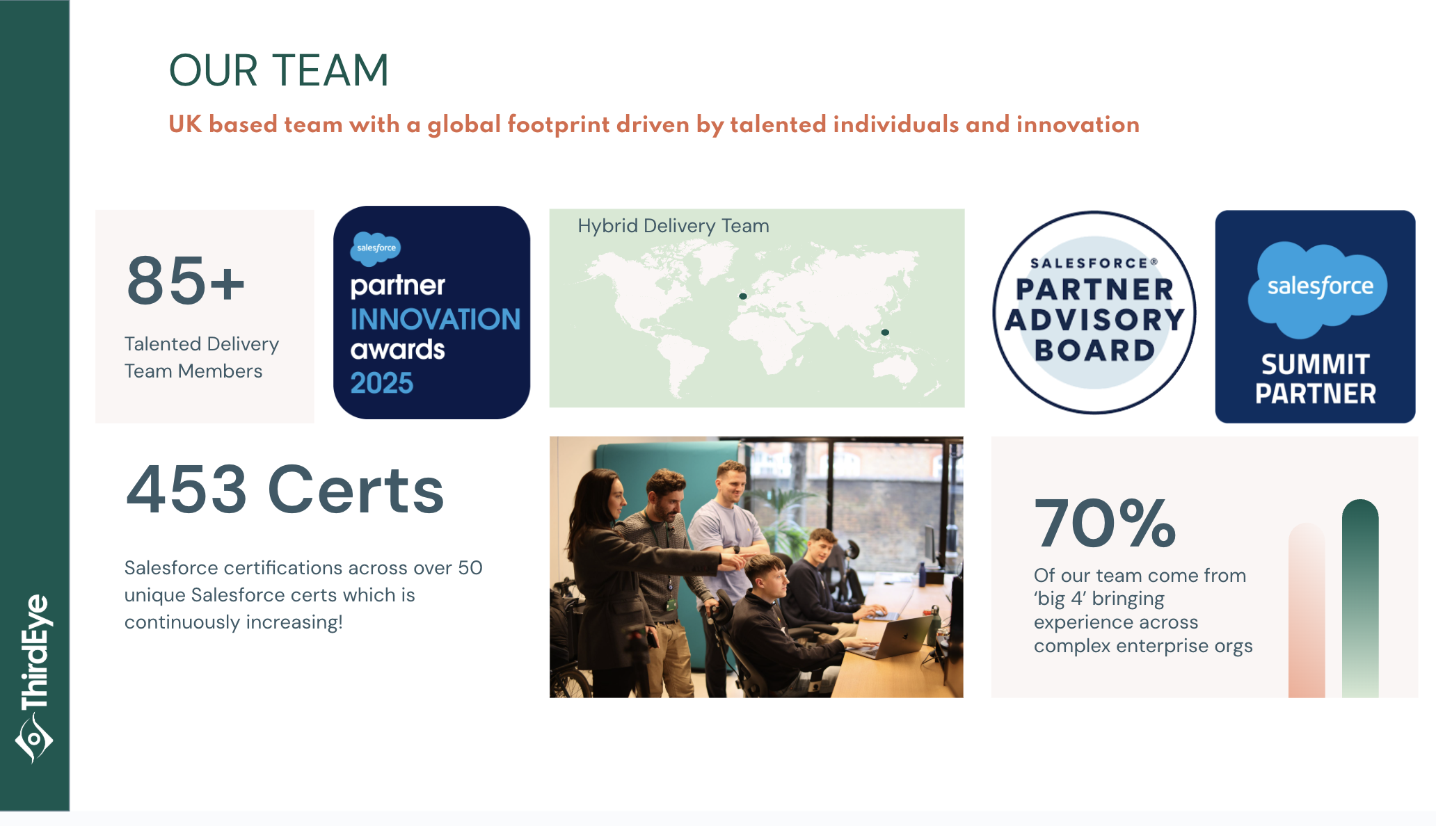 About ThirdEye Consulting ThirdEye Consulting is a highly regarded consulting firm specialising in Strategic Planning, Implementation Services and Ongoing Support of both the Salesforce platform and MuleSoft's Anypoint platform. Focusing on the UK & Ireland, ThirdEye strives to bring expert Salesforce and MuleSoft consulting services to mid-market and medium sized enterprise customers. With a promise to staff every project with a Certified Technical Architect and a strong background in change management, ThirdEye will ensure projects achieve success through a focus on both superior technical solutions and alignment to your company's vision and goals.