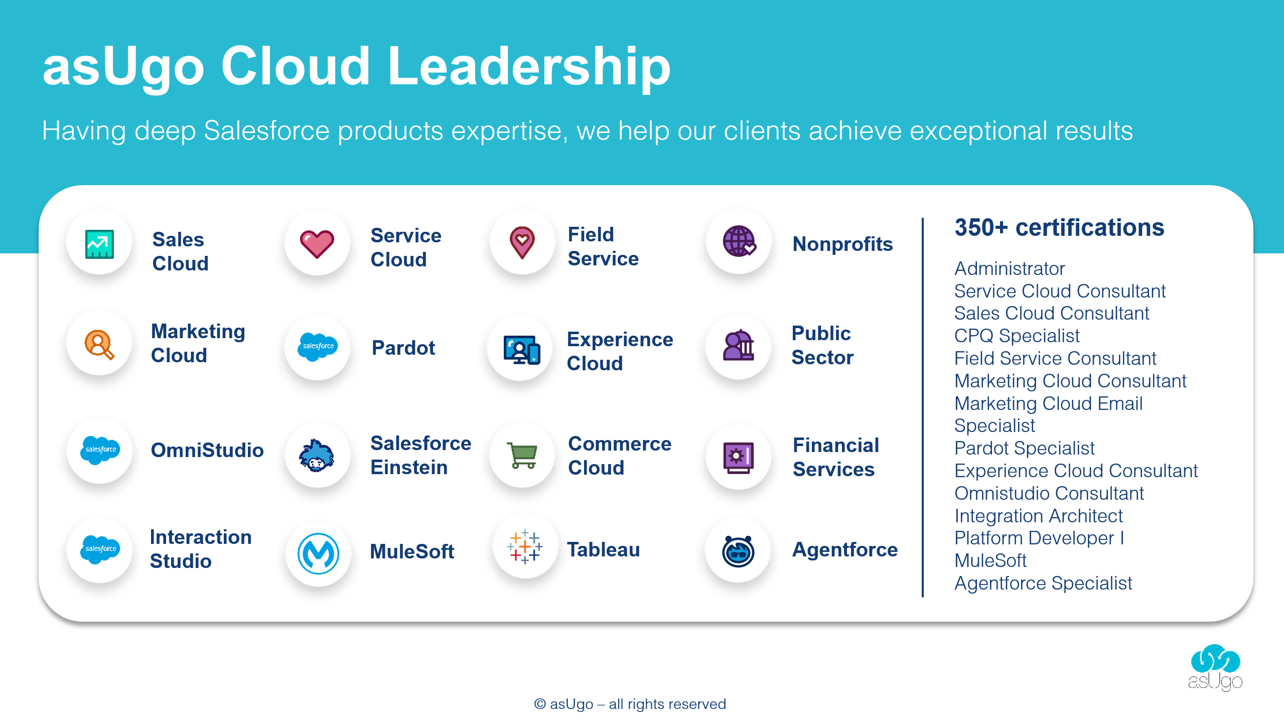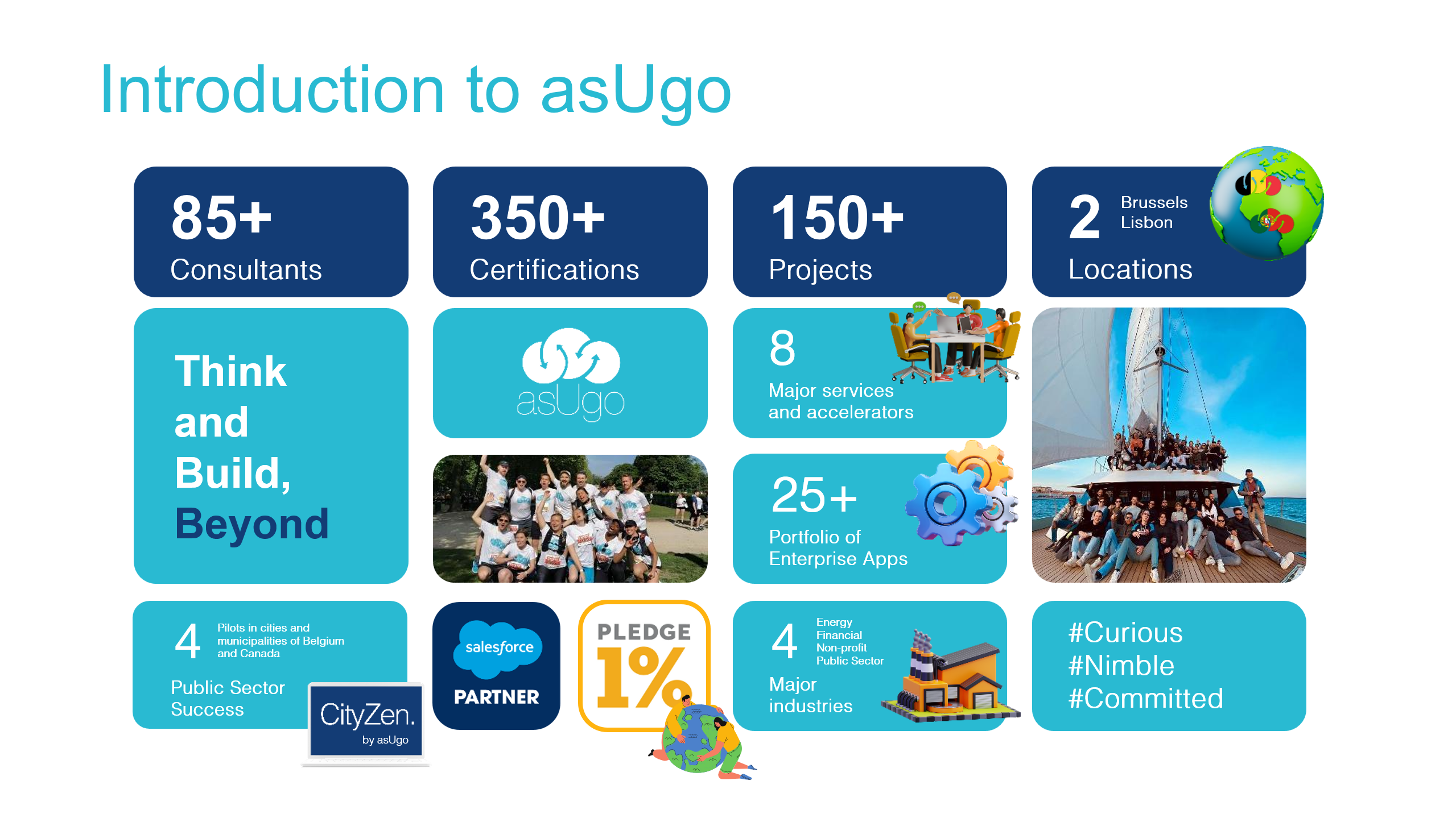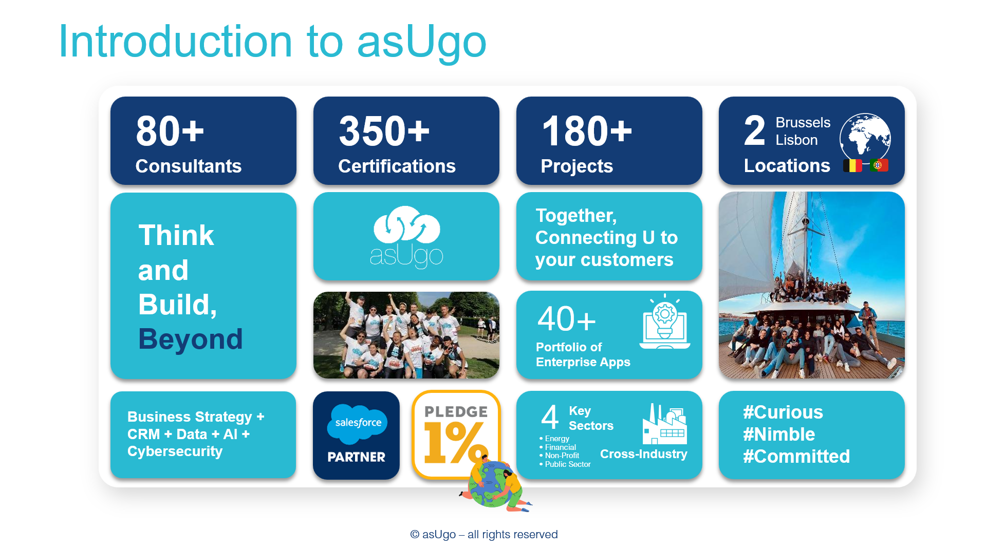 About asUgo asUgo is a leading Salesforce Crest Consulting Partner, Salesforce.org Impact Partner and proud Pledge 1% member. Curious in why we do things, Nimble in how we do them, and Committed in what we do, we are passionate about shaping the journey with U.####Transformation goes beyond technology. That’s why we combine a value driven approach with a human vision, for live Salesforce environments and for new endeavours alike. With offices in Belgium, Portugal and Canada, our team offers the full set of services to articulate your ambitions: business guidance, journey shaping and project implementation, enhance existing implementations, creating value through maintenance. Along the delivery, we guide change and maturity, and ensure that U grow capabilities beyond the product itself.####We Think and Build Beyond.
