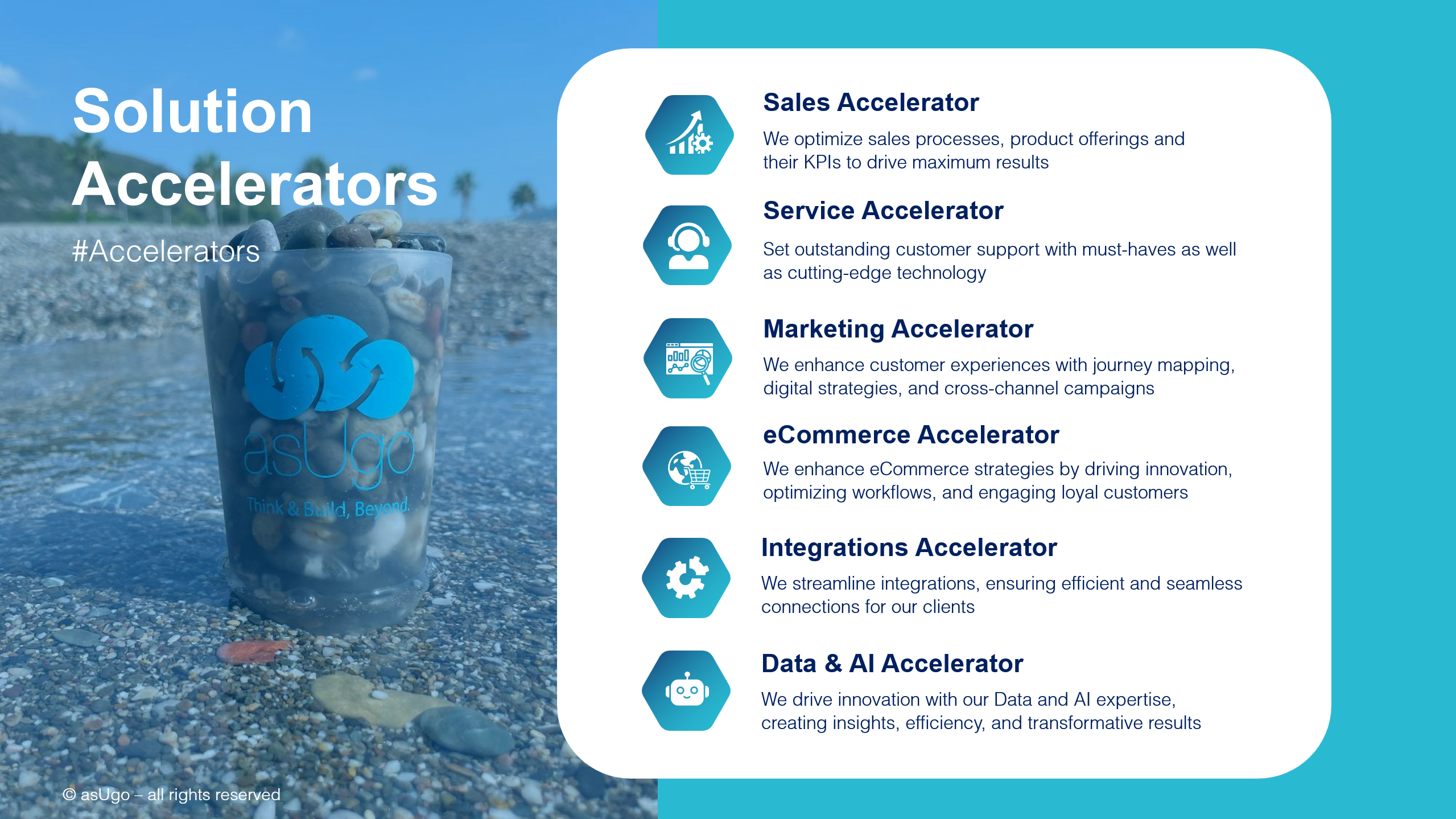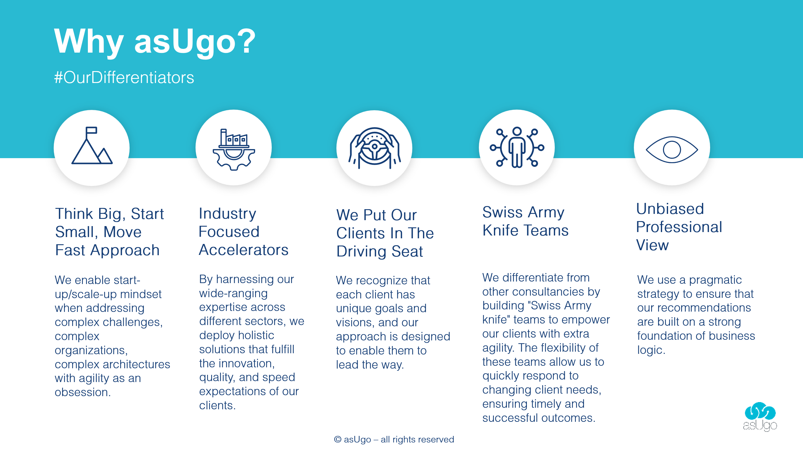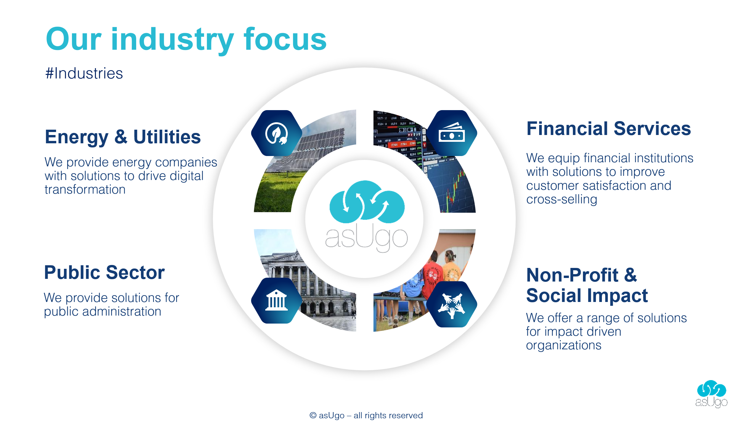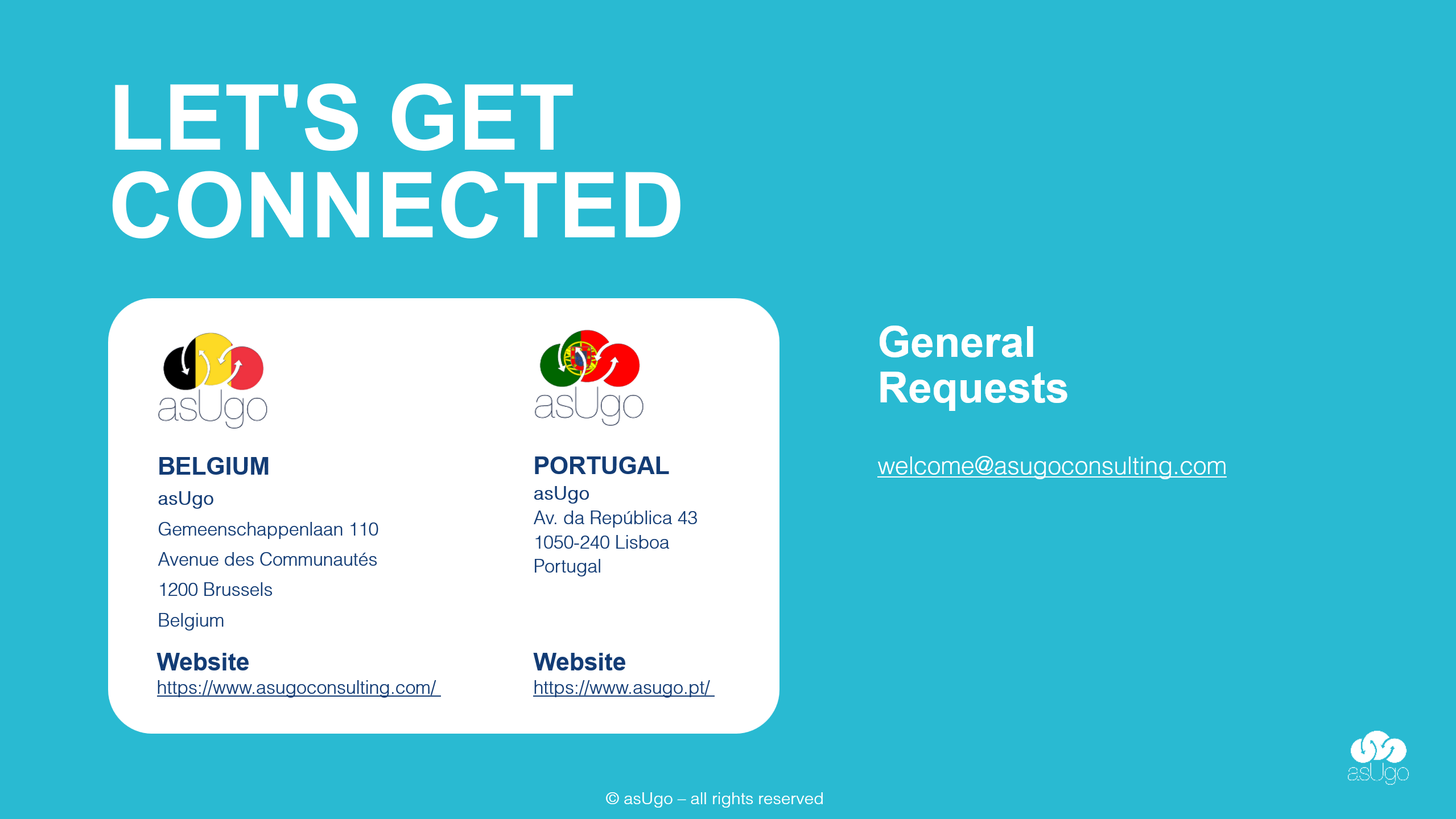 About asUgo asUgo is a leading Salesforce Crest Consulting Partner, Salesforce.org Impact Partner and proud Pledge 1% member. Curious in why we do things, Nimble in how we do them, and Committed in what we do, we are passionate about shaping the journey with U.####Transformation goes beyond technology. That’s why we combine a value driven approach with a human vision, for live Salesforce environments and for new endeavours alike. With offices in Belgium, Portugal and Canada, our team offers the full set of services to articulate your ambitions: business guidance, journey shaping and project implementation, enhance existing implementations, creating value through maintenance. Along the delivery, we guide change and maturity, and ensure that U grow capabilities beyond the product itself.####We Think and Build Beyond.