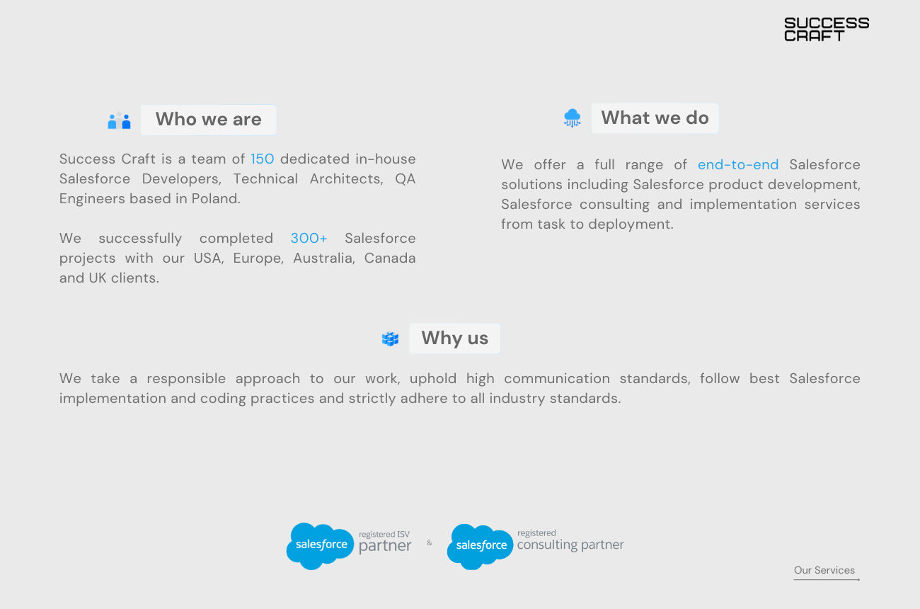 Success Craft is a team of 150 dedicated in-house Salesforce Developers, Technical Architects and QA Engineers based in Poland.