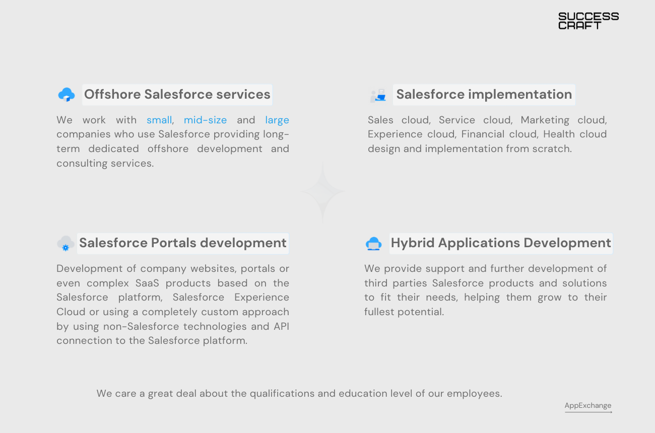 About Success Craft Success Craft is a Salesforce Experts company specializing in managing complex Salesforce.com software development challenges. Due to narrow specialization in Salesforce.com, Success Craft can apply Salesforce features and enhancements to your business. ####We offer a full range of end-to-end Salesforce outsourcing solutions, product development and various Salesforce consulting services, from task to deployment, from our highly skilled, trained, and certified Salesforce.com developers, QA engineers, project managers, all of whom are constantly led and supported by our certified Technical Architects.####We are interested in long-term relationships with our customers! ##Contact us with any questions or suggestions.
