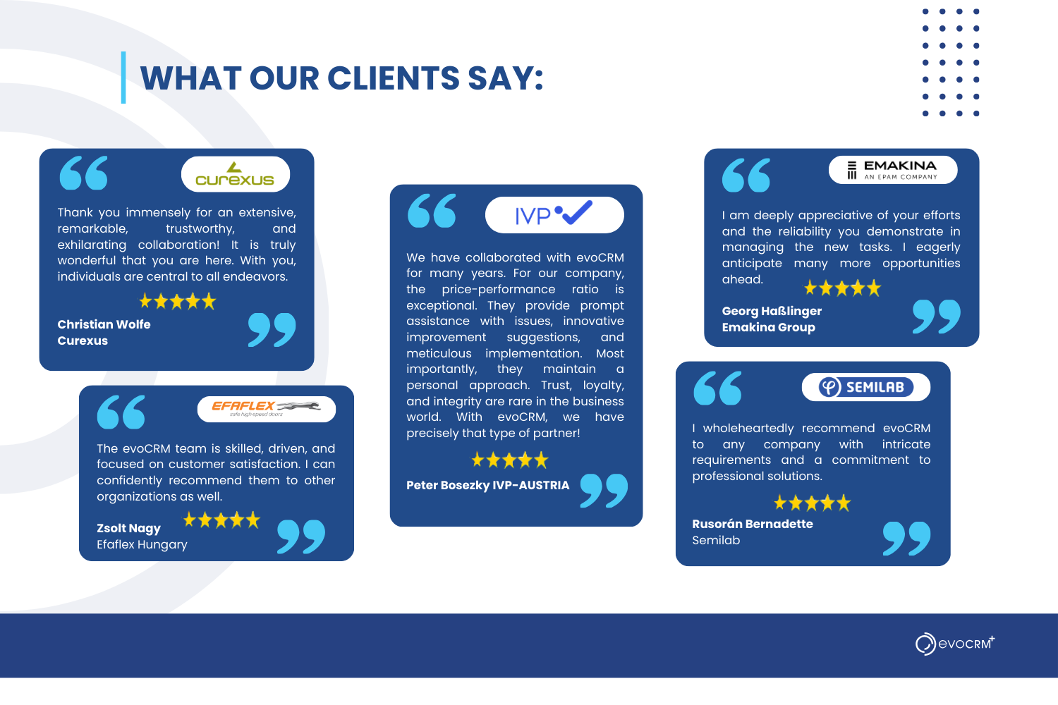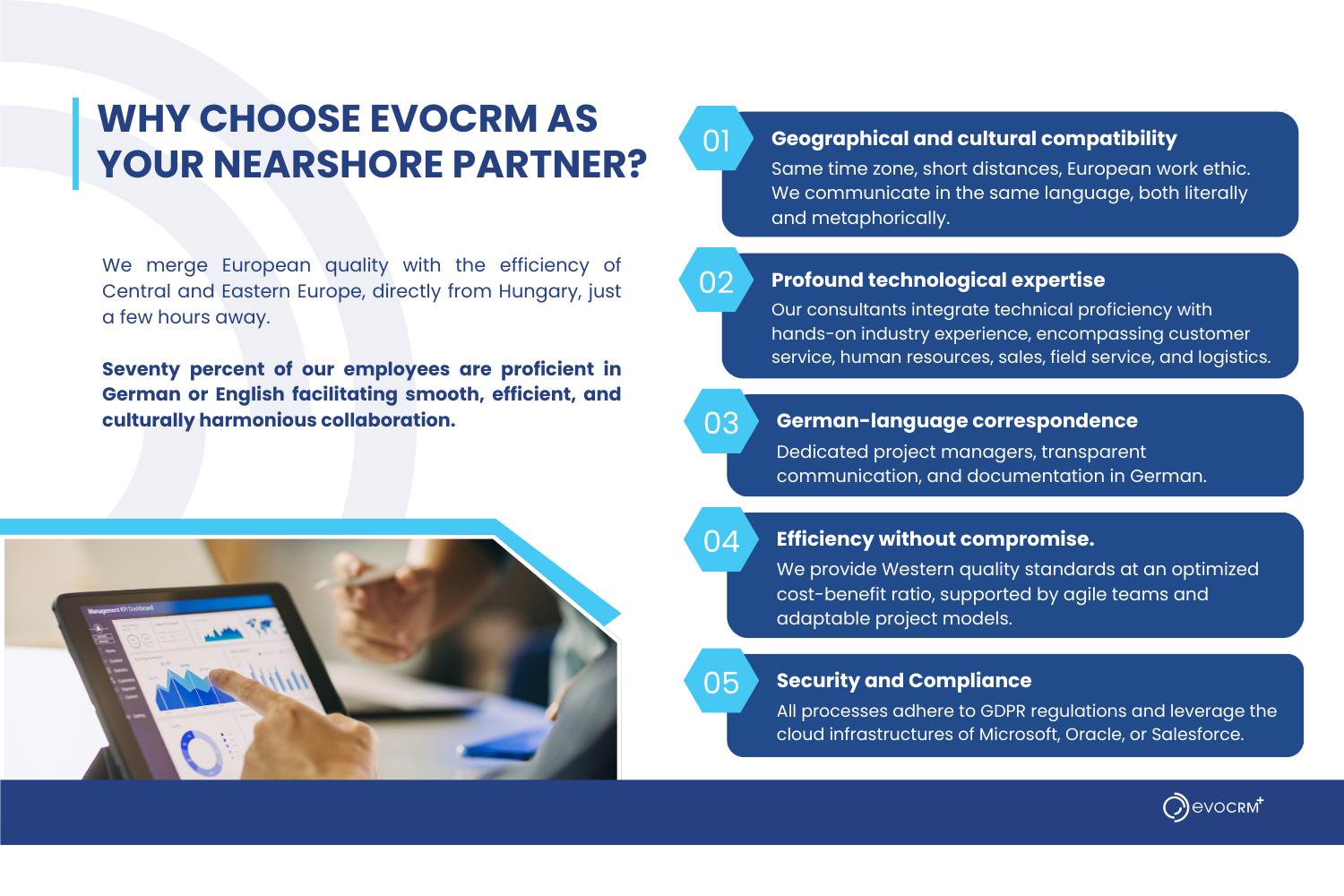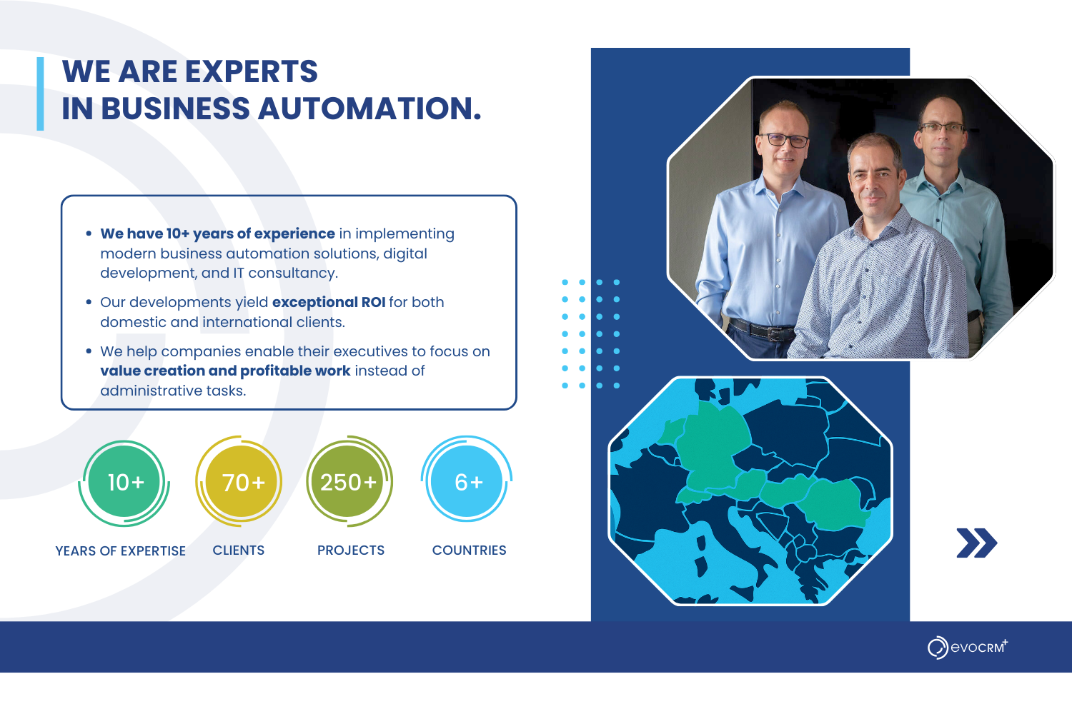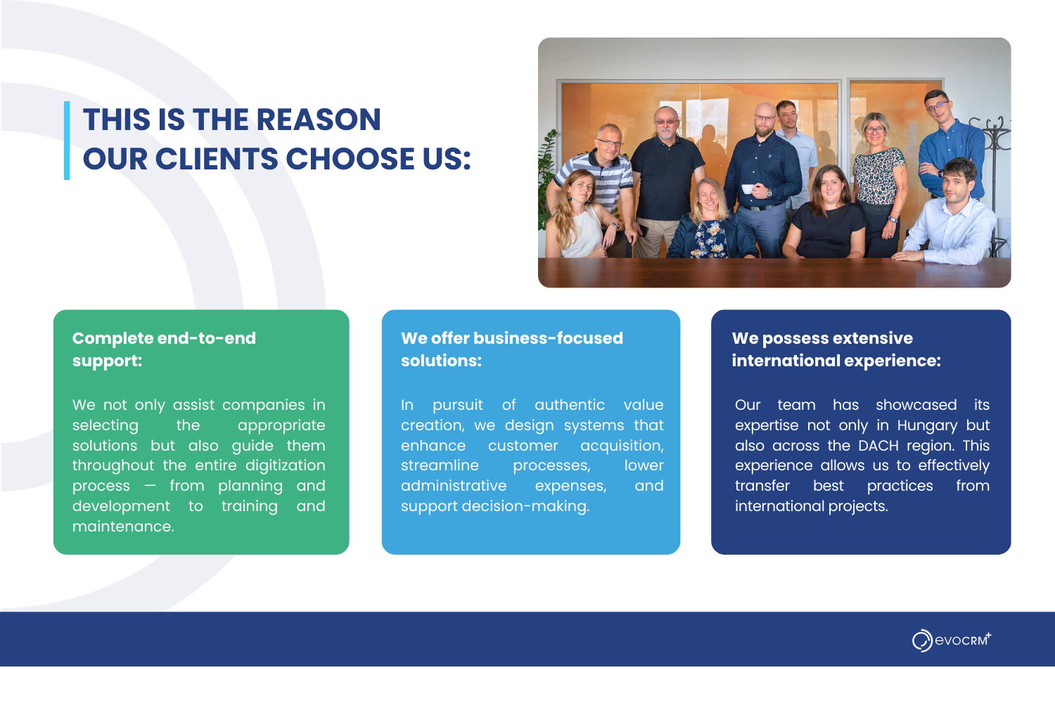 About evoCRM Ltd. evoCRM: experienced Salesforce consulting and development team, supporting both global enterprises and fast-growing local businesses.####Since 2018, we have had a multitude of extremely satisfied customers when working in high trust collaborations on Salesforce based projects.####We have successfully delivered projects not only in Hungary but also across the DACH region (Germany, Austria, Switzerland), the Netherlands, and Romania. With English- and German-speaking experts, we ensure seamless collaboration on international projects.####Our differentiator: we don’t just deliver IT systems—we deliver measurable business outcomes. Faster processes, happier customers, and higher profits.####Our goal is to make our customers more competitive with Salesforce automations (Sales, Service, Marketing, Field Service and Non-profit) tailored to their unique business processes.####We provide digital transformation through implementation, change management, strategic consulting, custom configuration, and managed services. ####Our Salesforce experts hold internationally recognized certifications, guaranteeing both technical quality and business impact.