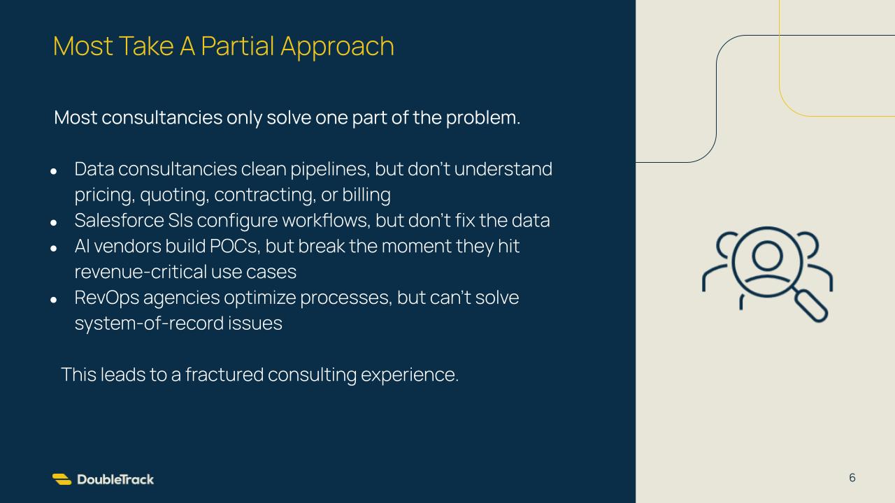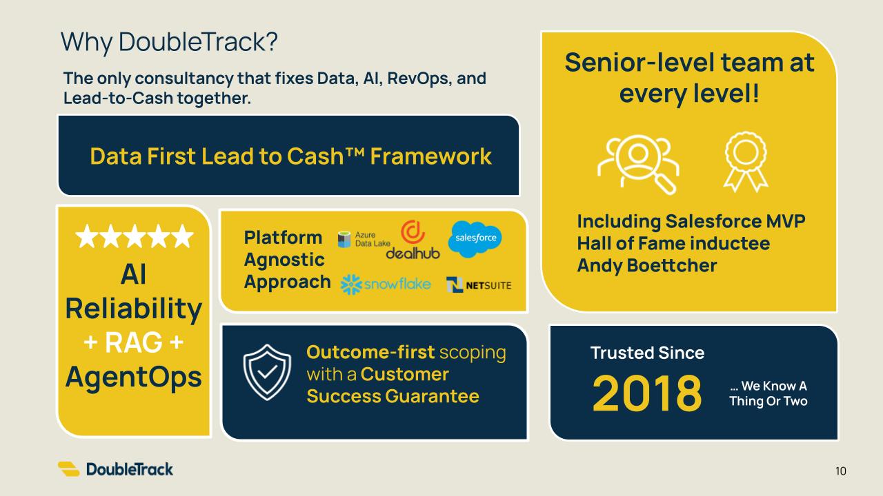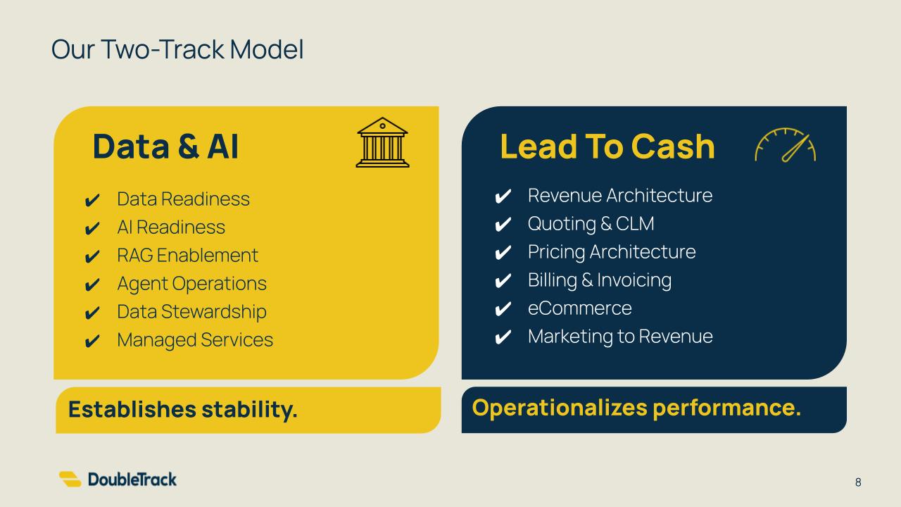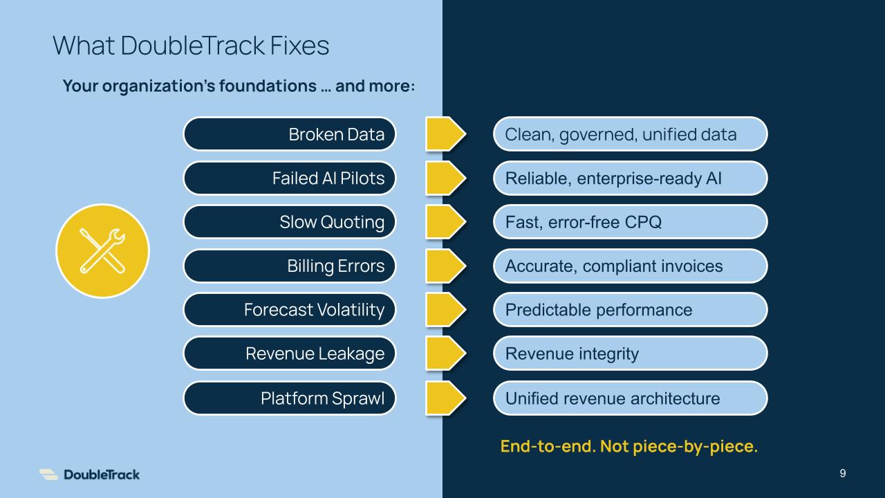About DoubleTrack When data can't be trusted, AI fails and operations fracture.##This shows up in wasted manpower, inaccurate pricing, unreliable forecasts, and much more.####We fix it. Data and AI at the foundation, and through your lead-to-cash systems.