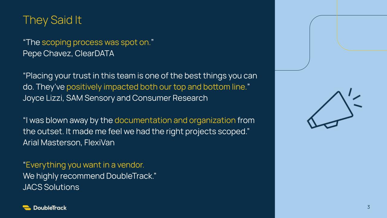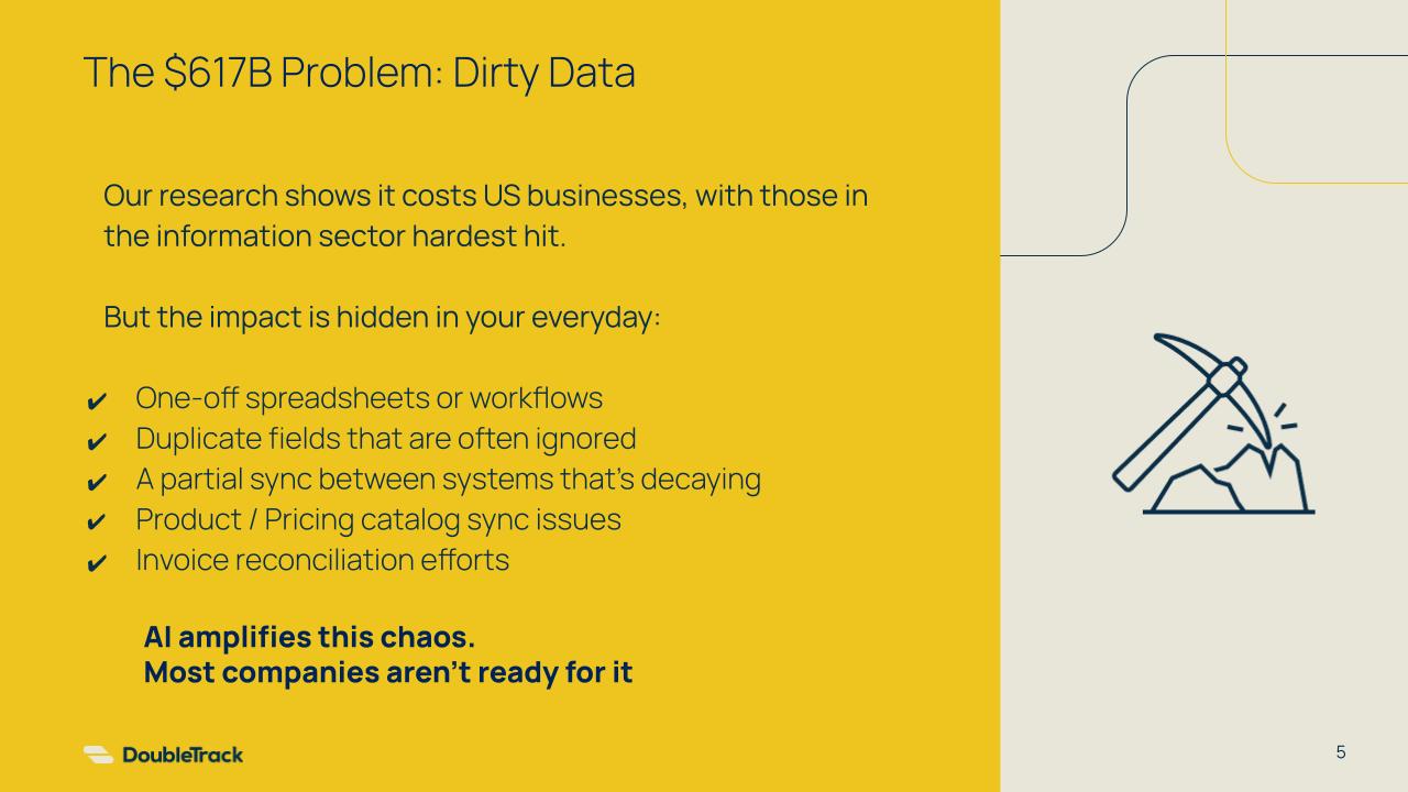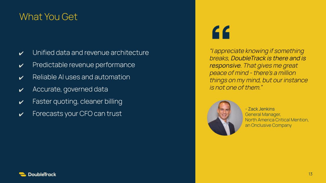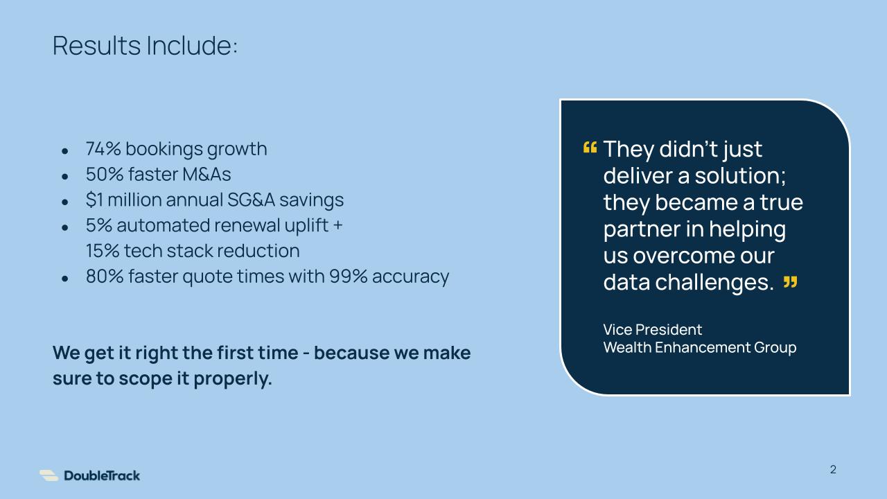About DoubleTrack When data can't be trusted, AI fails and operations fracture.##This shows up in wasted manpower, inaccurate pricing, unreliable forecasts, and much more.####We fix it. Data and AI at the foundation, and through your lead-to-cash systems.