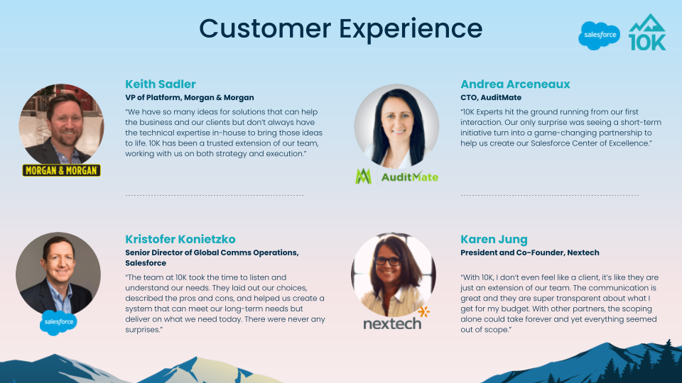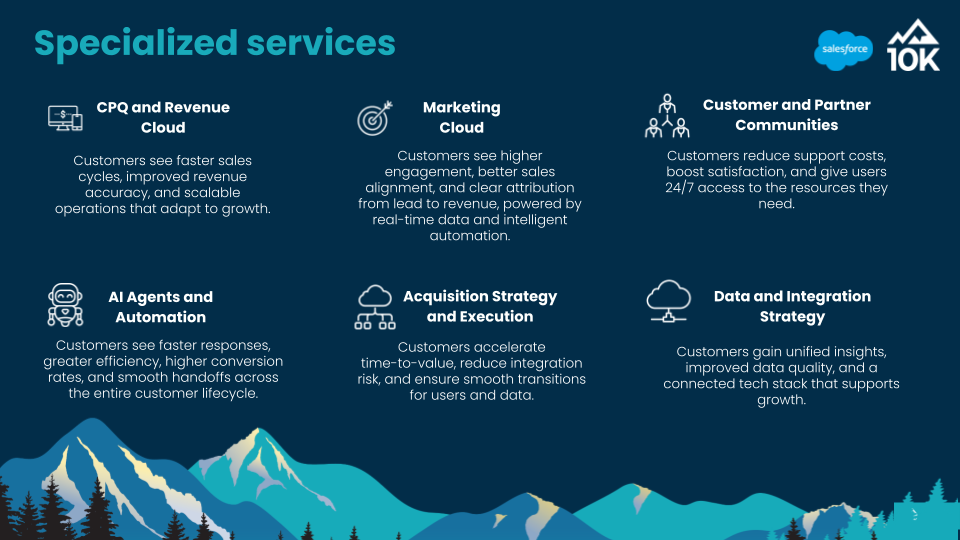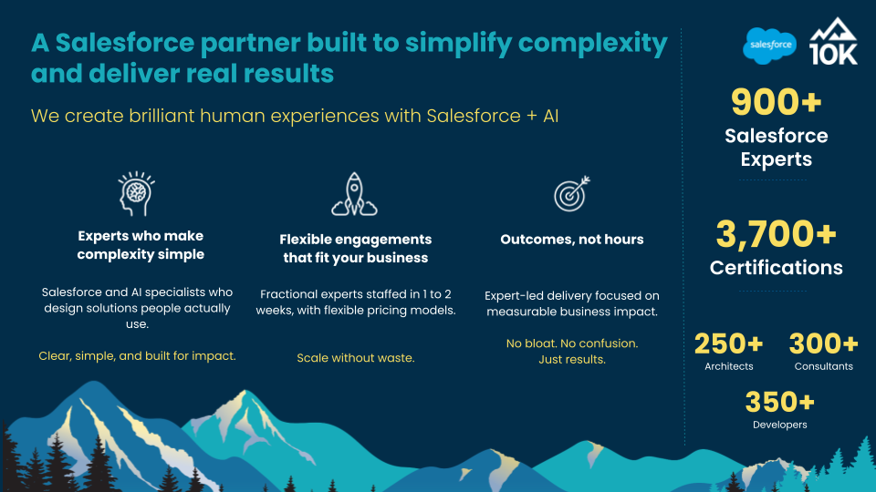 10K makes businesses easier to work with. We help Salesforce customers deploy AI that actually works, accelerating sales, streamlining service, and improving customer experiences. Trusted since 2016, 10K delivers clarity over complexity.