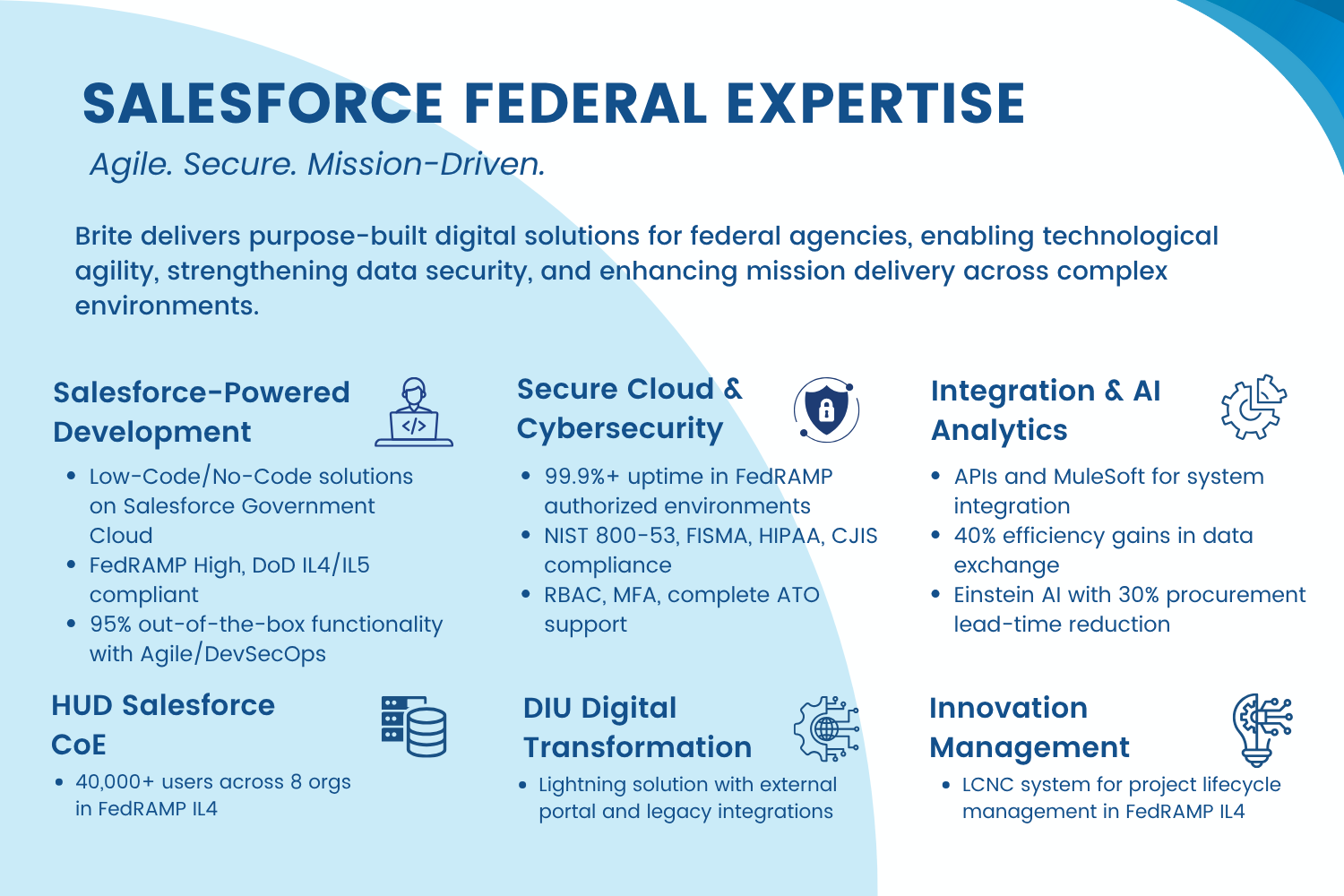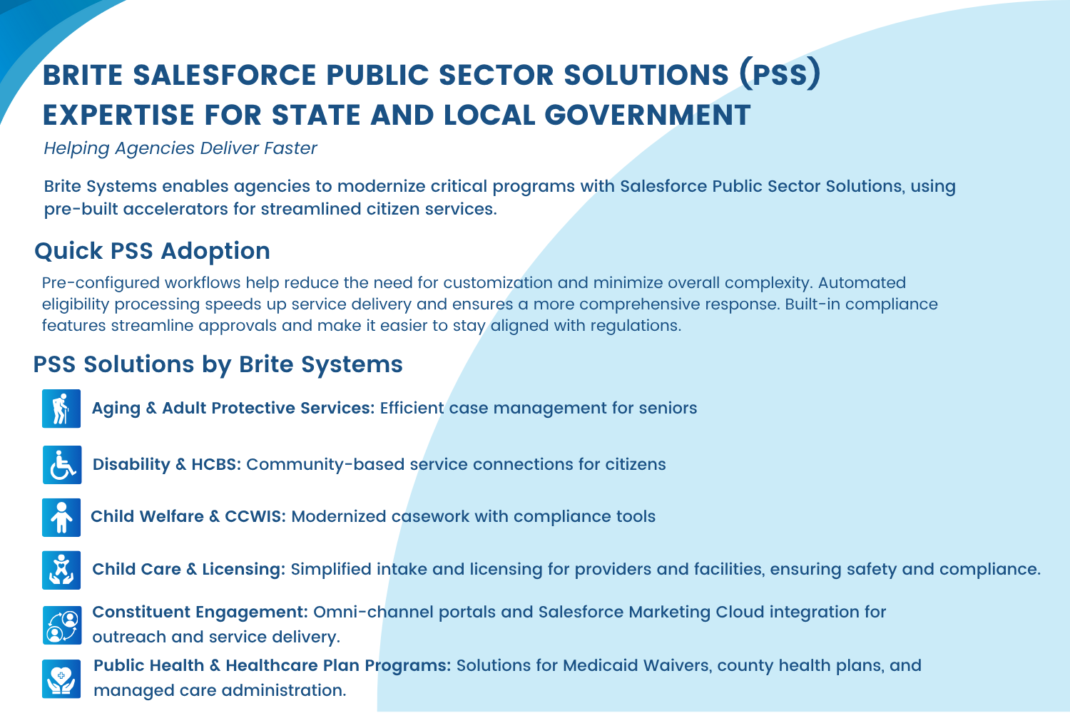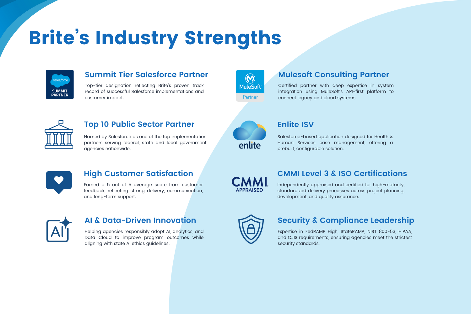 Brite Systems is a trusted Salesforce Summit Consulting Partner empowering public service and nonprofit organizations to deliver better outcomes through digital transformation. With 20 years of experience, Brite combines public sector domain knowledge, user-centered design, and AI-powered Salesforce innovation to create secure, scalable solutions that deliver measurable impact. #### Our approach goes beyond implementation—focusing on long-term adoption, stakeholder alignment, and continuous improvement. From modernizing health and human services systems to integrating grants, licensing, and workforce programs, we help organizations break down silos, simplify operations, and improve citizen engagement. ####Certified in CMMI Level 3 and ISO 9001/20000/27001, and maintaining a 5/5 customer satisfaction score, Brite delivers the stability, trust, and results agencies rely on to serve their communities.
