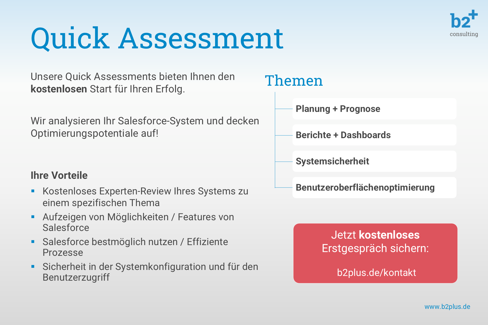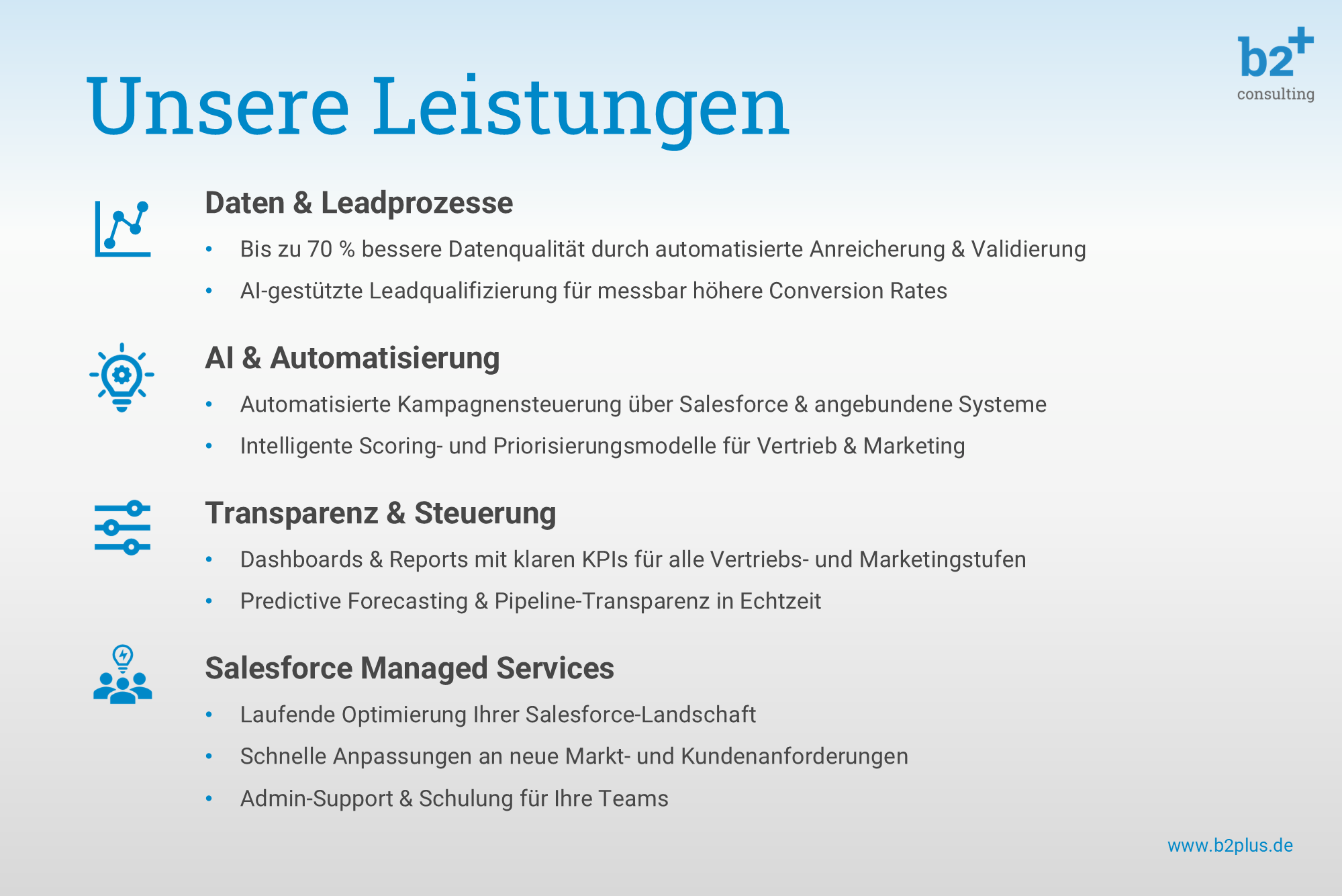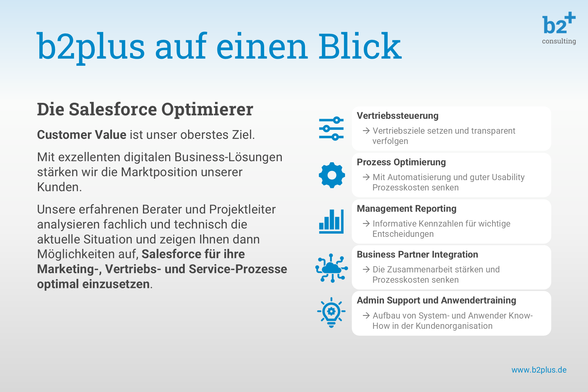 About b2plus Consulting GmbH b2plus Consulting is a German Business- and IT Consulting company, which is specialized in the implementation and optimization of sales and marketing applications based on Salesforce CRM. As specialized technology professionals and trusted industry experts we strive to be the best partner for our customers. Customer Value is our highest goal: with excellent digital business solutions we strengthen the market position of our customers. ##---##b2plus Consulting ist eine deutsche Business- und IT-Beratung, die auf die Implementierung und Optimierung von Vertriebs- und Marketing-Anwendungen auf Basis von Salesforce CRM spezialisiert ist. Als spezialisierte Technologie-Profis und verlässliche Branchenexperten wollen wir die besten Partner für unsere Kunden sein. Customer Value ist unser oberstes Ziel: Mit exzellenten digitalen Business-Lösungen stärken wir die Marktposition unserer Kunden.