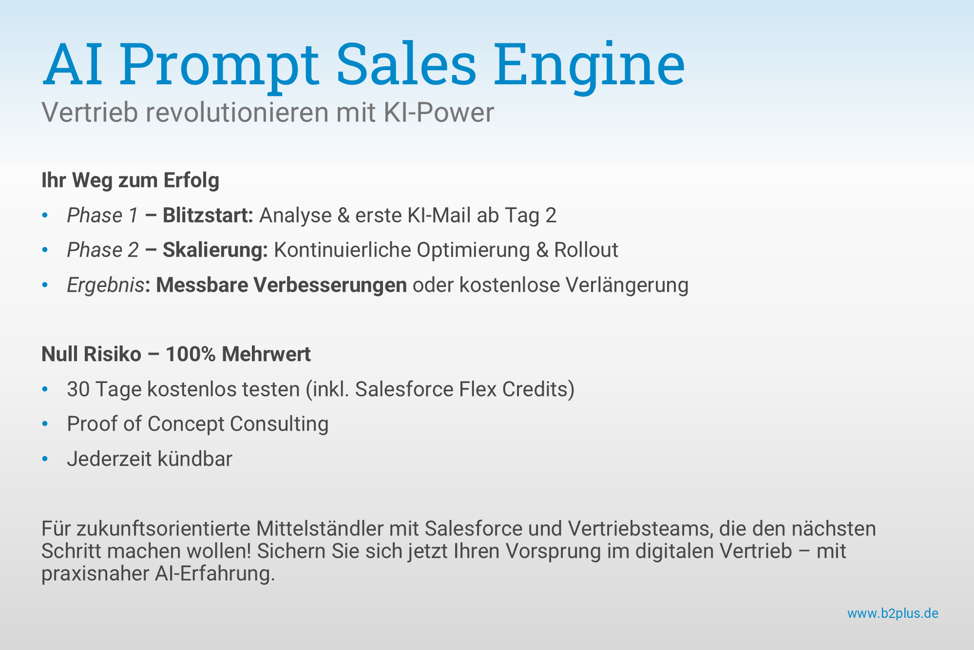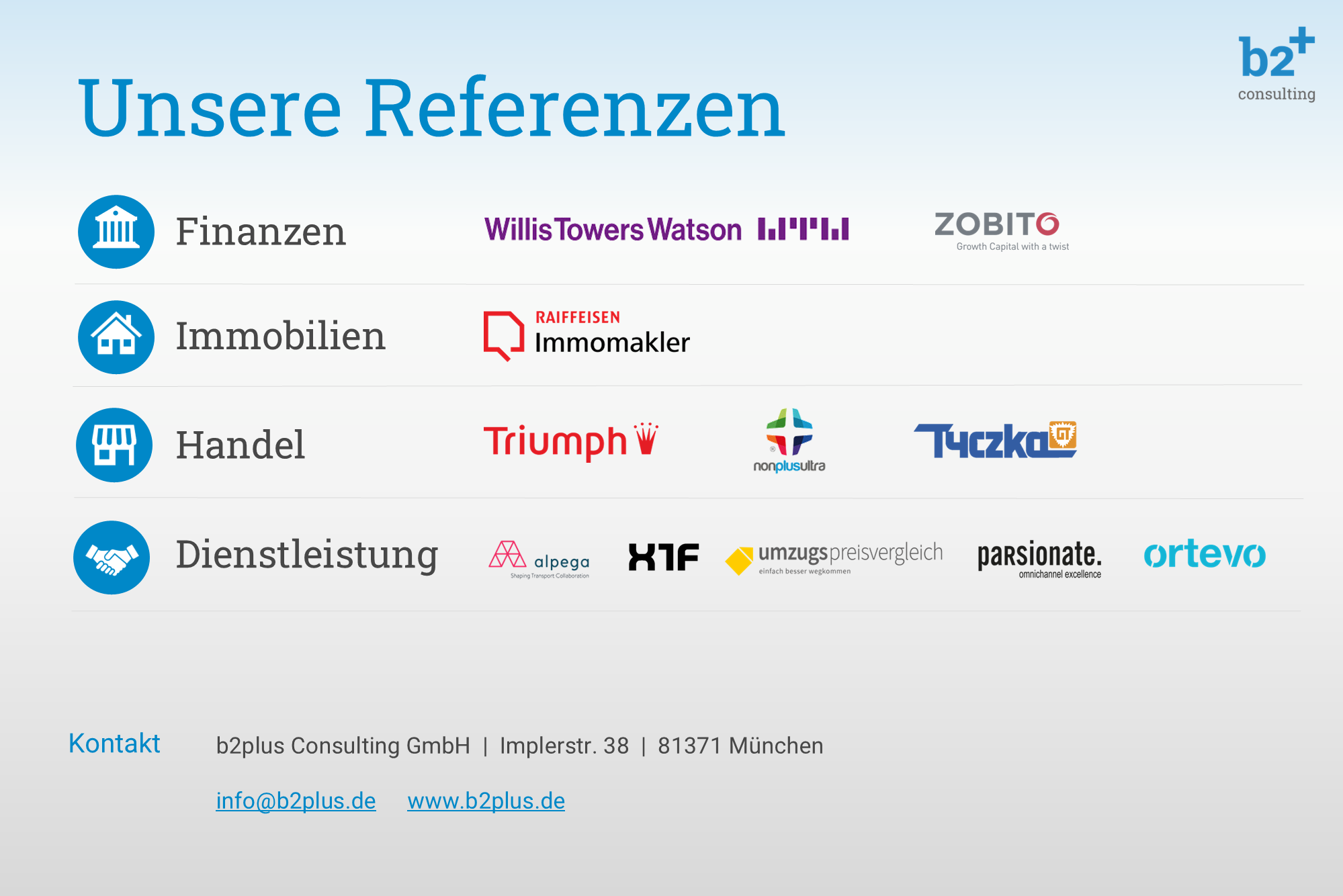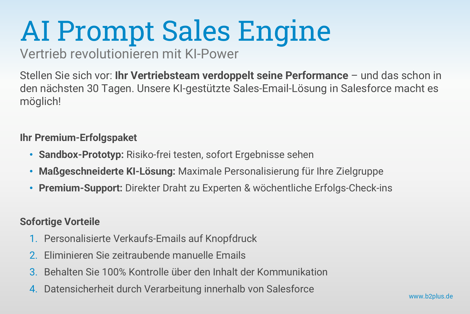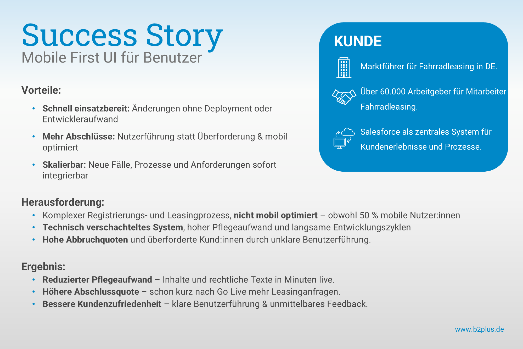 About b2plus Consulting GmbH b2plus Consulting is a German Business- and IT Consulting company, which is specialized in the implementation and optimization of sales and marketing applications based on Salesforce CRM. As specialized technology professionals and trusted industry experts we strive to be the best partner for our customers. Customer Value is our highest goal: with excellent digital business solutions we strengthen the market position of our customers. ##---##b2plus Consulting ist eine deutsche Business- und IT-Beratung, die auf die Implementierung und Optimierung von Vertriebs- und Marketing-Anwendungen auf Basis von Salesforce CRM spezialisiert ist. Als spezialisierte Technologie-Profis und verlässliche Branchenexperten wollen wir die besten Partner für unsere Kunden sein. Customer Value ist unser oberstes Ziel: Mit exzellenten digitalen Business-Lösungen stärken wir die Marktposition unserer Kunden.