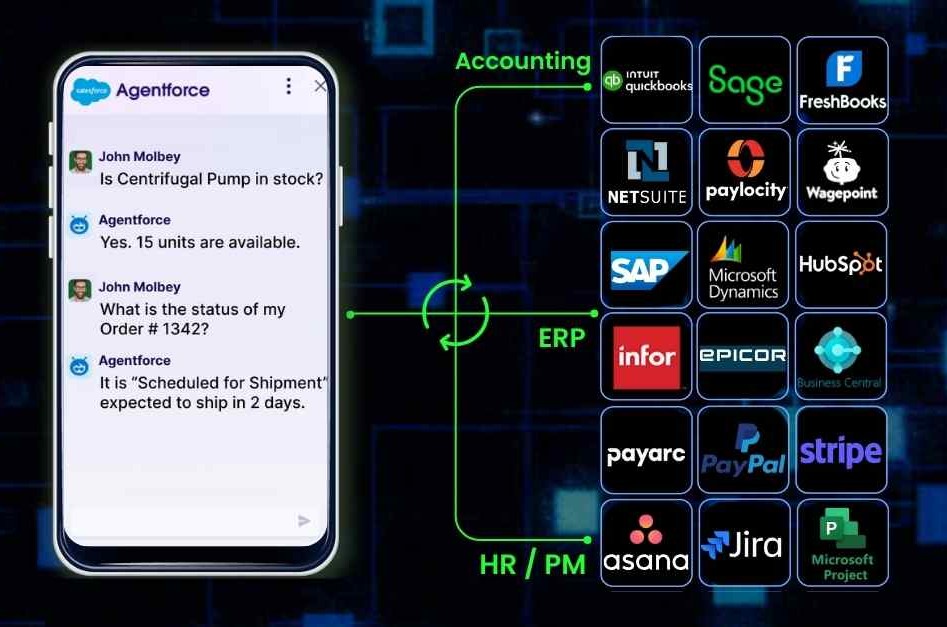 3 ways we help you get more mileage from Salesforce adoption: ##✓ Integration Services & On-Demand pay-as-you-go Advisor access ##✓ SF-native Apps to accelerate digital transformation ##✓ Zero-code Connectivity to extend Agentforce to other systems / ERPs