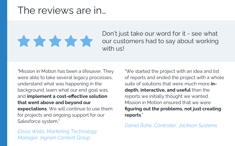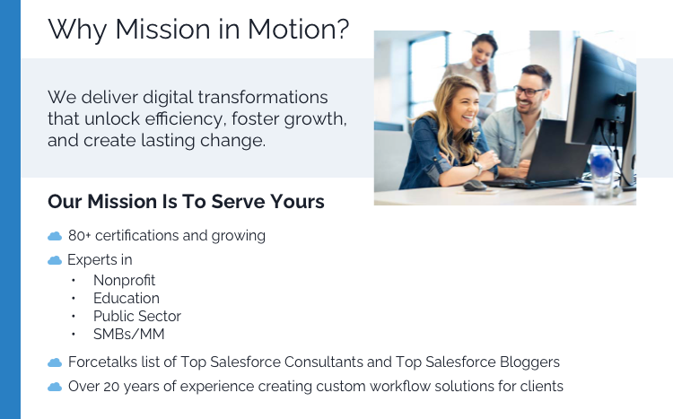 About Mission in Motion Mission in Motion is a certified Salesforce partner dedicated to delivering digital transformations that unlock efficiency, foster growth, and create lasting change. Since 2003, we have worked with hundreds of clients to provide digital transformations that bridge the gap between existing technologies, eliminate tedious time-wasting tasks, and allow access to important information – anytime, anywhere.####The digital transformation process starts with a full workflow analysis, continues seamlessly through rigorous project management, and finishes with a clean, easy-to-use solution customized to your business demands.####Though our experience includes a broad range of industries and solutions, we specialize in Salesforce, Web Applications, and Claris FileMaker. Your Salesforce is your business. Making it work better is ours.####Learn more at missioninmotion.com.