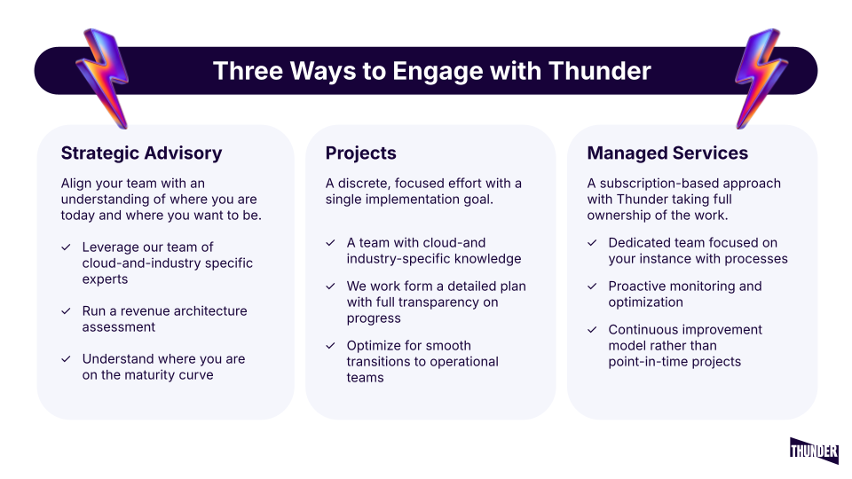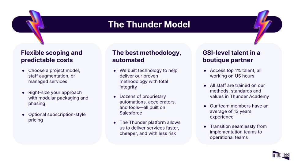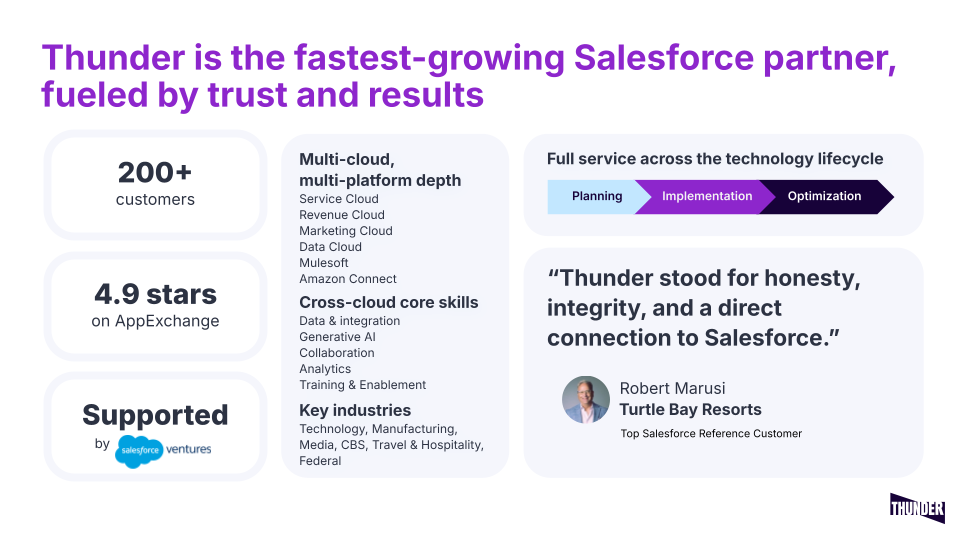 About Thunder Built with Salesforce. Backed by Salesforce. Trusted by Leaders. We help companies leverage Salesforce as strategic infrastructure. Our founder, Carter Wigell, one of the first 100 employees at Salesforce, has assembled an industry-leading team of experts who understand that getting Salesforce right is a continuous investment in competitive advantage and companywide performance. Thunder is backed by Salesforce Ventures, with three rounds of investment. We've grown rapidly by remaining committed to partnering with companies and achieving the outcomes that genuinely make a difference. Get Salesforce right. Now, and forever.