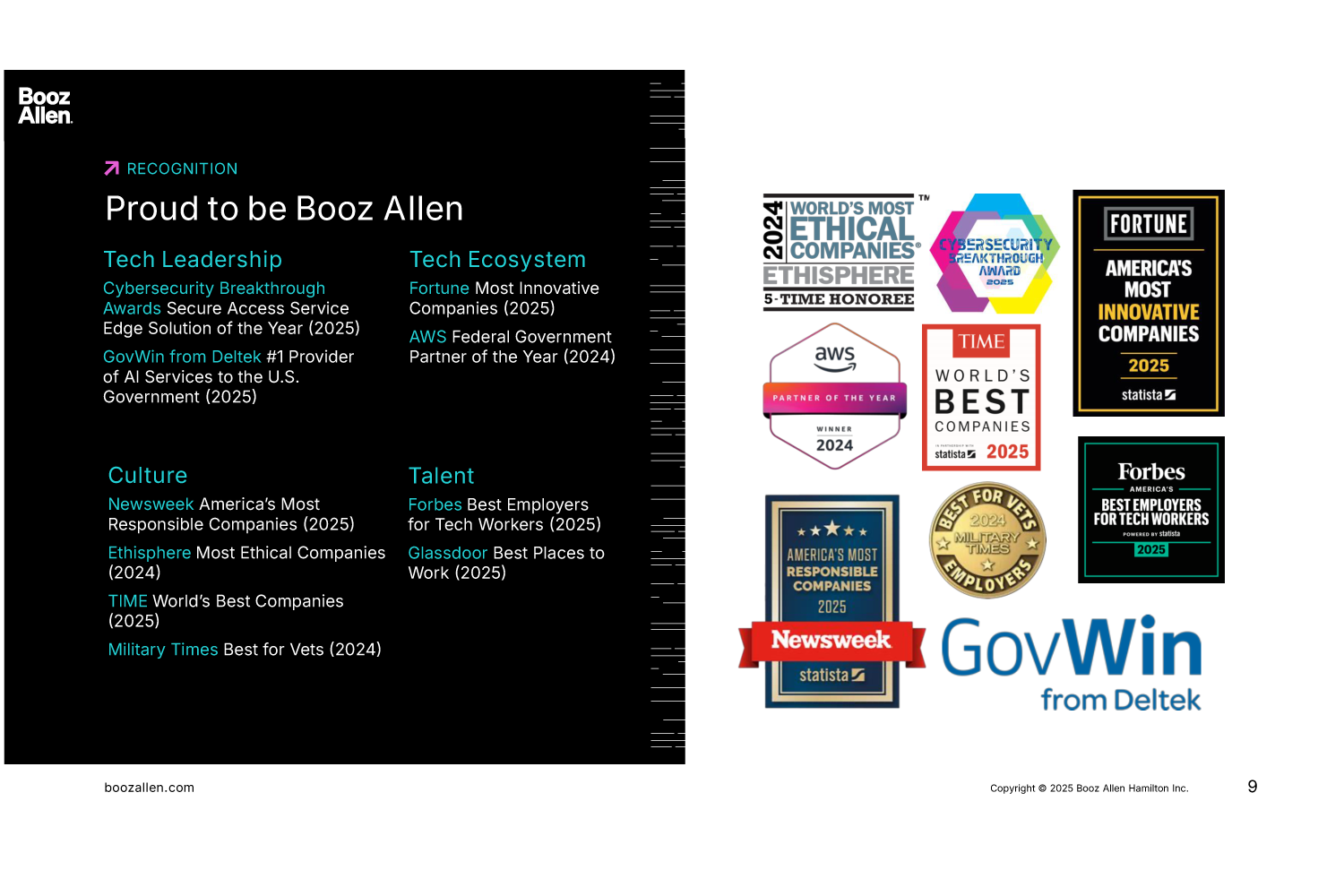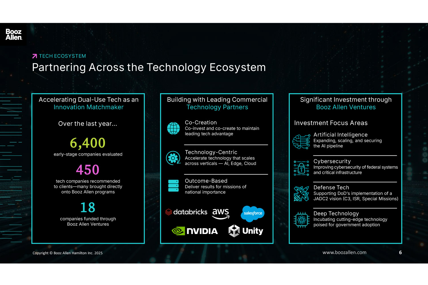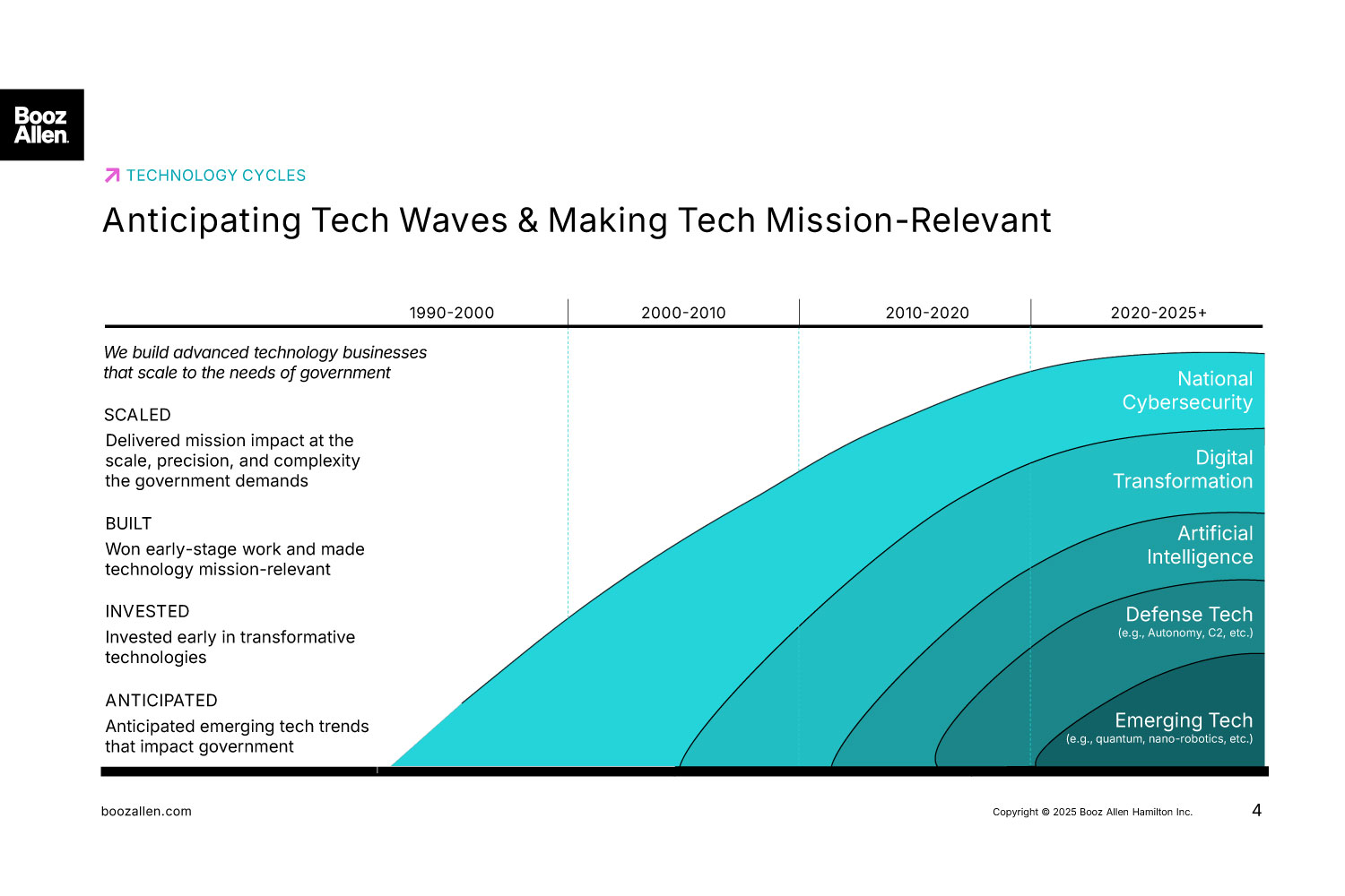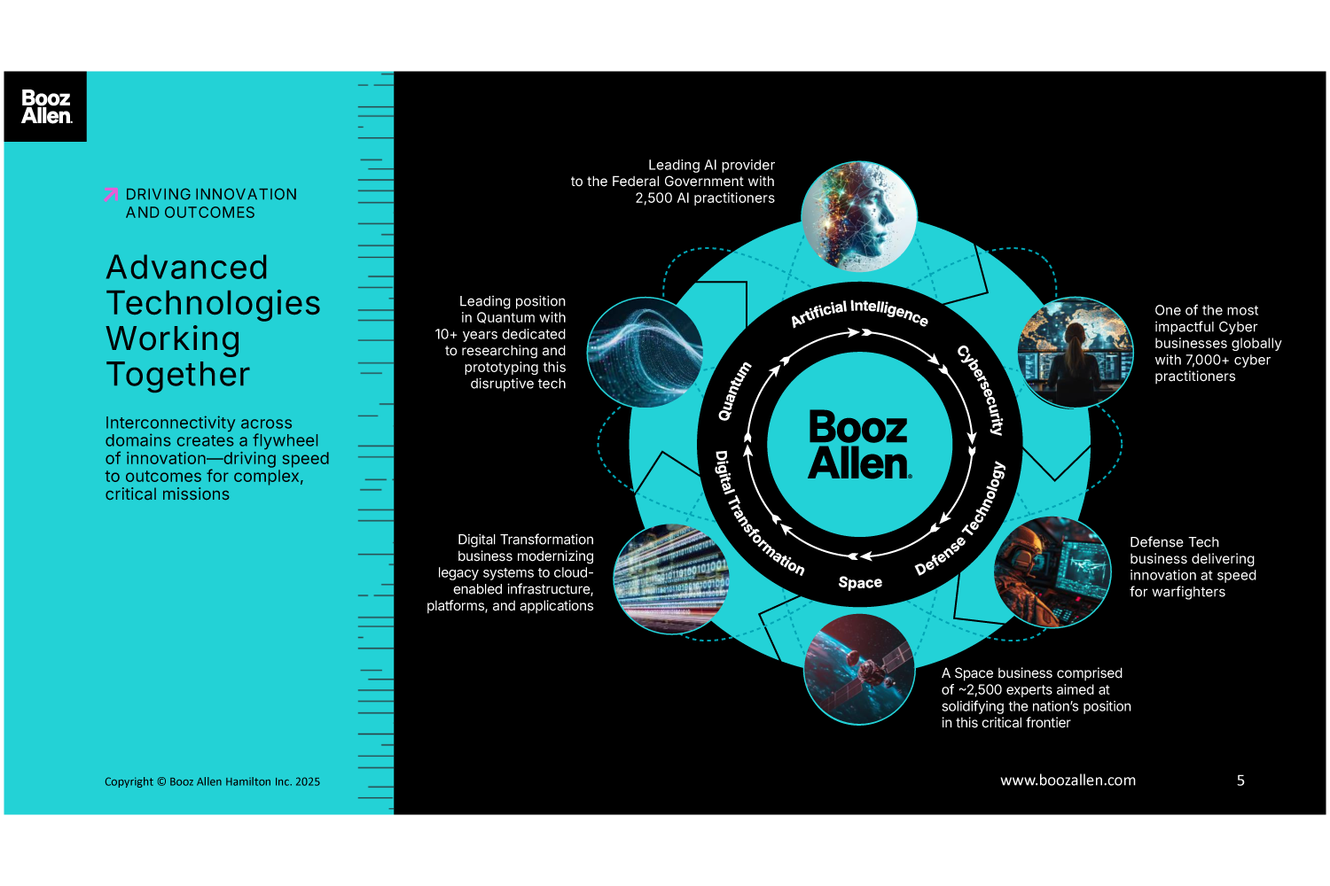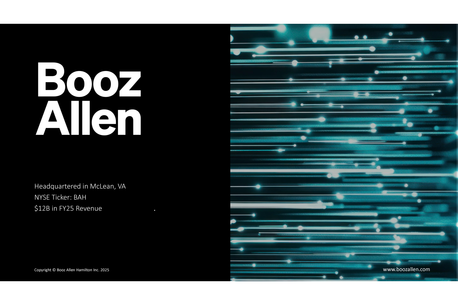 About Booz Allen Hamilton, Inc. Booz Allen is the advanced technology company delivering outcomes with speed for America’s most critical defense, civil, and national security priorities. We build technology solutions using AI, cyber, and other cutting-edge technologies to advance and protect the nation and its citizens. By focusing on outcomes, we enable our people, customers, and their missions to succeed—accelerating the nation to realize our purpose: Empower People to Change the World®.####With global headquarters in McLean, Virginia, our firm employs approximately 32,500 people globally as of September 30, 2025, and had revenue of $12.0 billion for the 12 months ended March 31, 2025. To learn more, visit www.boozallen.com. (NYSE: BAH)