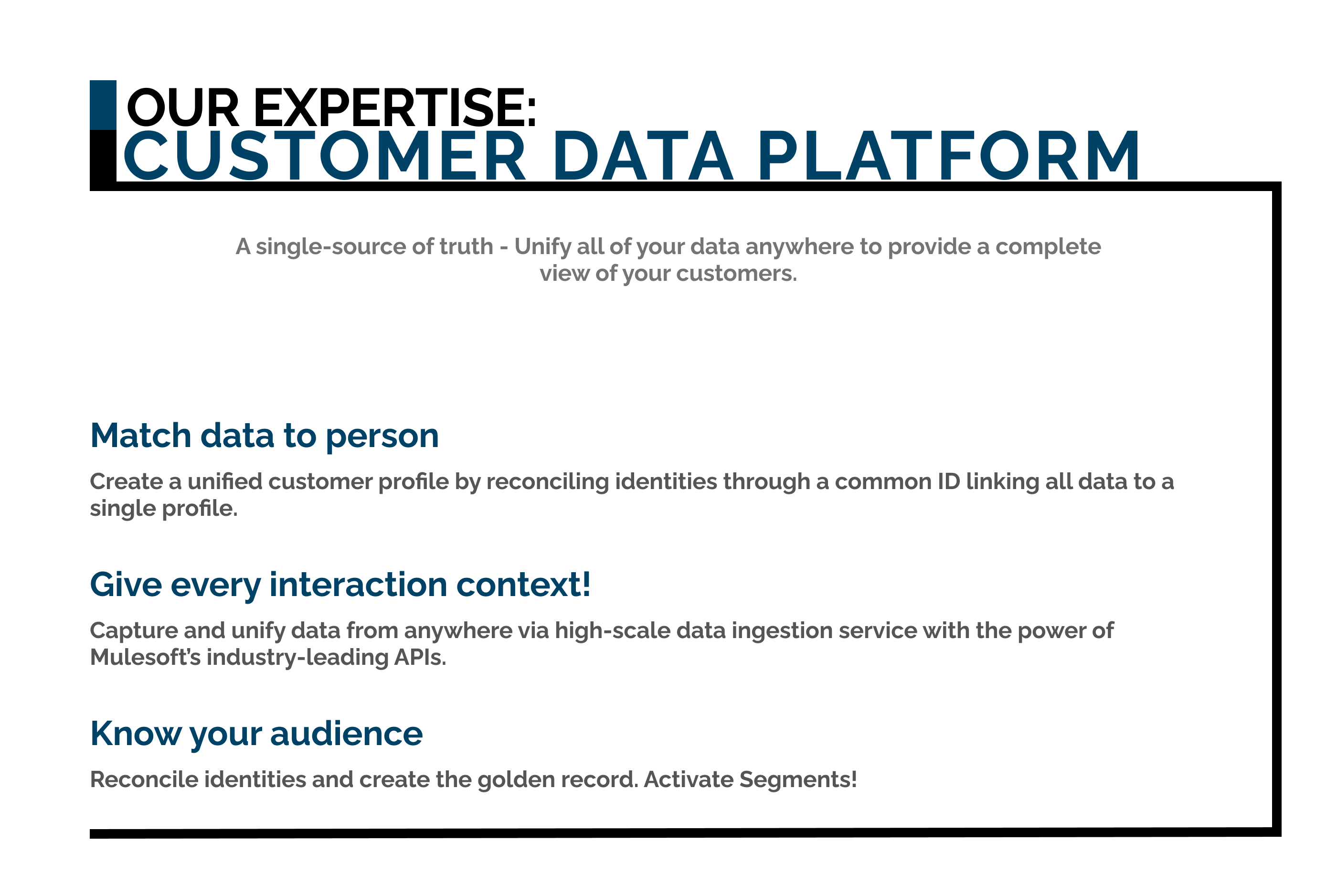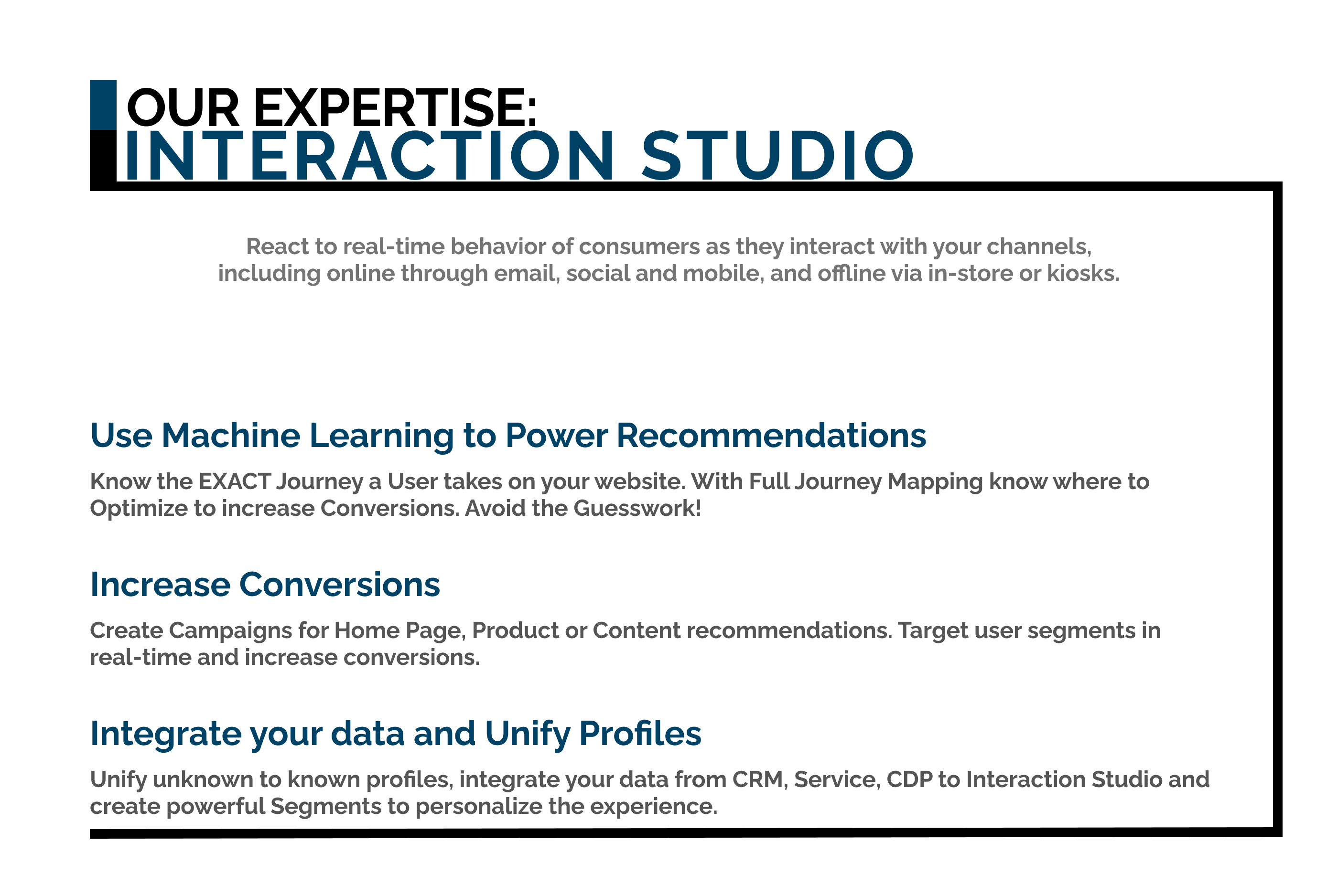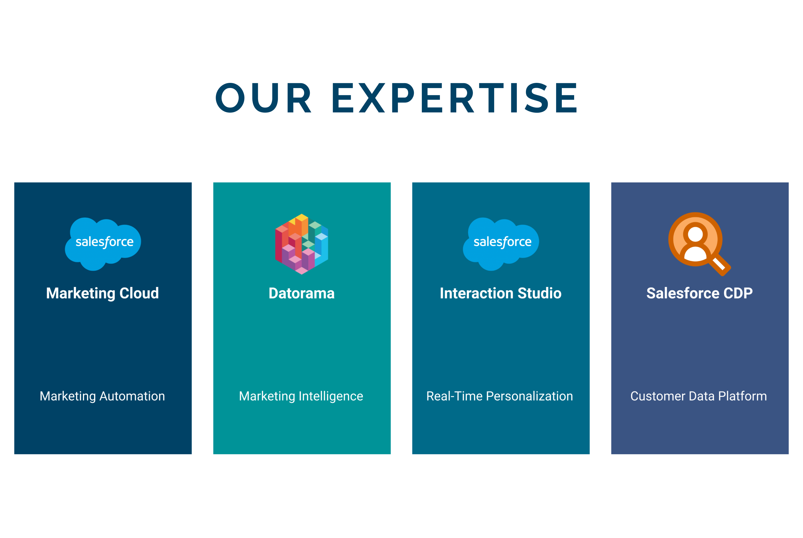 Full-stack Marketing Cloud Implementation Partner covering Email Studio, Interaction Studio, Datorama and CDP. Strong experience in API and Integrations.