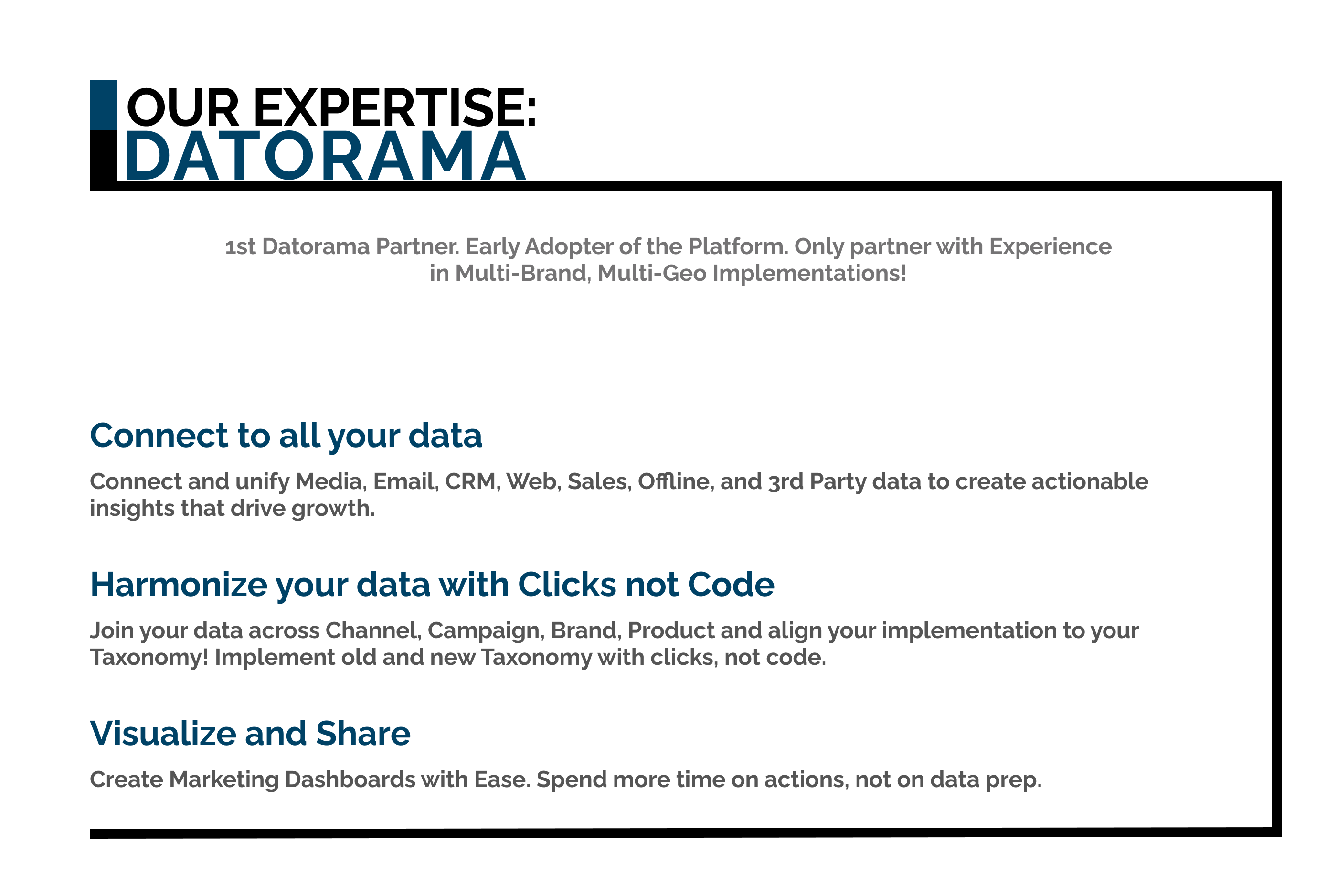 1st Partner of Datorama. Most Implementations and most complex implementations in the partner ecosystem. Only partner with experience with Multi-Geo, Multi-Brand Implementations.