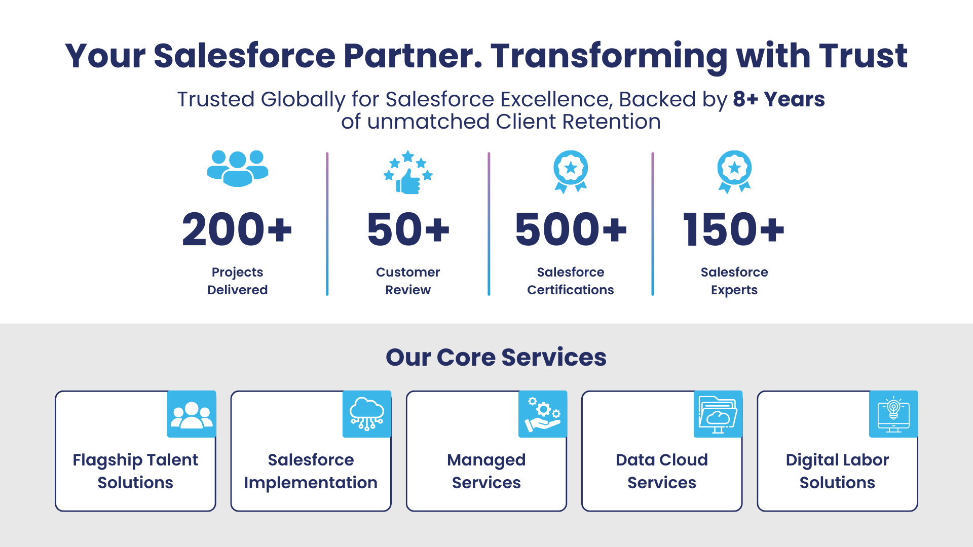About mindZvue At mindZvue, innovation intersects passion through unparalleled expertise to deliver excellence. As a seasoned Salesforce Summit Partner with over 9+ years of experience, we serve diverse clients across industries, transforming bold ideas into impactful real-world solutions. Salesforce, the world’s #1 CRM, bridges gaps for enterprises of all sizes, and as a certified Summit Partner, we simplify and evolve these solutions to maximize client outcomes.####Technology is multifaceted—some prioritize CRM workflows, others ROI, and many focus on AI-driven customer experiences. Recognizing every business’s unique needs, our certified experts craft tailored strategies, partnering with organizations across the USA and India to unlock Salesforce’s full potential. Our footprint spans industries like eCommerce, Fortune 500 high-tech brands, financial institutions, and nonprofits such as The Mission Continues.####In an era of AI-driven transformation, mindZvue stays ahead with services like Data Cloud and Agentforce, complementing our core offerings in Implementation and Managed Services. We’re reshaping sectors like Manufacturing, Healthcare, and Nonprofits through continuous innovation.