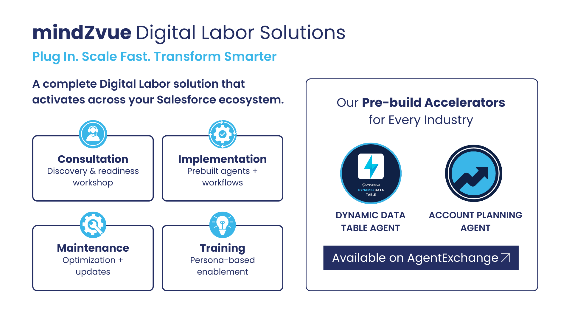 mindZvue helps teams accelerate growth using Agentforce Sales, Agentforce Service, and Data 360—delivering faster go-lives, higher productivity, and measurable ROI.