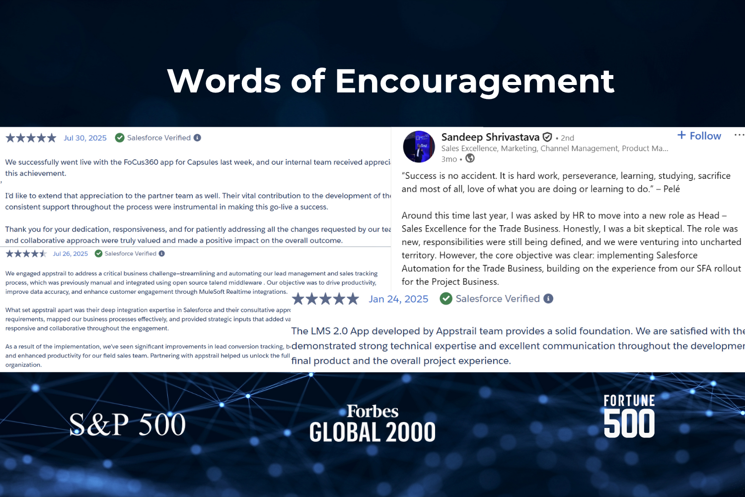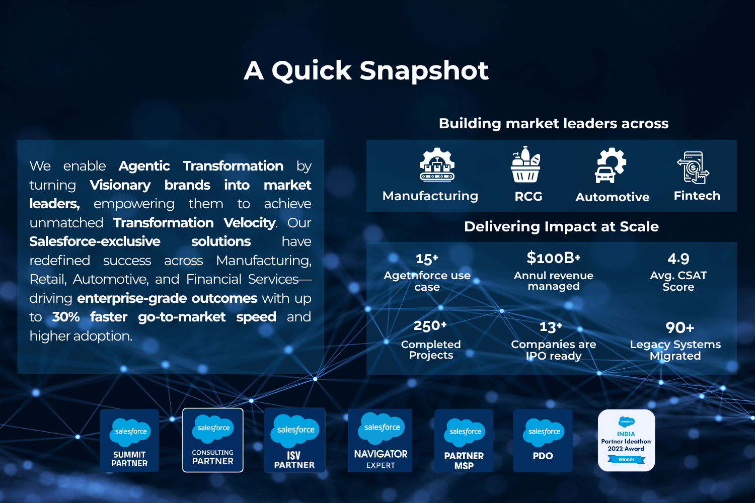 About Appstrail Technology Appstrail began in mid-2020 as a small team of five agile problem-solvers with a bold vision: to accelerate industry digital transformation (AIDT) while surpassing industry-best timelines.####Today, we are a powerhouse of 130+ industry experts, delivering innovative and tailored solutions to over 100 customers across key sectors such as manufacturing, retail and consumer goods (RCG), financial services, and automotive.####We specialize in solving industries' toughest challenges by developing and deploying cutting-edge industry solutions built on Salesforce. As a Summit Salesforce-focused consulting and services firm, our expertise spans implementing and reengineering Salesforce clouds—including Industries, Marketing, Data Cloud, Commerce, MuleSoft, Tableau, and Agentforce.####With our headquarters in Mumbai and a Center of Excellence in Bangalore, Appstrail is grounded in collaboration, innovation, and a relentless focus on client success. From ideation to execution, we craft seamless solutions that align with your goals and drive business growth.####Appstrail is also recognized as an official Salesforce Agentforce Implementation Partner.