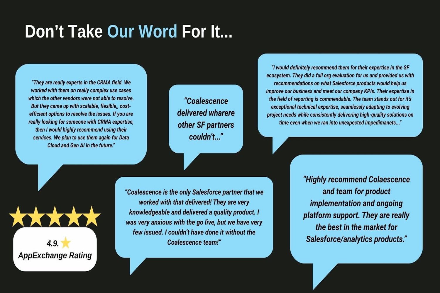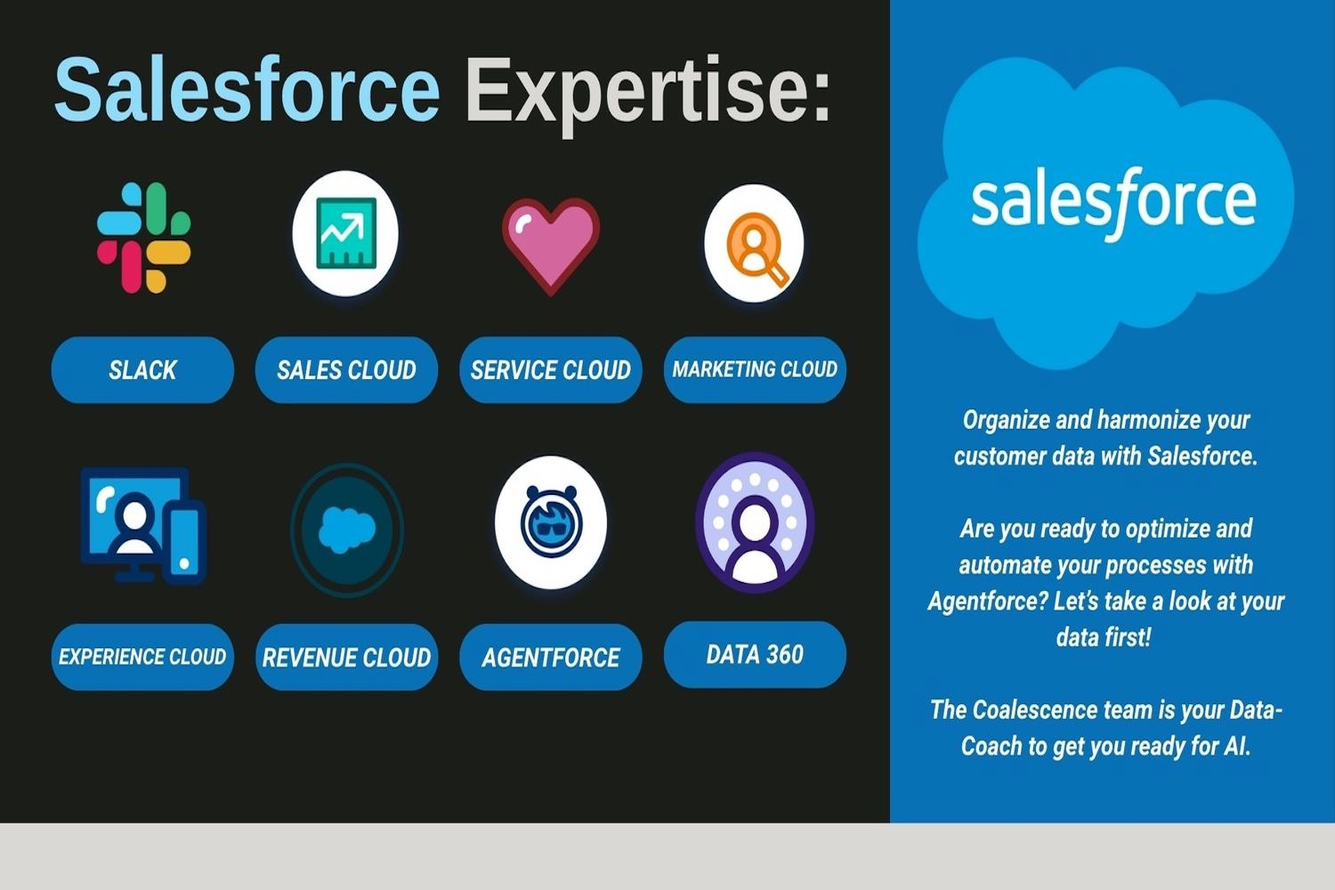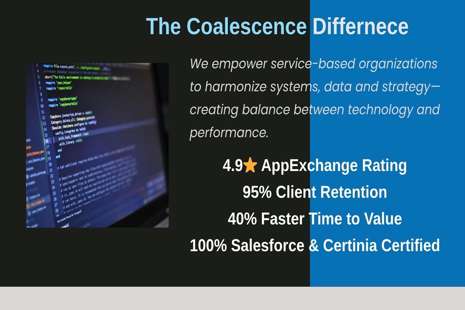 About Coalescence Cloud Consulting A trusted Salesforce SI partner that drives the growth of your business by providing a tailored expert approach to navigate complexities and identify pain points for successful digital transformation. ########We are B2B Digital Transformation Experts in Salesforce Platform Implementations & Managed Services - All Salesforce Clouds + Certinia (formerly known as FinancialForce), Flosum, Formstack and other ISV solutions.