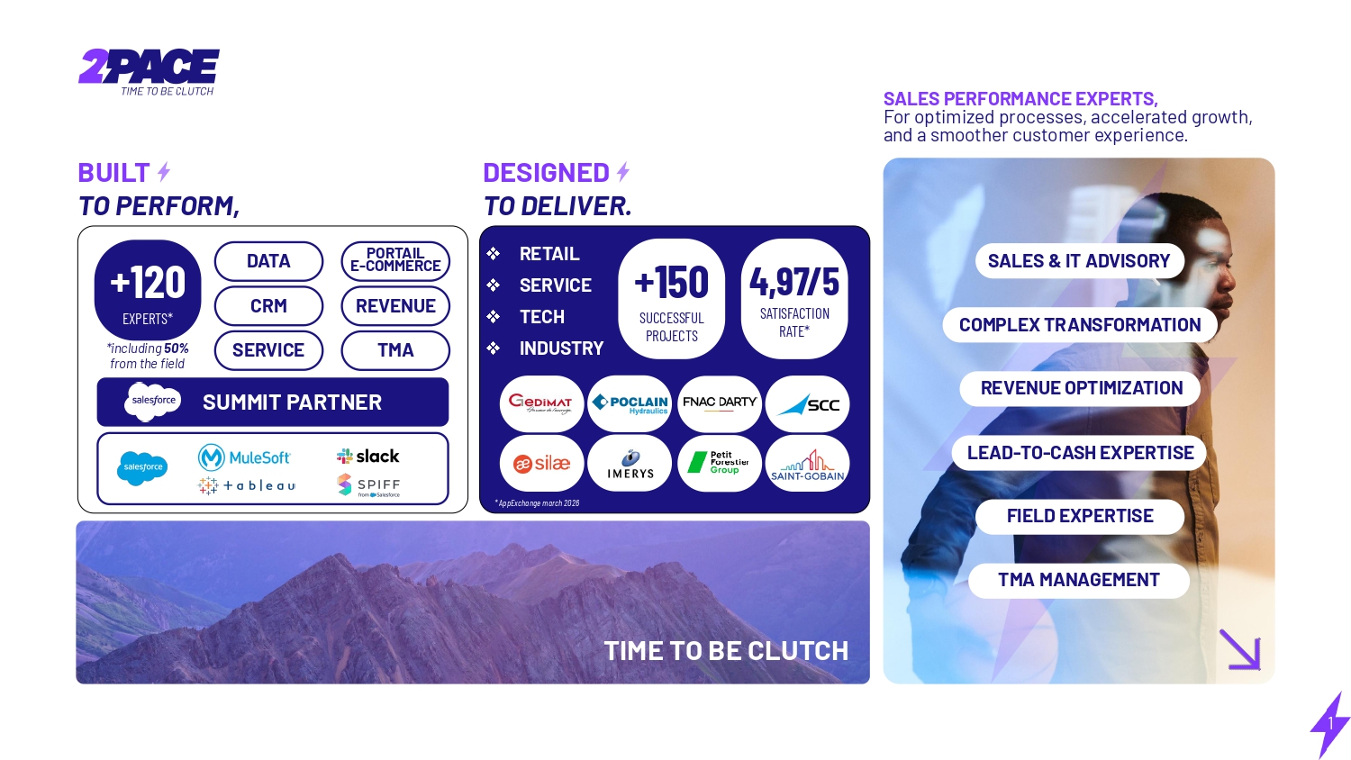 About 2PACE 2PACE is the first French consulting firm to specialize in Salesforce Revenue Cloud (CPQ & Billing) and holds Salesforce's Summit Partner status. With a human-centric approach to addressing the challenges of an ever-evolving world, we transform every interaction into a lasting and engaging partnership through our expertise and innovation. ##SO, IT'S TIME! TIME TO BE CLUTCH####Our philosophy is rooted in a core belief: success is built together. We don’t move forward as mere consultants but as true teammates, sharing in our clients’ challenges and triumphs. By joining forces, we aim not just to meet goals but to exceed them. ####TOMORROW IS OUR PLAYGROUND##Every project is approached with a forward-thinking vision. Anticipating tomorrow’s needs and building robust solutions today is our promise. Because the future is a playground that demands preparation, determination, and boldness.