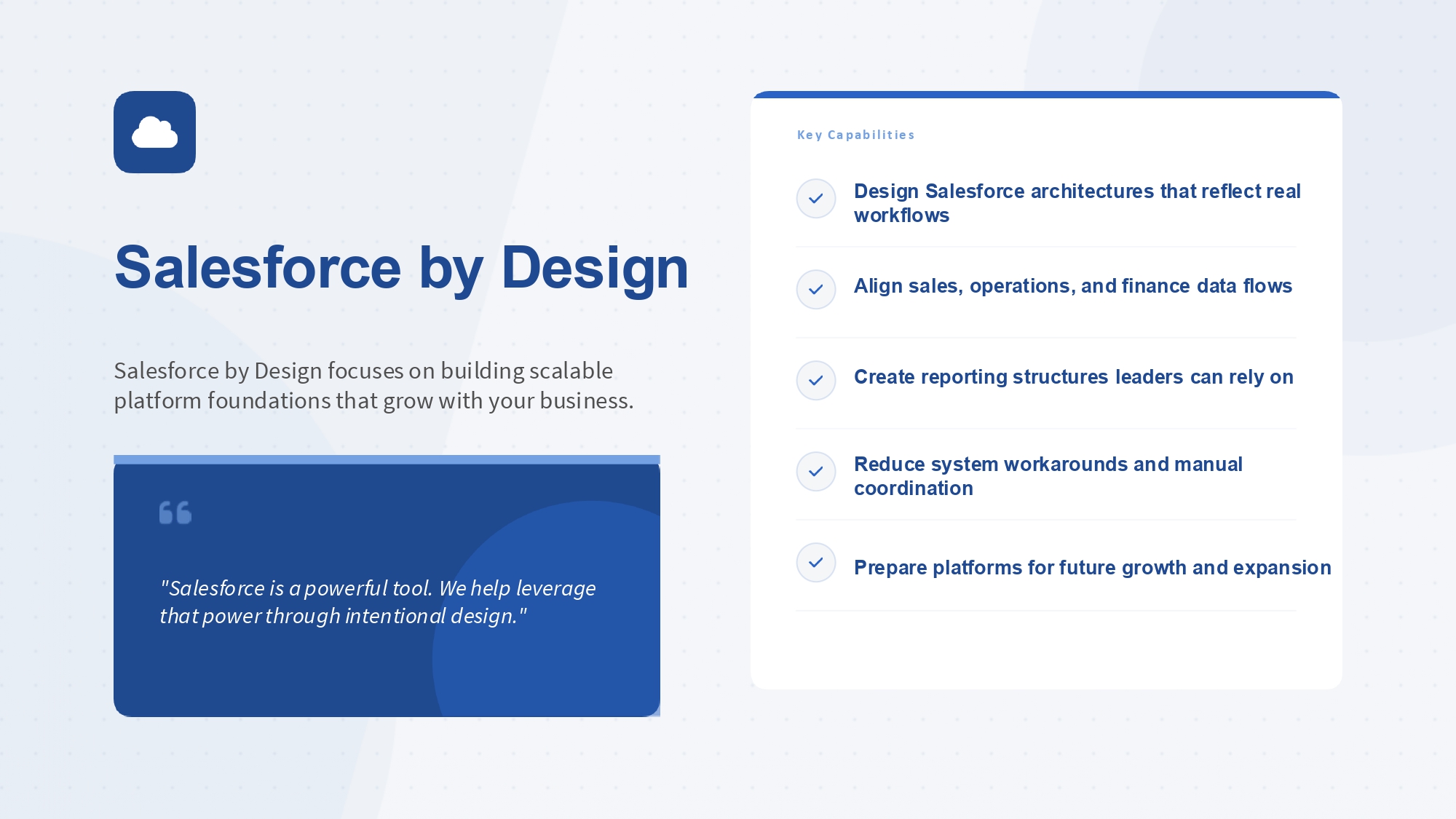 We help businesses maximize their Salesforce ROI through smart automation, clean system design, and seamless implementation. We simplify complex processes, reduce tool overload, and deliver powerful