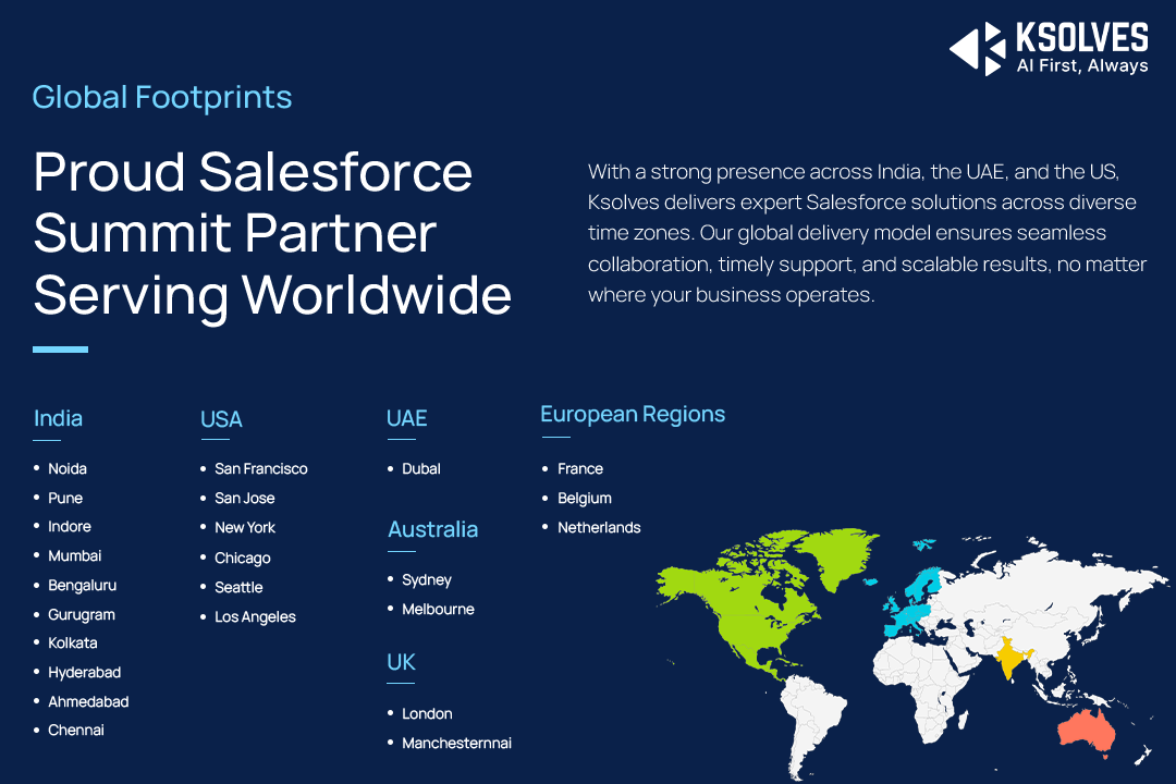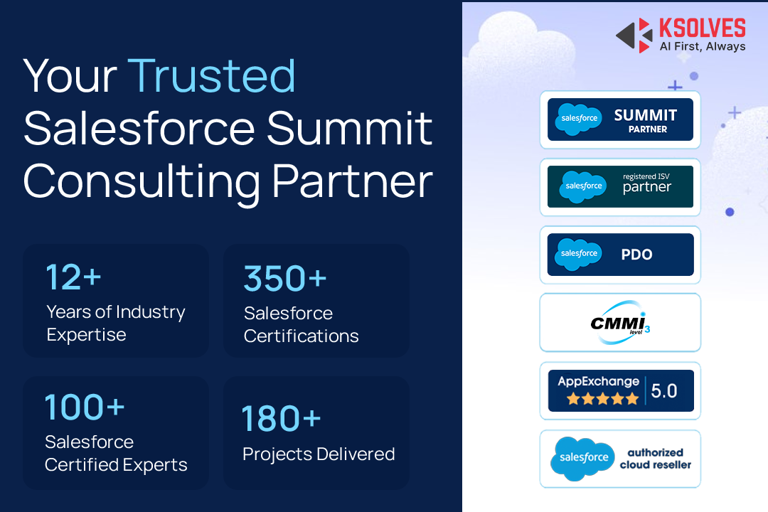About Ksolves India Limited As a trusted Salesforce Summit (Platinum) Partner, Ksolves India Limited is a publicly listed company on both the NSE and BSE, known for its global presence and consistent delivery of high-quality technology solutions. With operations across India, the US, and the UAE, we are backed by a team of 550+ in-house technology experts.####We take pride in our 100+ Salesforce-certified professionals who hold over 300 certifications, bringing deep expertise and a commitment to excellence across every engagement. Our end-to-end Salesforce services, including consulting, customization, integration, and ongoing support, are delivered under one roof.####With 12+ years of industry experience, we serve businesses of all sizes, from startups to large enterprises, delivering tailored solutions that align with their goals and drive sustainable growth.