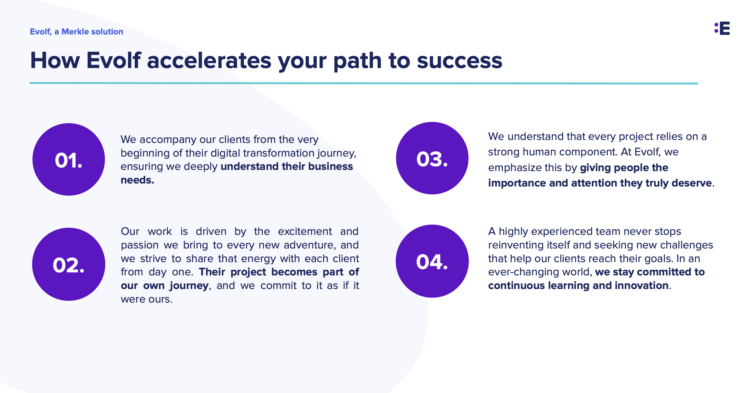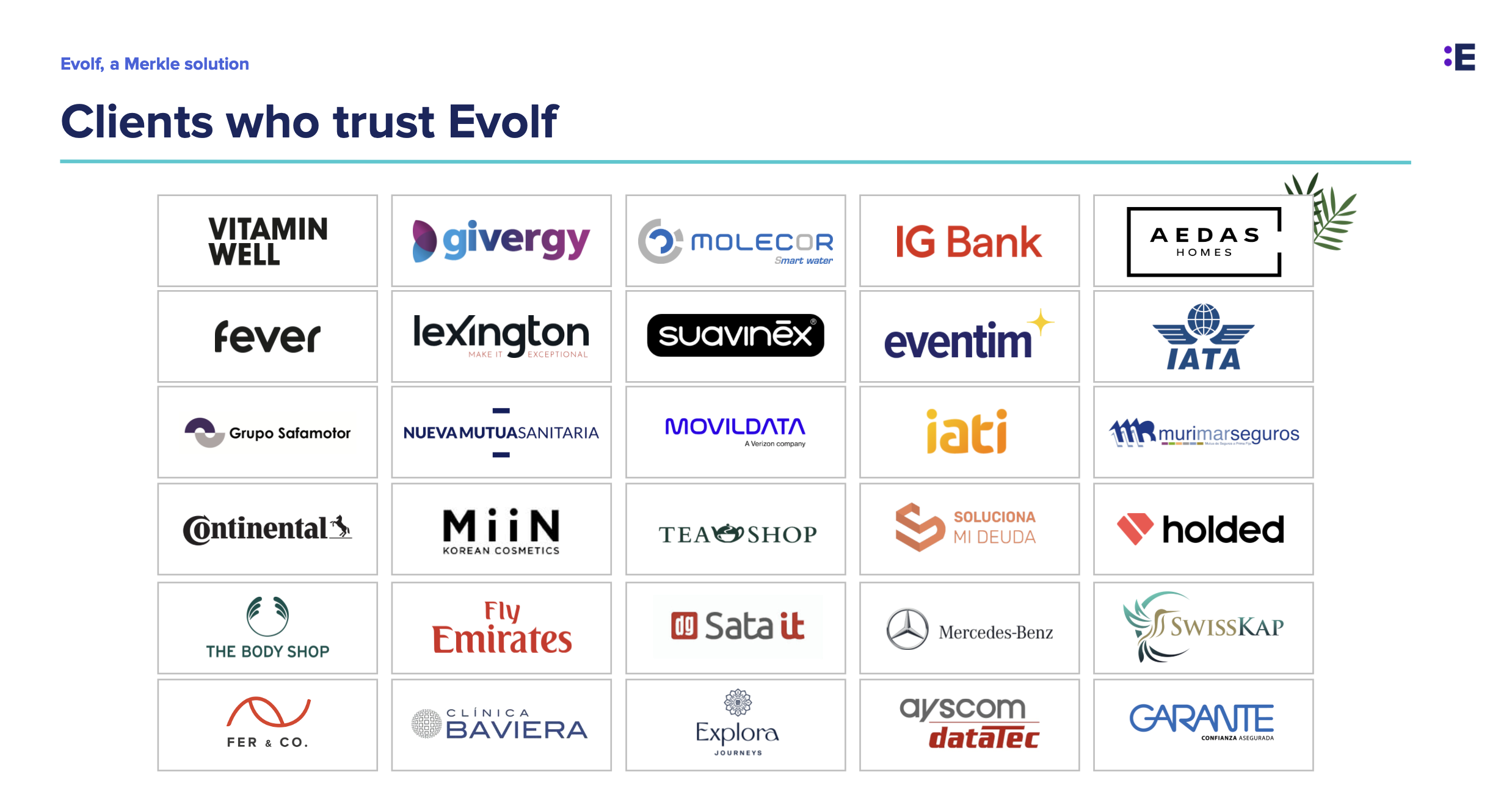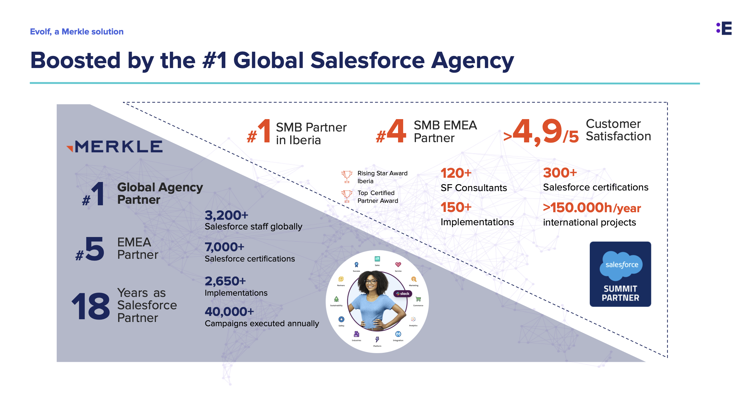 About Evolf, a Merkle solution We are Evolf, a Merkle solution , a Consulting Partner that works as a business accelerator especially focused on helping Small-to-Medium Businesses and start-ups to leverage the power of the Salesforce cloud and achieve their full growth potential thanks to the use of leading technologies.