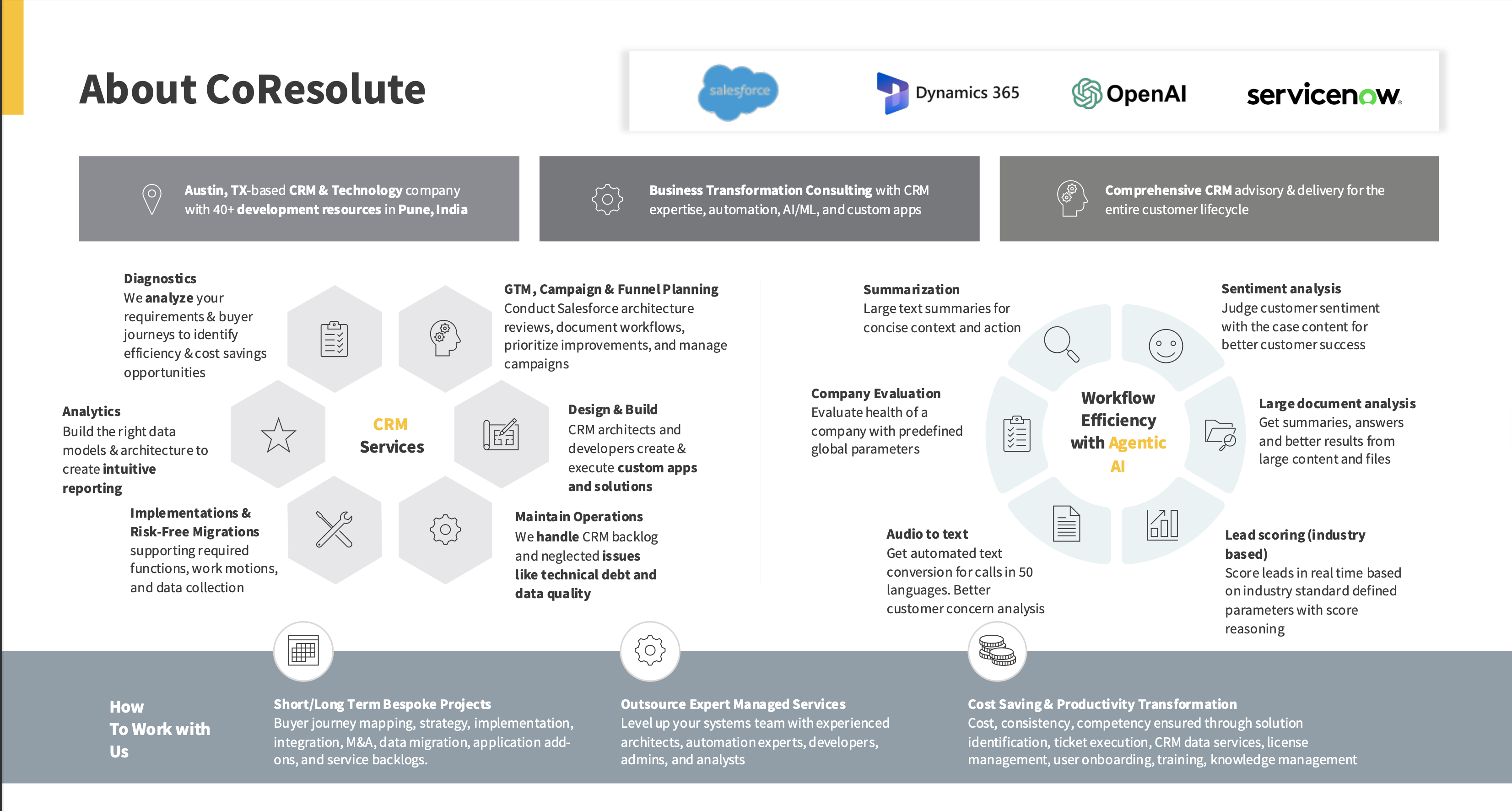 About Coresolute LLC Hi, we are Coresolute. We are a mashup of experienced operators, developers, and Salesforce experts who decided to merge several smaller shops into a robust consulting partner. With over 58+ projects and expertise in several other platforms, we don't shy away from challenging projects and work closely with our clients to design optimal solutions. ####The team has built its street cred on various projects in financial services, media, financial exchanges, software, and industrial and energy clients. As experts in MKT/SLS/SERV clouds, Heroku, Mulesoft, AWS, Agentforce, Communities, and app development, we are attuned to modern implementations and GTM motions using today's best practices. As an Agile team, we can work on your preferred PM platform. ####The team is based in Austin, TX, and Pune, India. We purpose-built our business to cater to mid-market clients who want the quality of a big shop at a reasonable cost. We aim to build lasting, beneficial relationships with our clients based on excellent service, reliability, and ease of doing business. ####Our team is certified in Salesforce and is a Salesforce partner. Please reach out. We would love to earn your business.