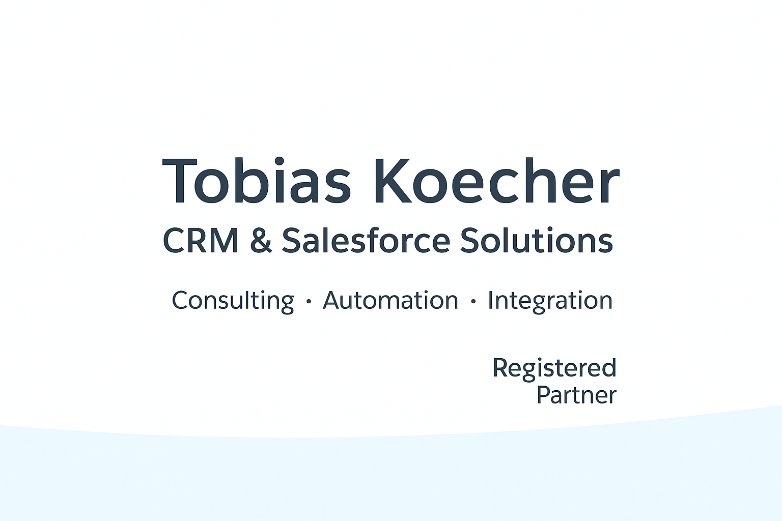 About Tobias Köcher I provide tailored Salesforce and CRM consulting for small and mid-sized businesses as well as enterprise clients.####With hands-on expertise in Salesforce Core (Sales, Service and Experience Cloud) and cross-industry experience in e-commerce, manufacturing, healthcare, life sciences, retail, energy, and more, I help organizations streamline processes, optimize automation, and deliver scalable solutions.####My work includes architecture consulting, system integrations, audits, global rollouts, and project leadership for Salesforce implementations across Europe.####_####Salesforce Certified Consultant · Based in Germany | Focused on CRM strategy, automation & integration.