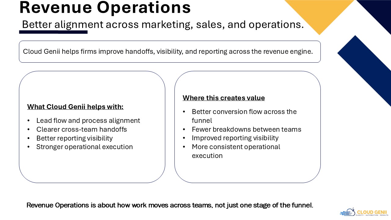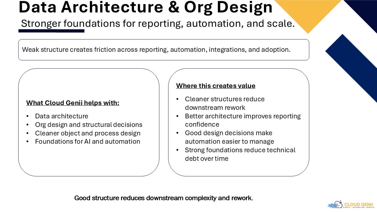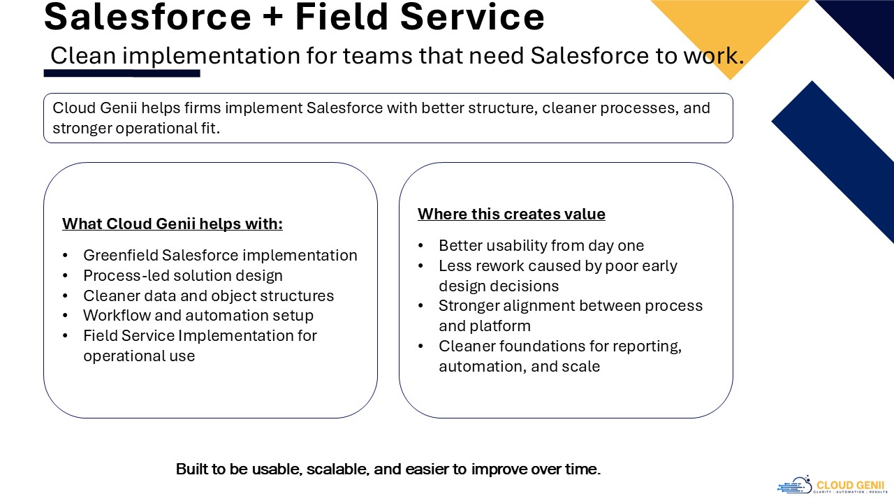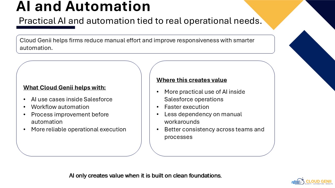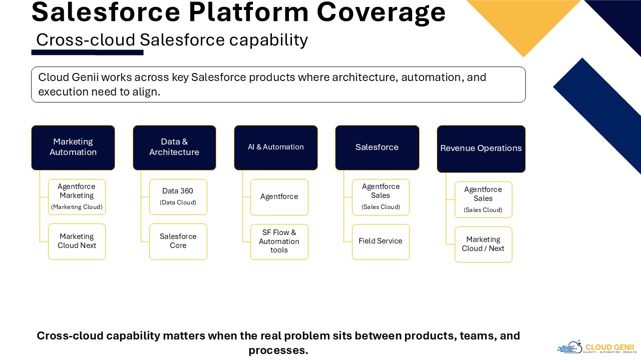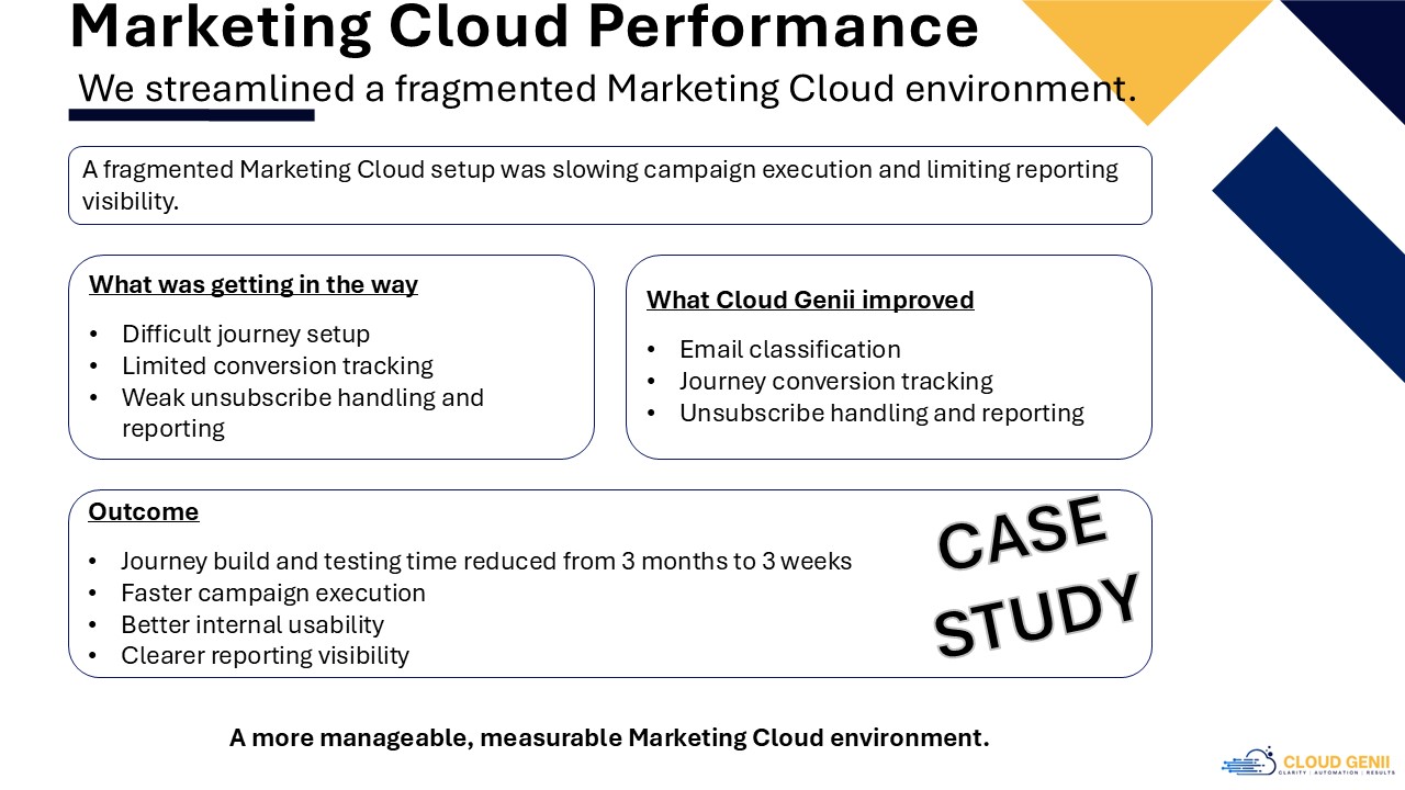 Cloud Genii helps firms improve how Salesforce supports marketing, operations, and growth. ####We work with organisations that need to fix fragmented environments, improve marketing automation, and deliver cleaner implementations from the outset. ####Our services include marketing automation, org remediation and optimisation, greenfield implementation, Marketing Cloud Next readiness and migration planning, Salesforce Health Checks and Audits, Revenue Operations, Data Architecture, and AI and Automation. ####Cloud Genii is especially well-suited to firms dealing with inherited environments that have become hard to manage or hard to trust, as well as firms that want a stronger setup from day one.