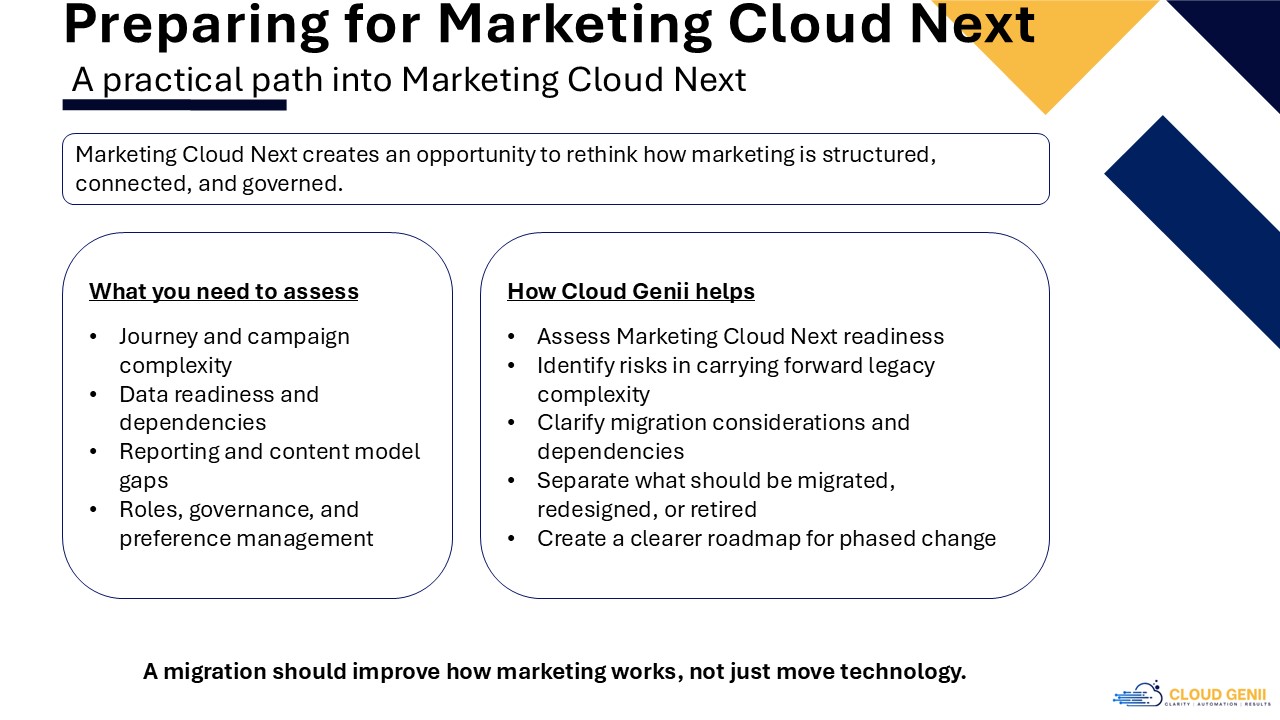 Plan for Marketing Cloud Next Practically##Assess readiness, migration considerations, and the operational impact of platform change.