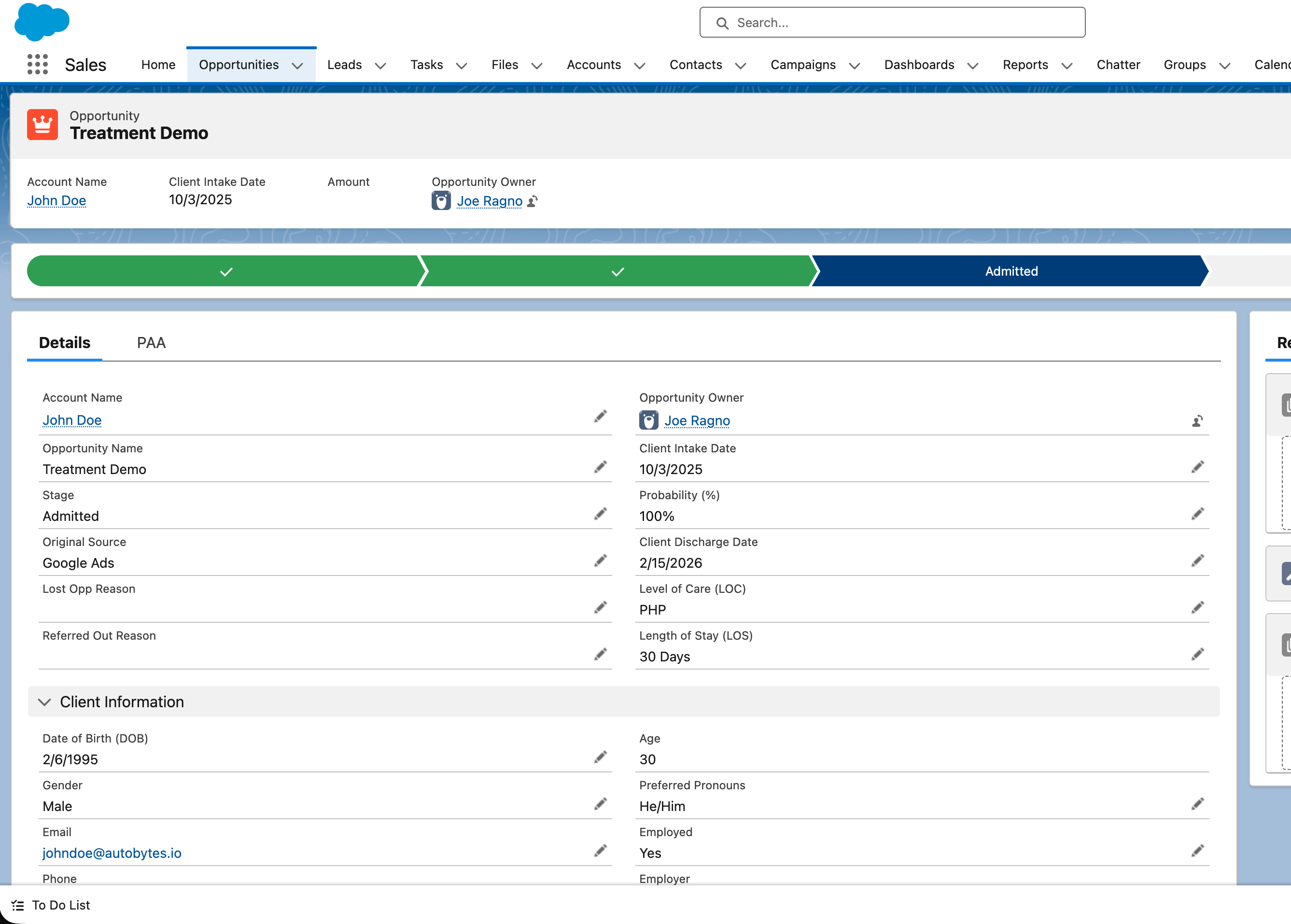 AutoBytes has been servicing clients who utilize Salesforce for their Mental Health & Substance Use Disorder treatment centers for nearly a decade. We understand your business needs and are to bring positive change to your org very quickly!