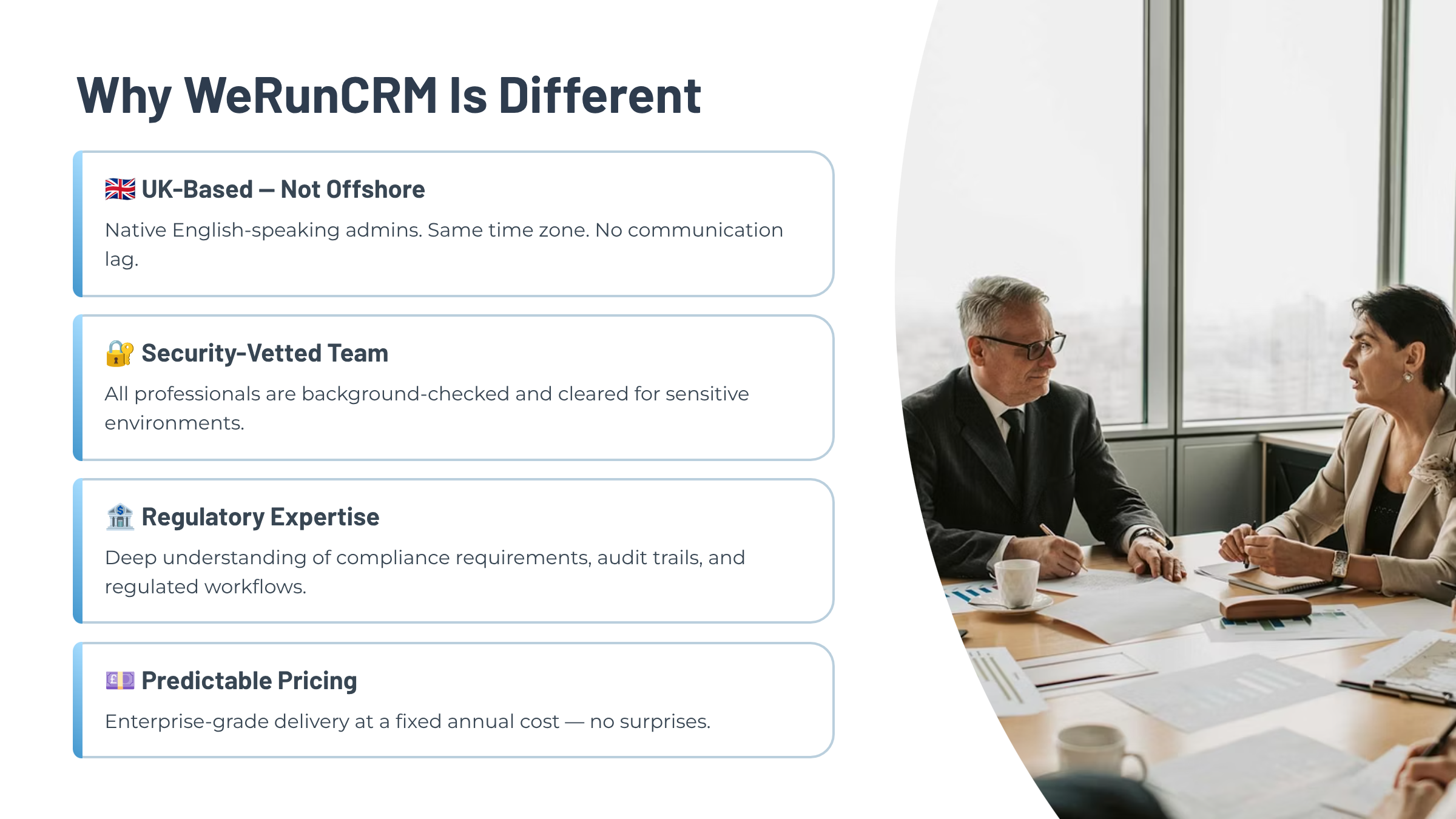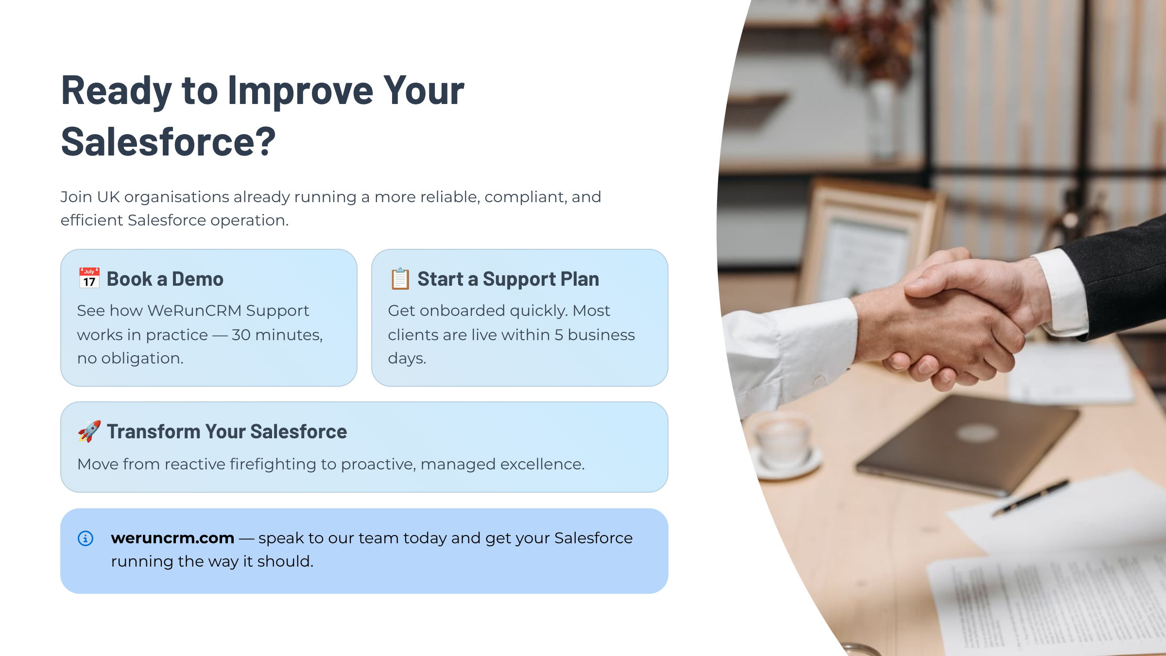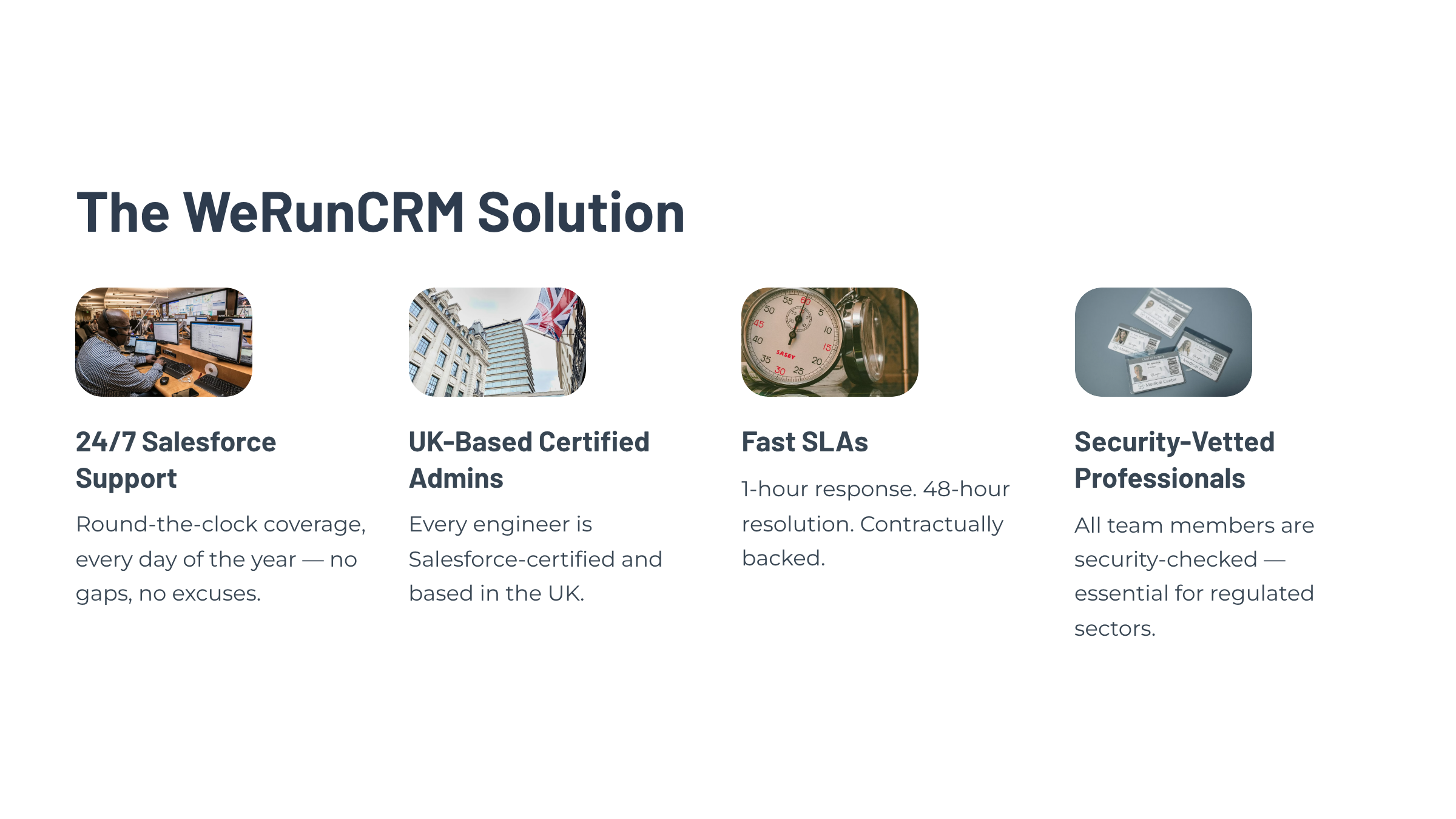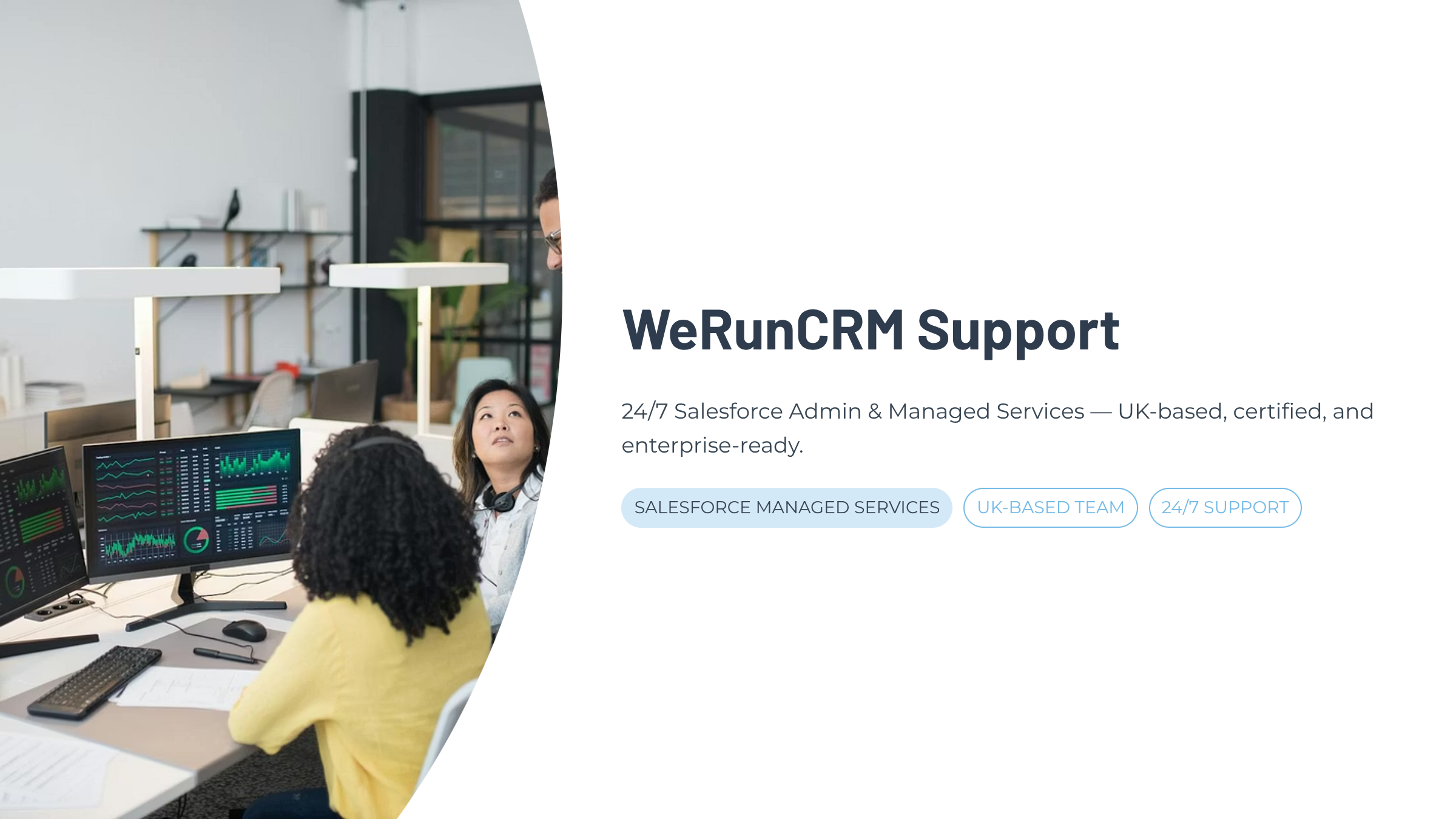 WeRunCRM Support provides 24/7 Salesforce administration and managed services for organisations that need fast, secure, and reliable expertise.####Our UK-based, certified and security-checked admins deliver rapid support with a 1-hour first response SLA and 48-hour average resolution time. Designed for business-critical environments, we offer enterprise-grade delivery with predictable, fixed annual pricing.####Services include user management, flows and automation, reports and dashboards, data imports and quality, security and permissions, integrations, and release management. All requests are managed through a dedicated support portal with full visibility.####Ideal for regulated organisations, WeRunCRM Support reduces downtime, improves performance, and removes the need for in-house admin resources.####Starting from £12,500 per year, including 24/7 support and defined ticket volumes.