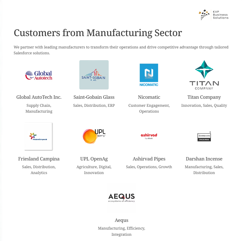 About KVP Business Solutions Pvt Ltd KVP Business Solutions is an elite Salesforce Summit Partner and Managed Service Provider (MSP) headquartered in Bangalore. With over 15 years of excellence, we specialize in high-velocity digital transformation across Manufacturing, BFSI, Retail and Real Estate. Our team of 100+ certified experts has successfully delivered 500+ projects, empowering 15,000+ users across 20 countries. At KVP, we don't just implement Salesforce; we build sustainable B2B revenue engines. By utilizing our library of 15+ pre-built industry accelerators, we reduce implementation timelines by 40%, ensuring faster time-to-value. Whether it's complex AI-driven forecasting, automated dynamic pricing, or enterprise-scale managed services, KVP is the trusted partner for global brands seeking to eliminate manual silos and achieve predictable growth.