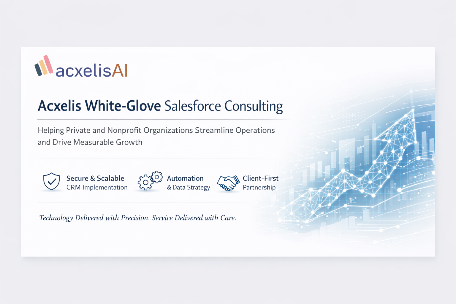 Acxelis delivers premium, white-glove Salesforce consulting focused on private and nonprofit organizations. We specialize in solving operational inefficiencies, disconnected systems, poor data visibility, low user adoption, and stalled implementations.