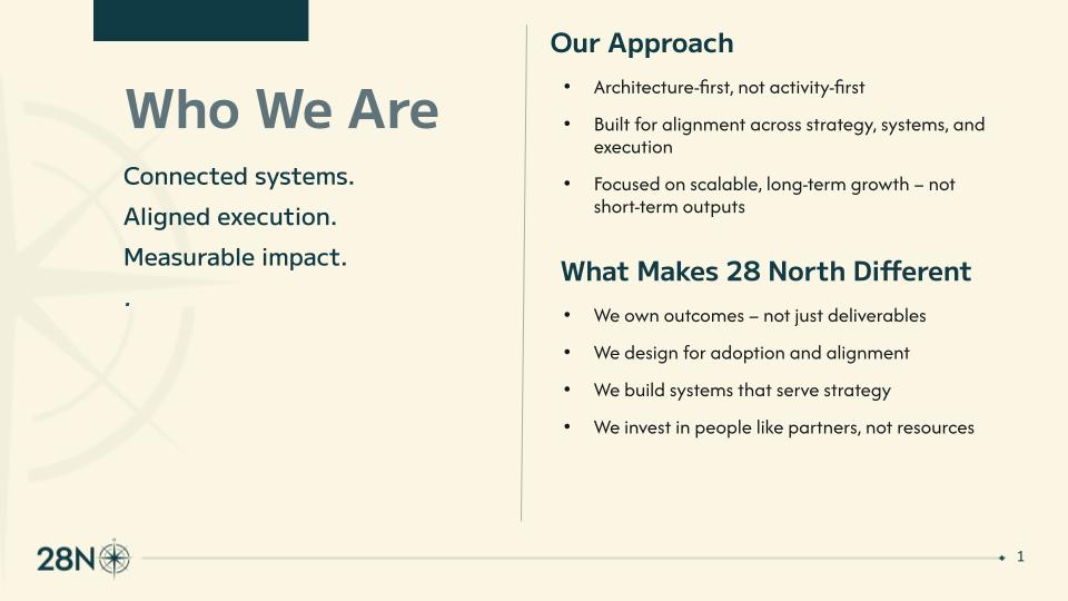 About 28 North Consulting LLC 28 North partners with clients to simplify complex systems, optimize technology, and align operations for measurable business outcomes. With a confident, data-driven, and forward-thinking approach, we guide leaders toward clearer decisions, stronger performance, and scalable growth.