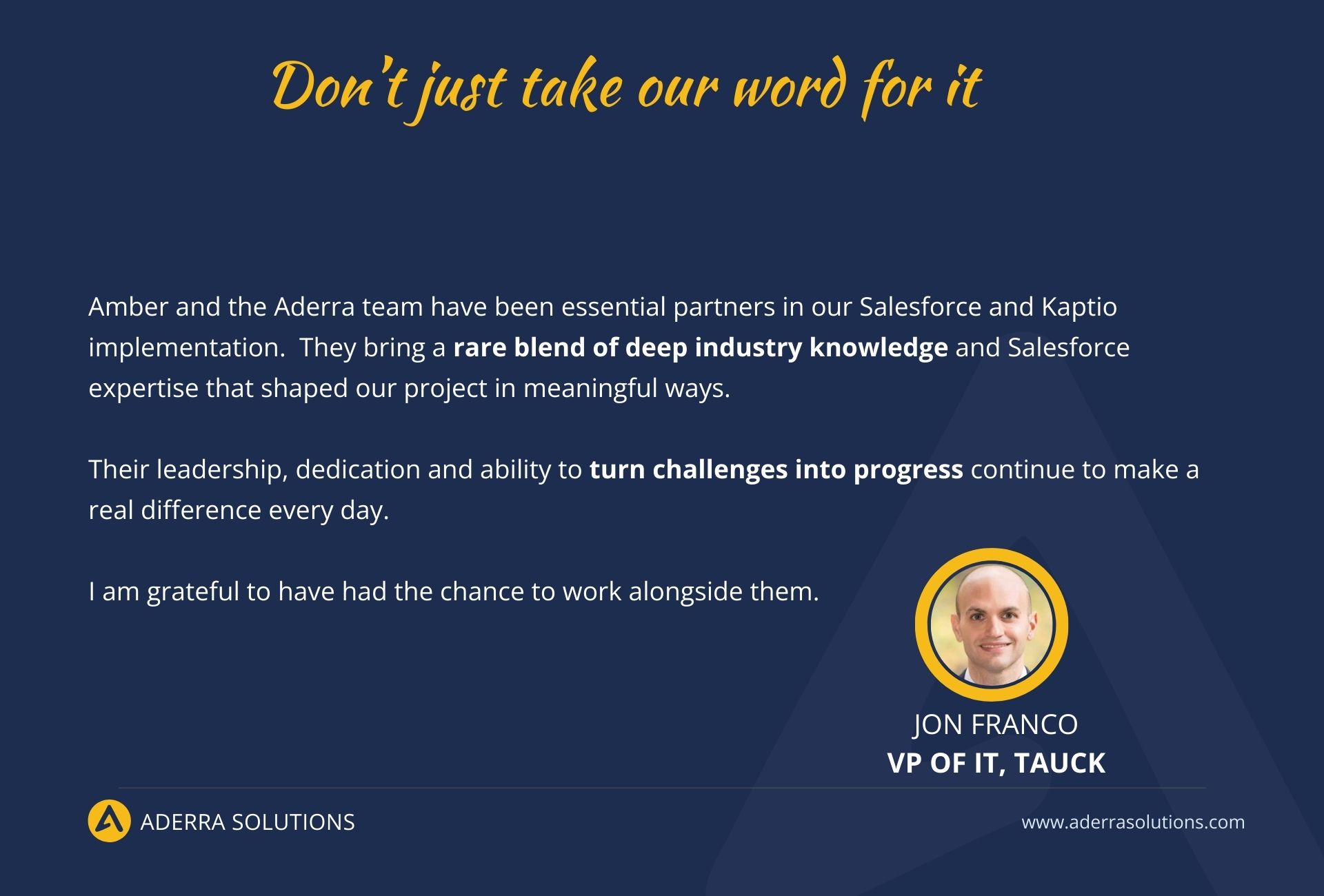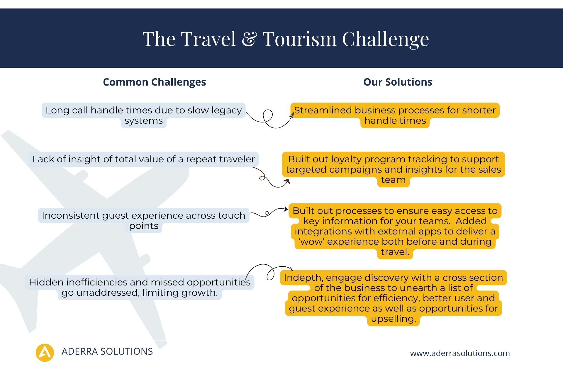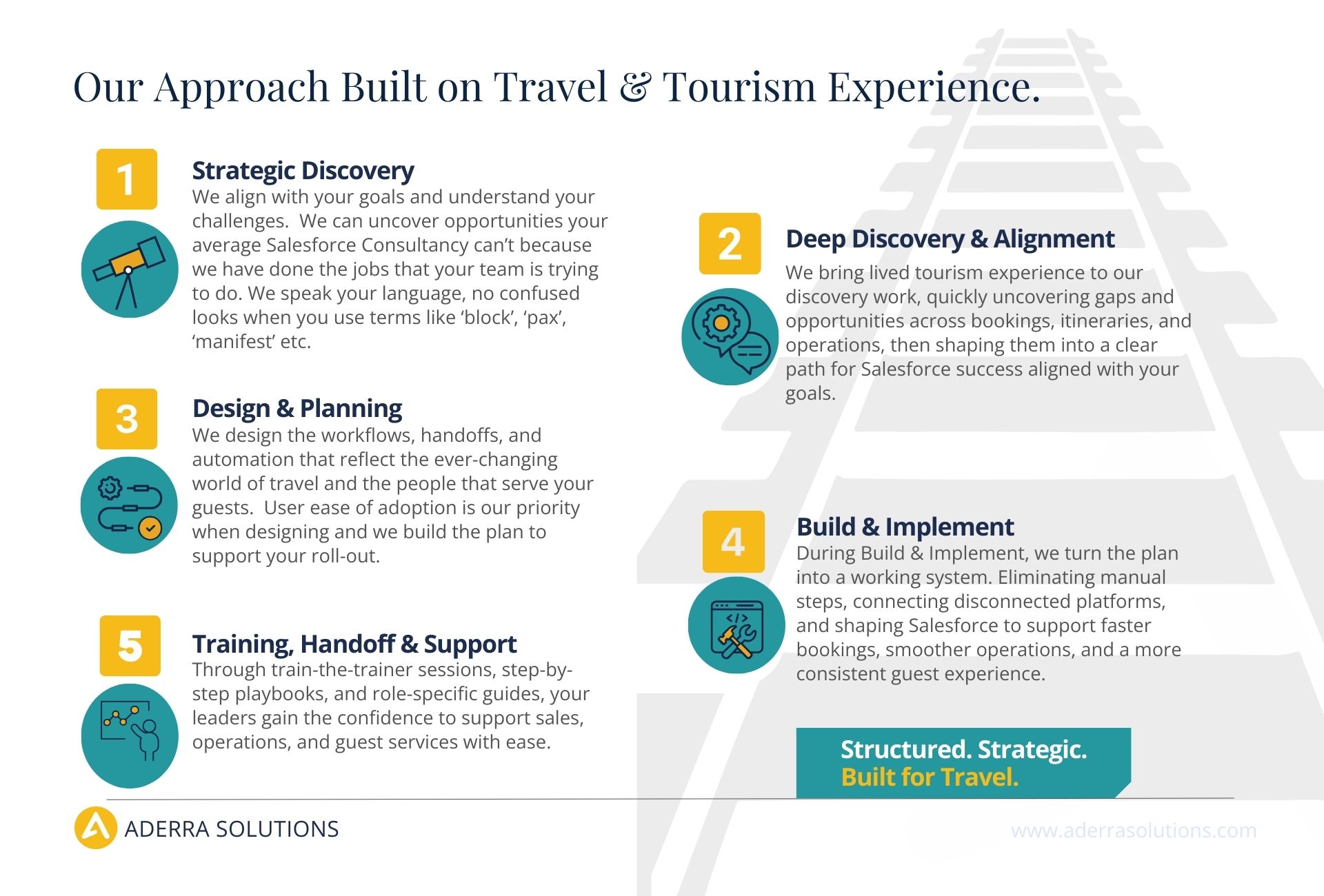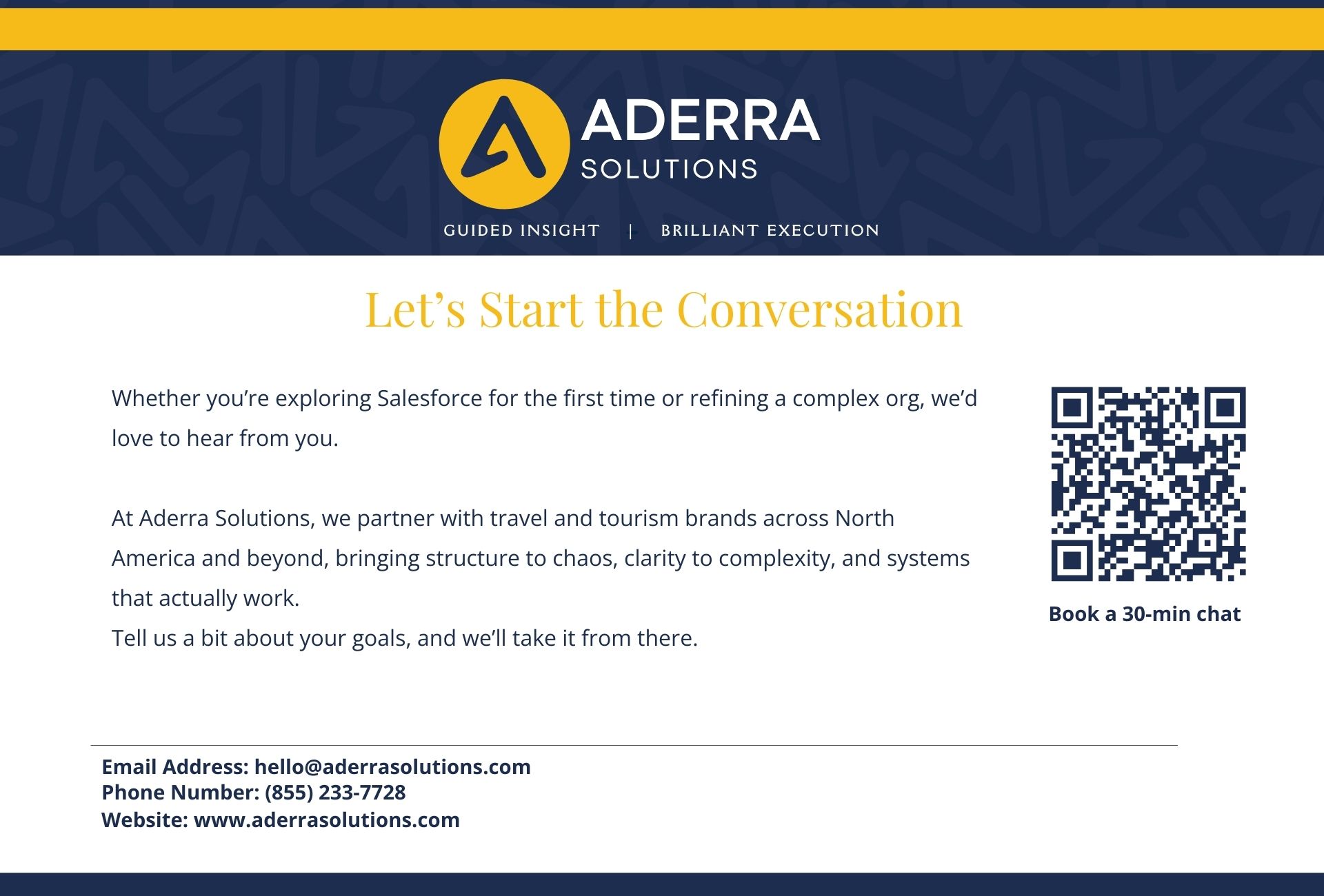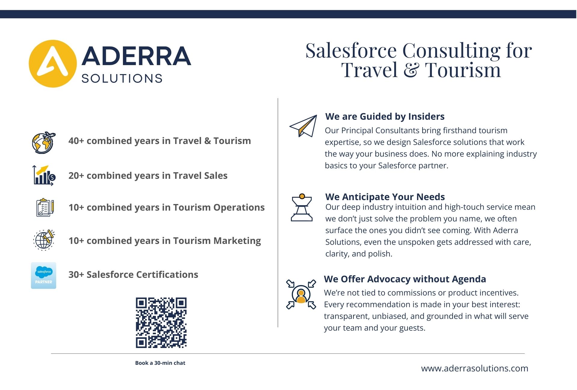 About Aderra Solutions Inc At Aderra, Our Mission is Simple:##Empower travel and tourism brands by connecting technology, teams, and guests through tailored Salesforce solutions.####As a Salesforce Partner with real-world industry roots, we bring thoughtful insight and expert execution to every engagement, streamlining operations, optimizing guest experience, and building systems that scale with you.####We are Guided by Insiders.####Our Principal Consultants bring firsthand tourism expertise, so we design Salesforce solutions that work the way your business does. No more explaining industry basics to your Salesforce partner.####We Anticipate your Needs.####Our deep industry intuition and high-touch service mean we don’t just solve the problem you name, we often surface the ones you didn’t see coming. With Aderra Solutions, even the unspoken gets addressed with care, clarity, and polish.####We Offer Advocacy without Agenda.####We’re not tied to commissions or product incentives. Every recommendation is made in your best interest, transparent, unbiased, and grounded in what will serve your team and your guests.