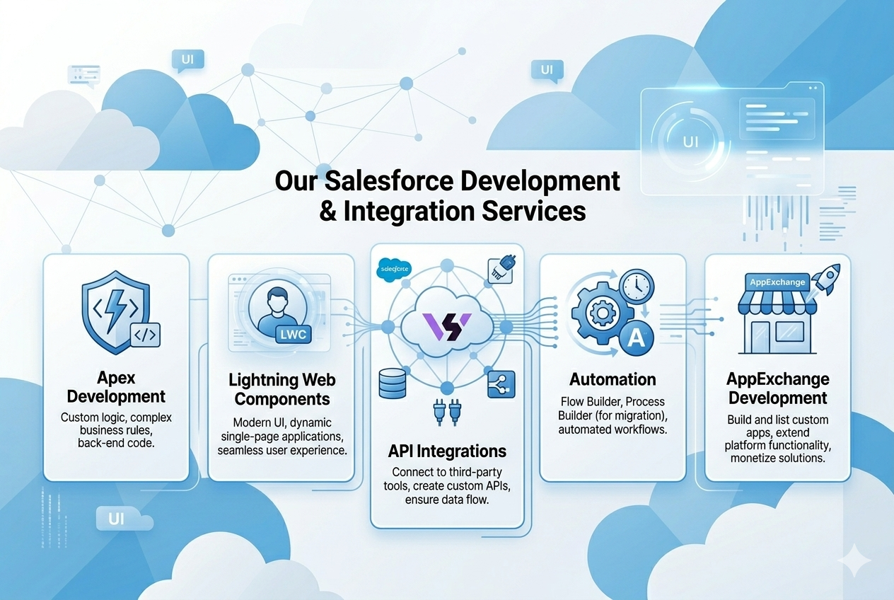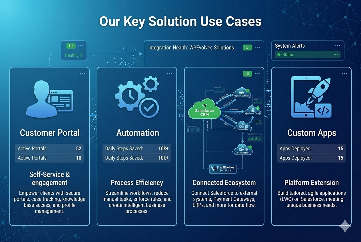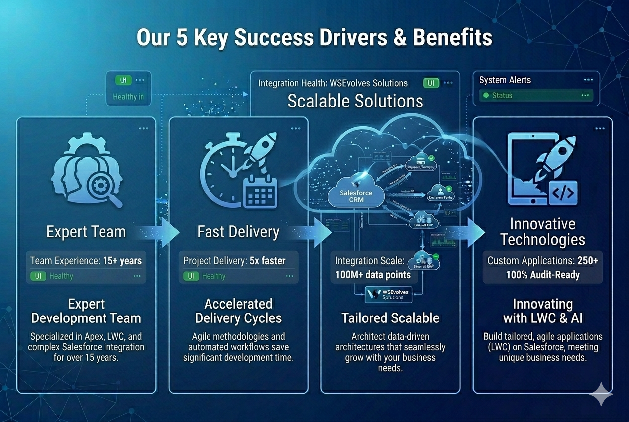 Bridging the gap between complex business challenges and elegant Salesforce solutions. We specialize in custom LWC development, seamless API integrations, and scalable architecture designed to drive user adoption and maximize your ROI.