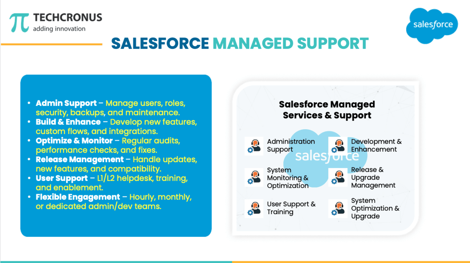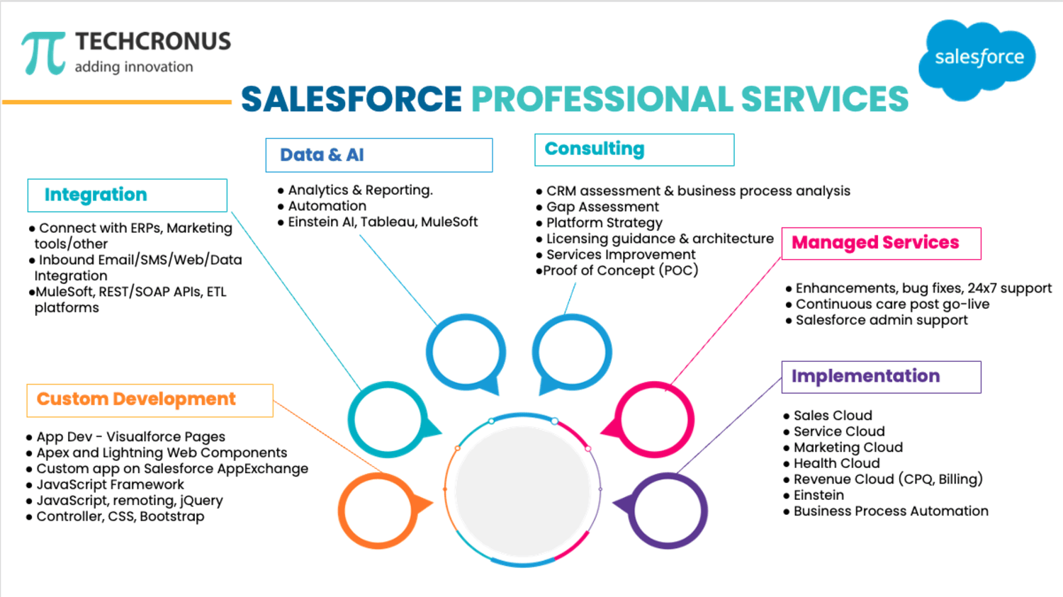 Techcronus – Your Trusted Salesforce Partner####Techcronus is a certified Salesforce consulting and implementation partner helping businesses unlock the full potential of the Salesforce ecosystem. With a decade of experience in Customer Experience Solutions, cloud transformation, and custom Salesforce development, we empower global organizations to streamline operations, boost customer engagement, and drive growth.####We specialize in:##- Salesforce Sales Cloud, Service Cloud, and Experience Cloud##- Salesforce Industry Cloud##- Salesforce Revenue Cloud (CPQ, Billing)##- Custom Lightning Component Development##- Salesforce Integrations##- Data Migration & Optimization##- AI-powered lead generation and automation####Why Choose Techcronus?##- Deep expertise in Salesforce architecture and implementation##- Agile delivery with tailored solutions for SMBs and enterprises##- Proven success across industries including retail, healthcare, logistics, and finance##- Scalable solutions with embedded AI and analytics####Awards & Recognition##- Salesforce Partner Community Contributor##- Top CRM Consulting Firm – Clutch##- Upwork Top Rated Agency####Let’s build smarter, faster, and more connected experiences together.