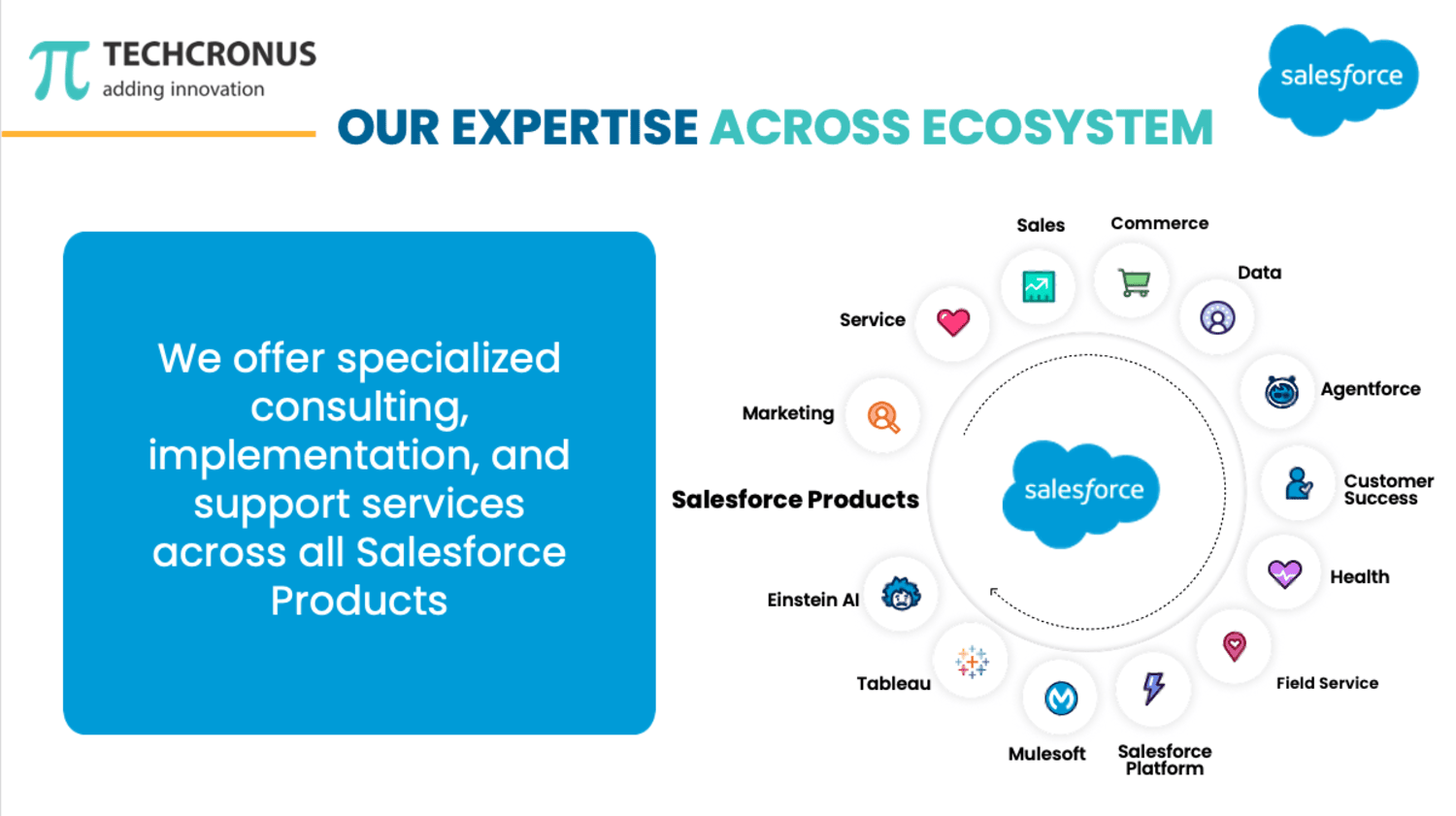 With over 12 years of industry experience and team of 80+ experts, Techcronus empowers businesses with expert Salesforce CRM solutions, helping them streamline operations, enhance customer engagement, and drive growth.####We offer end-to-end Salesforce consulting services, including:##- CRM Strategy & Roadmapping##- Salesforce Implementation & Customization##- Data Migration & System Integration##- Sales Cloud, Service Cloud, Health Cloud and CPQ Solutions##- Marketing Automation & Analytics##- Managed Services & Ongoing Support##- AppExchange App Development####With a proven track record of successful Salesforce deployments across the USA, GCC, AUS, and India, Techcronus has helped clients achieve:### 100+ successful Salesforce implementations### 30%+ improvement in sales productivity### Faster time-to-market with agile delivery### High customer satisfaction and repeat business####As a certified Salesforce Partner, we combine deep domain expertise with a customer-first approach to deliver scalable, secure, and future-ready CRM solutions.####Connect with us on business@techcronus.com for Free Consulting.