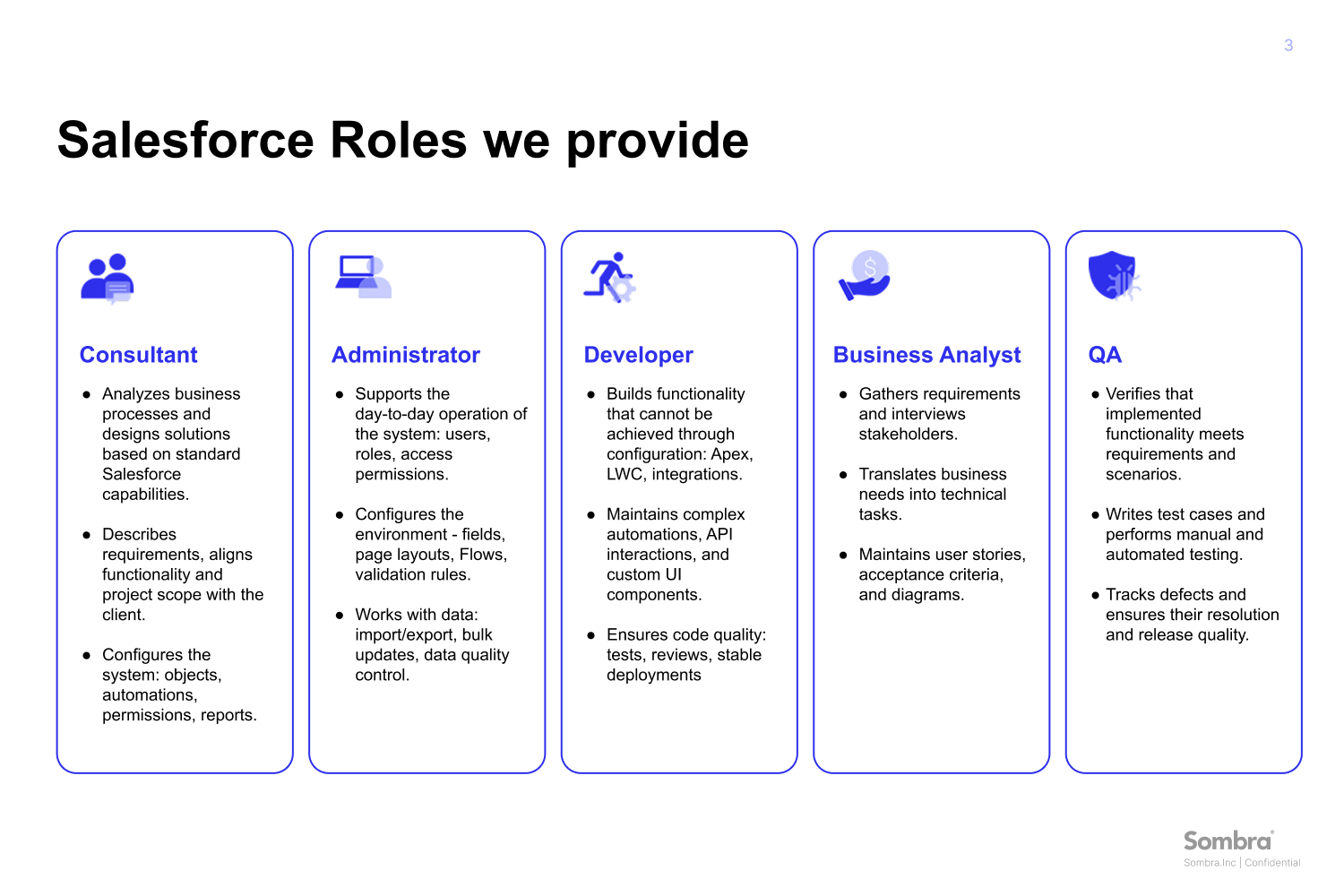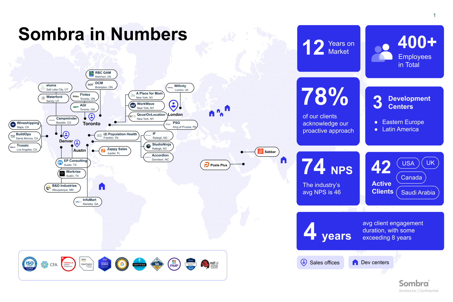 Sombra is a global Salesforce development and consulting company.##With over 350+ experts across Europe, Latin America, Canada, and the US, we simply develop and deliver Salesforce solutions in financial services, e-commerce, energy, logistics, and TMT.