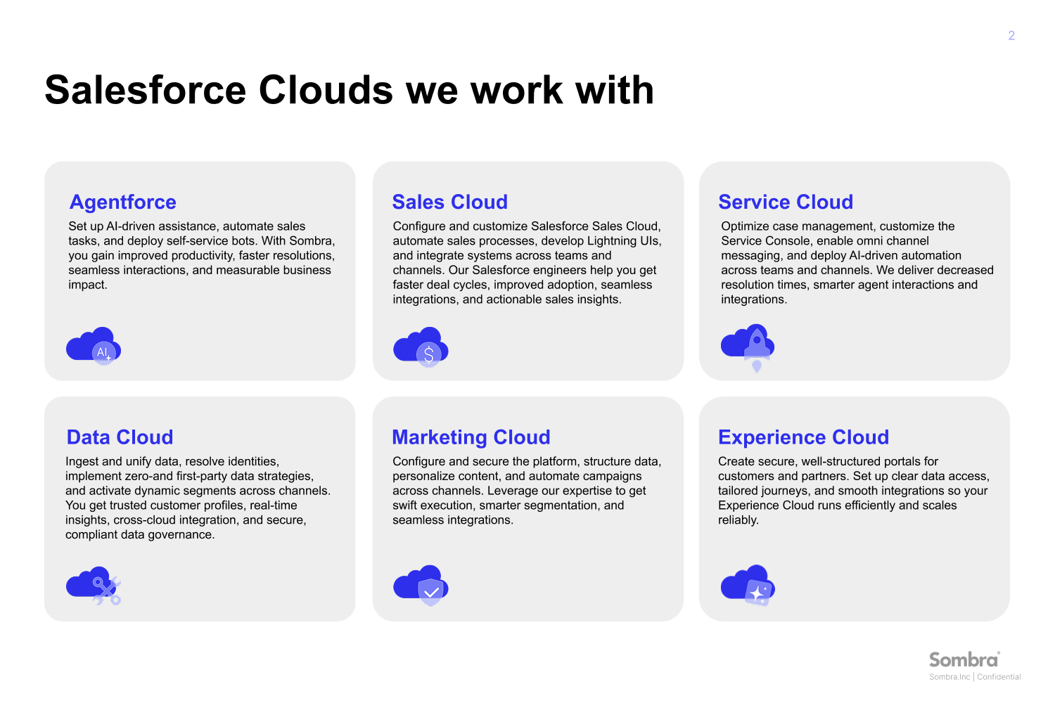 About Sombra We are a global technology company delivering end-to-end solutions across web, data, AI, and platform engineering, infrastructure setup, quality assurance, support, and cybersecurity. Guided by our values of proactivity (anticipate and act), communication (fast and transparent), honesty (say it as it is), service (exceed expectations), and action (do it today), we help businesses innovate and scale with confidence.####As a Salesforce partner, we specialize in Sales Cloud, Marketing Cloud, and Agentforce, enabling organizations to transform the way they sell, market, and serve their customers. With Sales Cloud, we help companies automate pipelines, implement AI-powered forecasting, and tailor their CRM for faster deal cycles and cleaner data. Through Marketing Cloud, we design personalized, data-driven campaigns across every channel, turning marketing into a true growth engine with measurable results. With Agentforce, we empower service teams with AI-driven automation, intelligent workflows, and virtual agents that reduce costs while delivering exceptional customer experiences.
