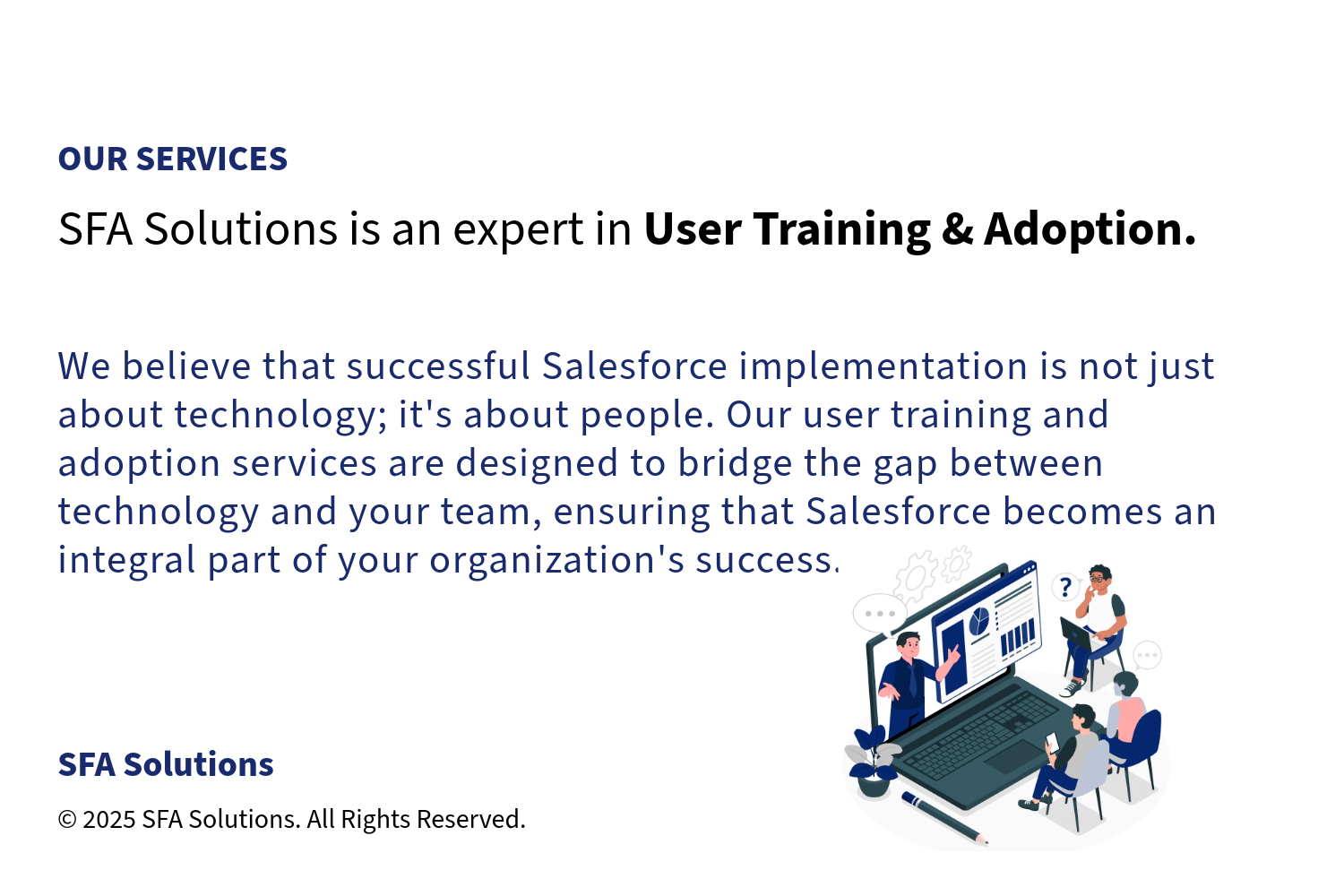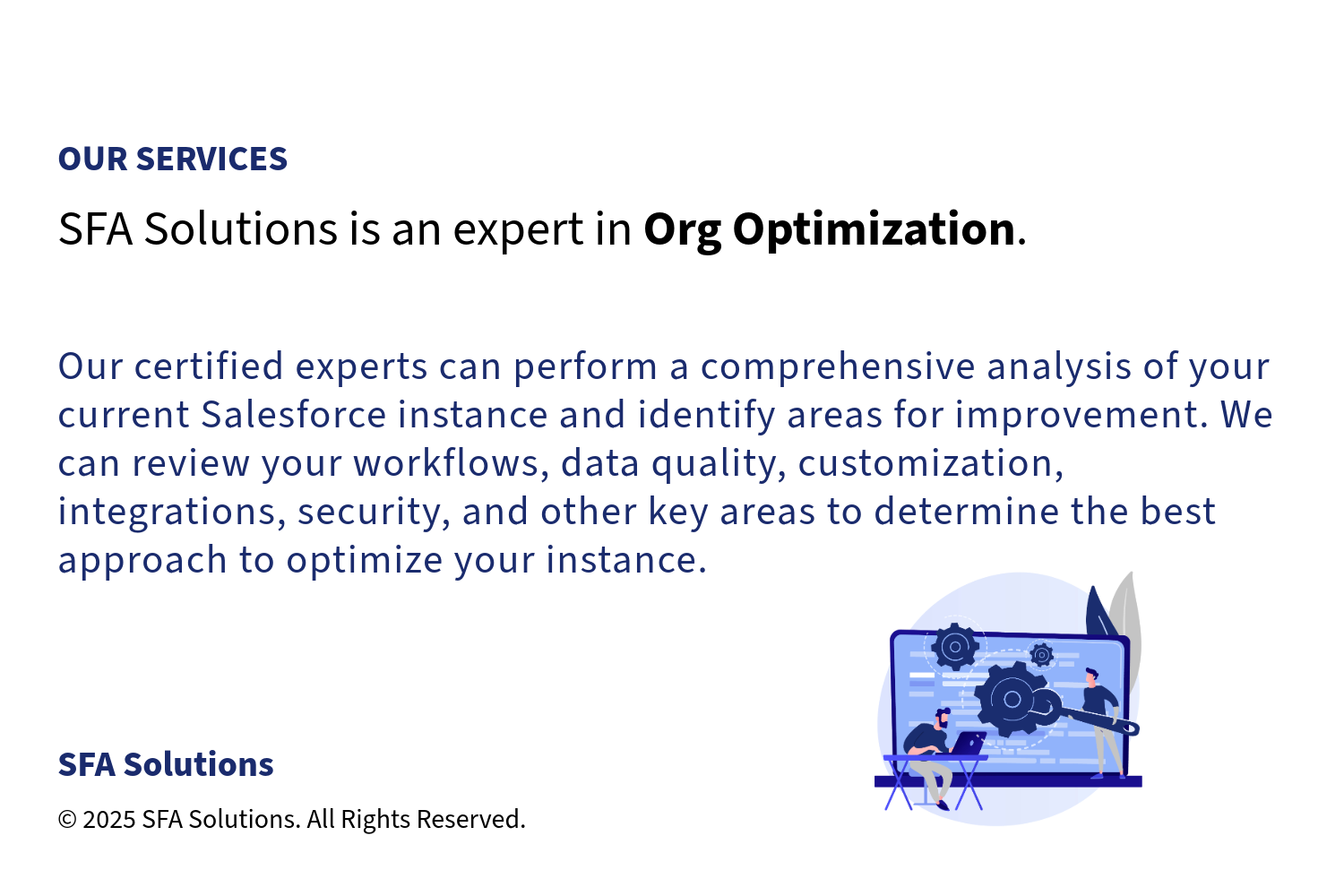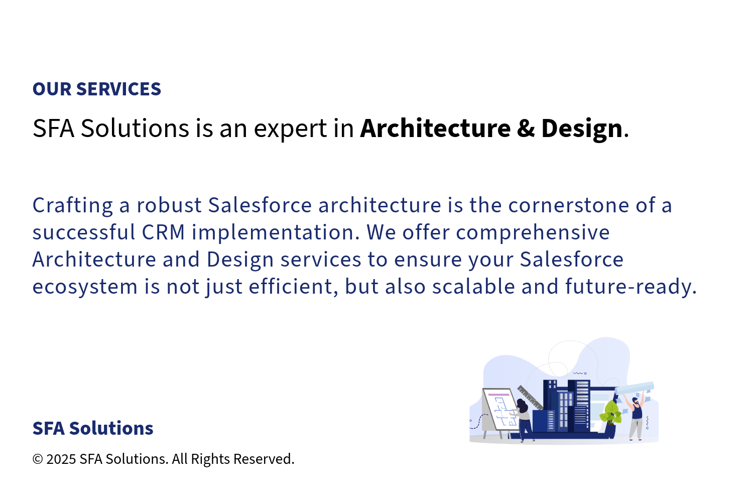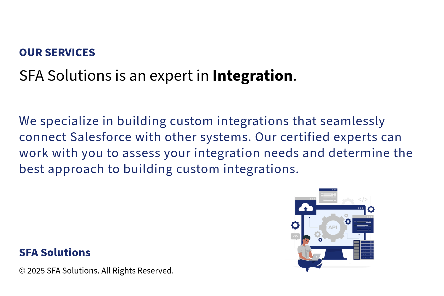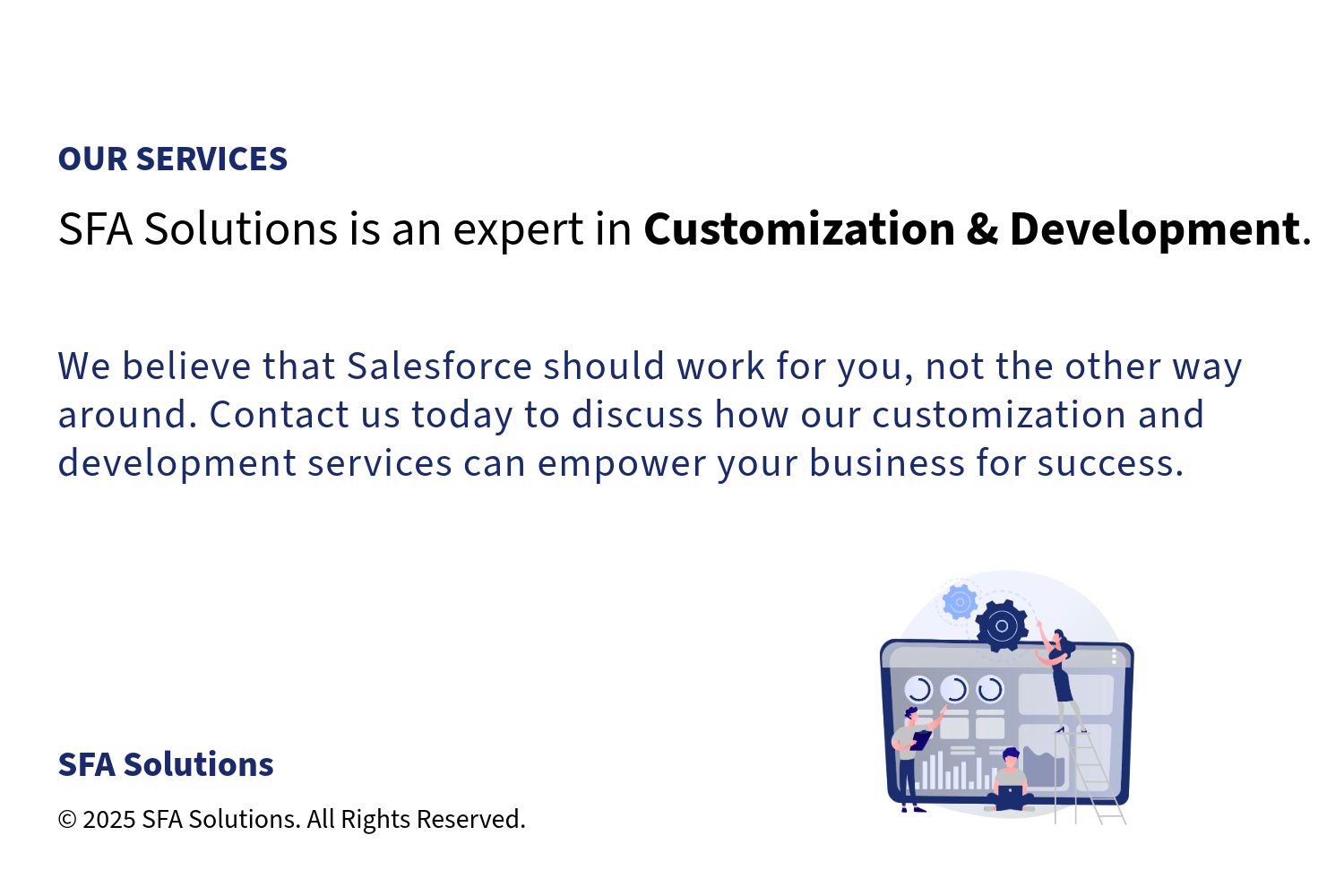 SFA Solutions is a Salesforce consulting, implementation, and integration agency that collaborates closely with you to build unique and robust solutions, ensuring your business thrives and succeeds at every step.