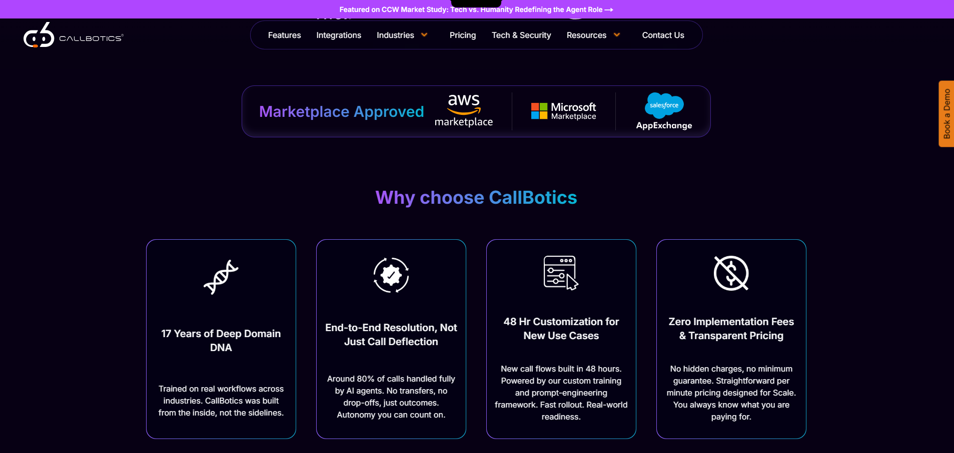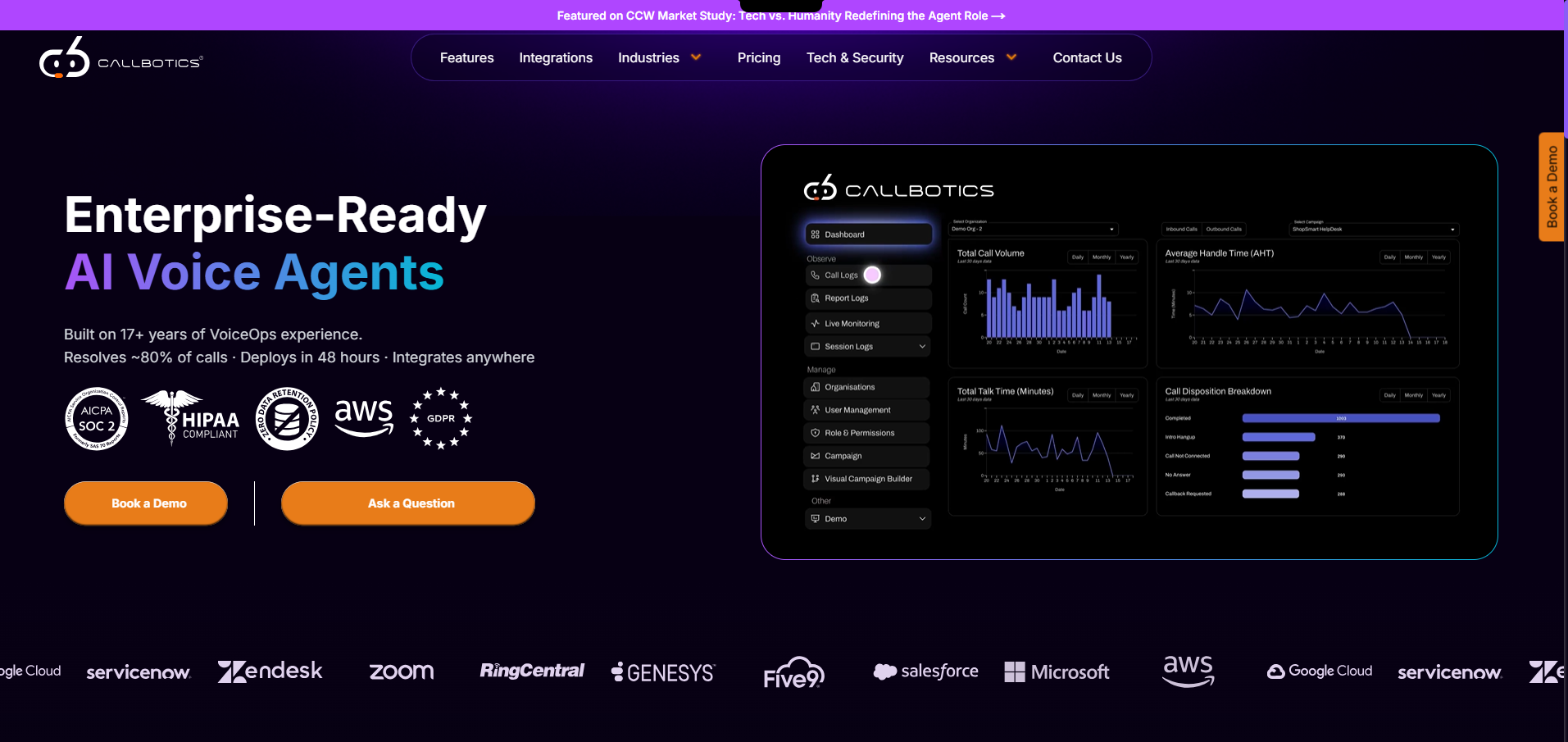 CallBotics was born from 17 years of firsthand experience in high-stakes, voice-driven operations, where we witnessed how overwhelmed teams, delays, and rising costs quietly eroded performance and trust.## ##Built from the inside, not the sidelines, CallBotics is an enterprise-grade AI voice agent platform that helps organizations handle high-volume, call-intensive workflows with speed, empathy, and accuracy. ## ##Our AI agents autonomously manage around 80% of calls end-to-end, including complex, multi-step operational workflows, cutting cost per call by 65–90% while improving efficiency, turnaround, and stakeholder satisfaction. ## ##Seamlessly integrates across your existing tech stack, including leading CRMs, dialers, and CX or workflow platforms, so deployment happens in hours, not months. ## ##We exist to remove inefficiency as a barrier to progress because no team, client, customer, or stakeholder should wait for the help they deserve.