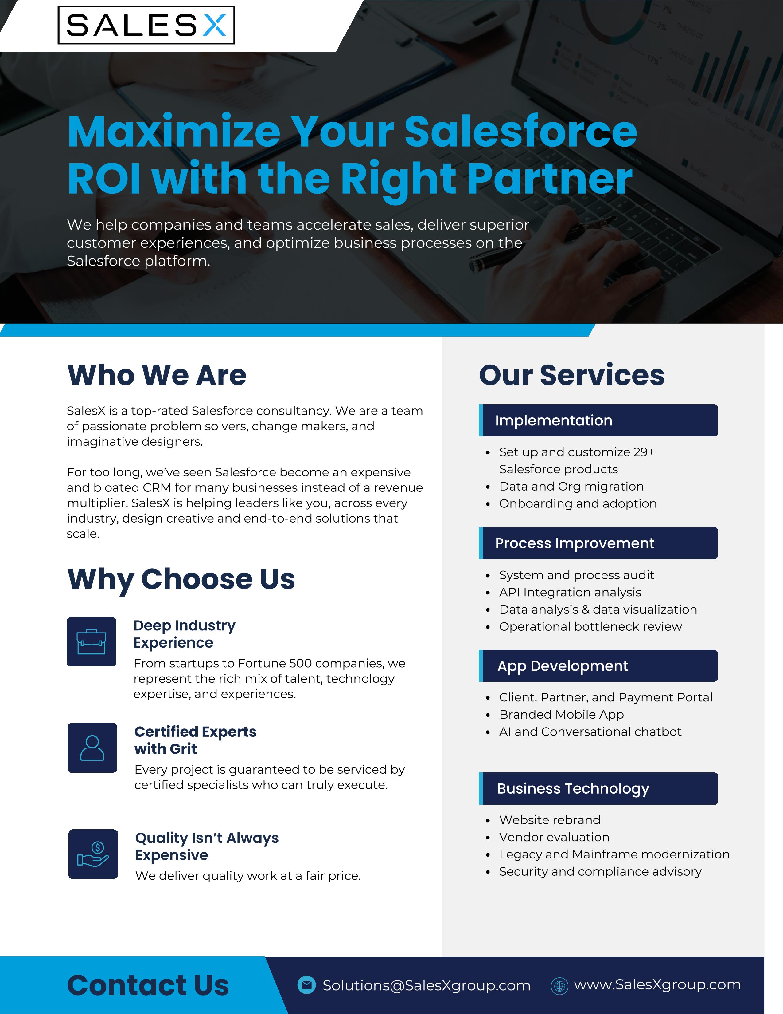 About SalesX LLC A winning CRM platform should be easy to use and elegant, utilizing the full suite of the capacities that your Salesforce has to offer. We are obsessed with delivering an effortless end-user experience leveraging automation and industry best practices.####We are heavily certified with a broad industry knowledge and deep familiarity with best-in-class technologies to help you realize your organization’s true potential.####From over-engineered to underutilized Salesforce instances, we know what works and what doesn’t.