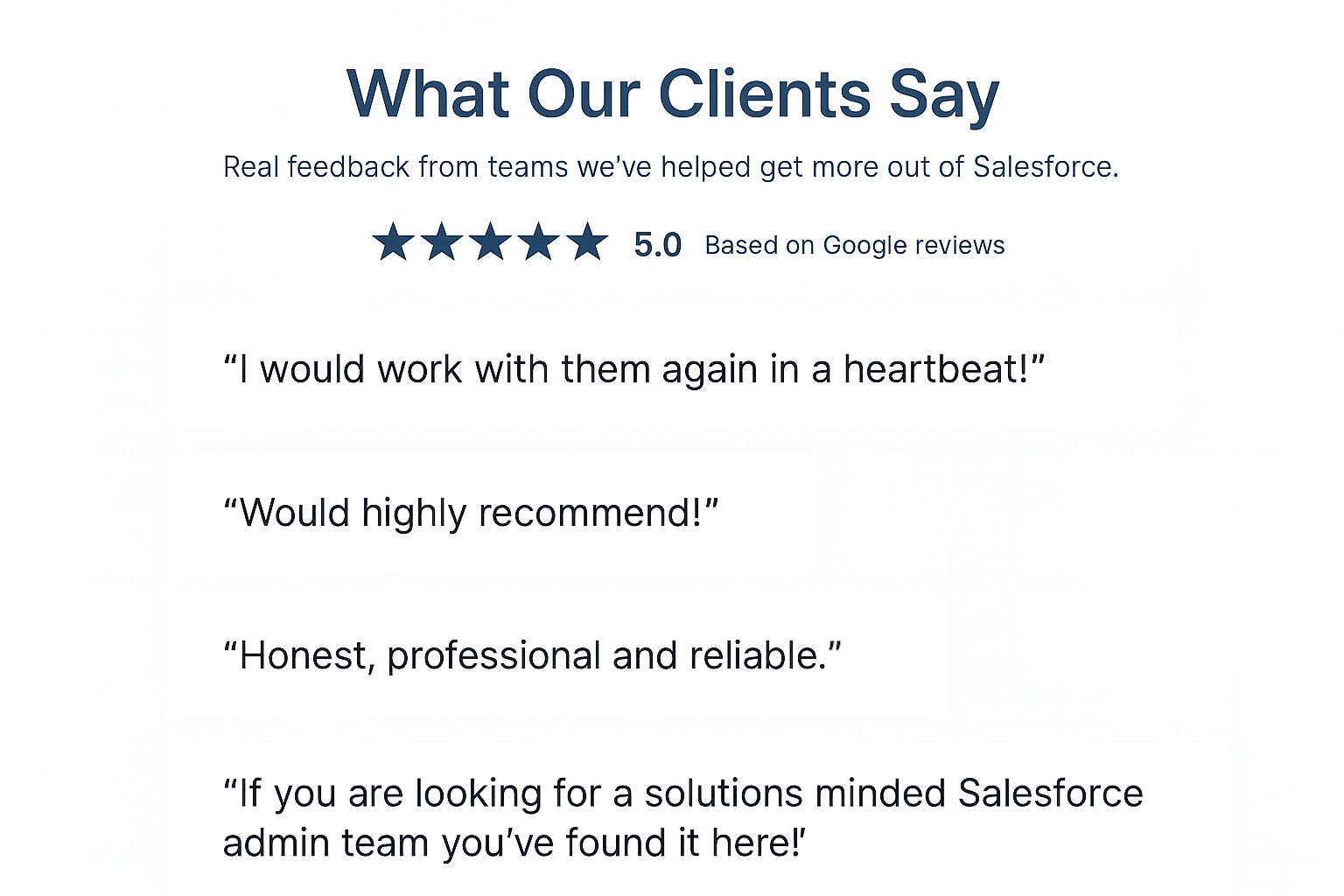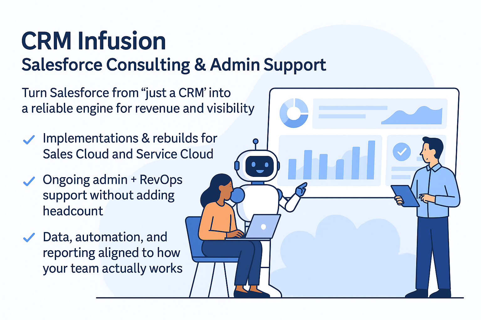 CRM Infusion helps growing companies design, implement, and optimize Salesforce—combining consulting and Admin-as-a-Service to improve revenue, efficiency, and visibility across sales, service, and operations.