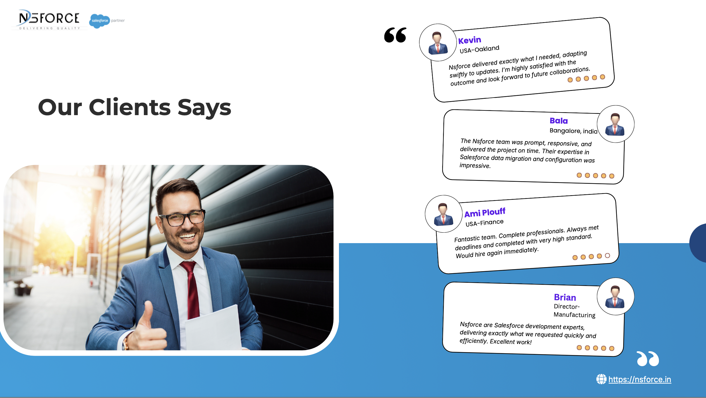 About Nsforce Software Pvt Ltd Nsforce is a Salesforce Consulting Partner delivering scalable, high-quality CRM solutions for startups to enterprises. We specialize in Salesforce implementation, customization, and optimization using an agile delivery model for faster time-to-value. Our team partners closely with clients to align Salesforce solutions with business goals, driving adoption, ROI, and long-term growth.####Professional Services##- Salesforce Sales, Service, Marketing & Industry Clouds##- Custom Development (Apex, Visualforce, LWC)##- Marketing Cloud setup, automation & optimization##- Field Service Lightning (FSL) implementation##- Salesforce CPQ, Billing & Revenue Cloud##- Managed Package implementation, integration & configuration##- Experience Cloud design & development##- Agentforce CRM Analytics##- Dedicated Salesforce support & maintenance