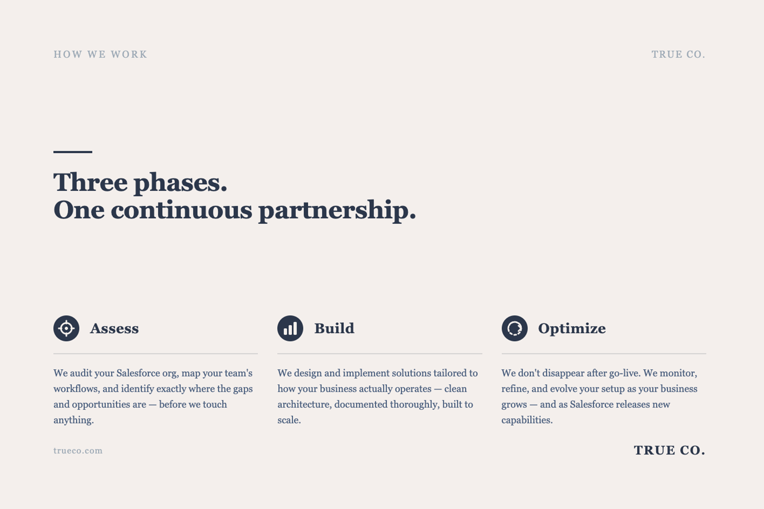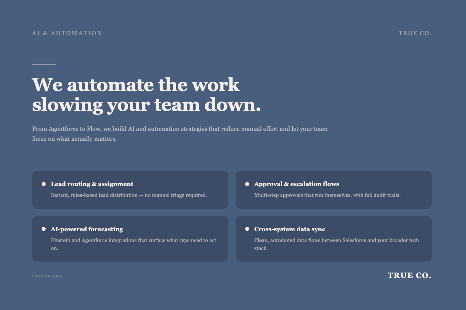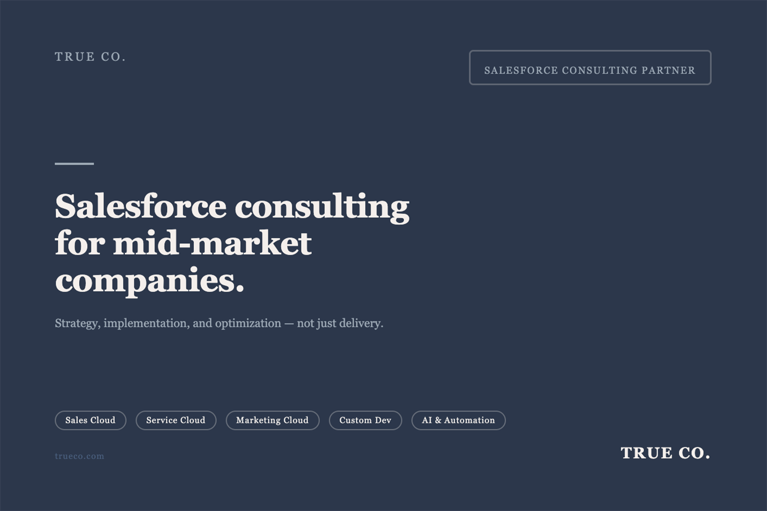 True Co. helps mid-market companies get more out of Salesforce; not just implement it. We specialize in Sales, Service, and Marketing Cloud with a sharp focus on AI, automation, and custom platform development.