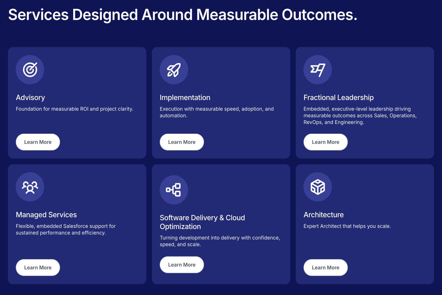 Former operators who have been in the trenches at startup and enterprise scale, bridging the gap between business vision and execution. We ensure your Salesforce investment pays for itself without the bloated billable hours.