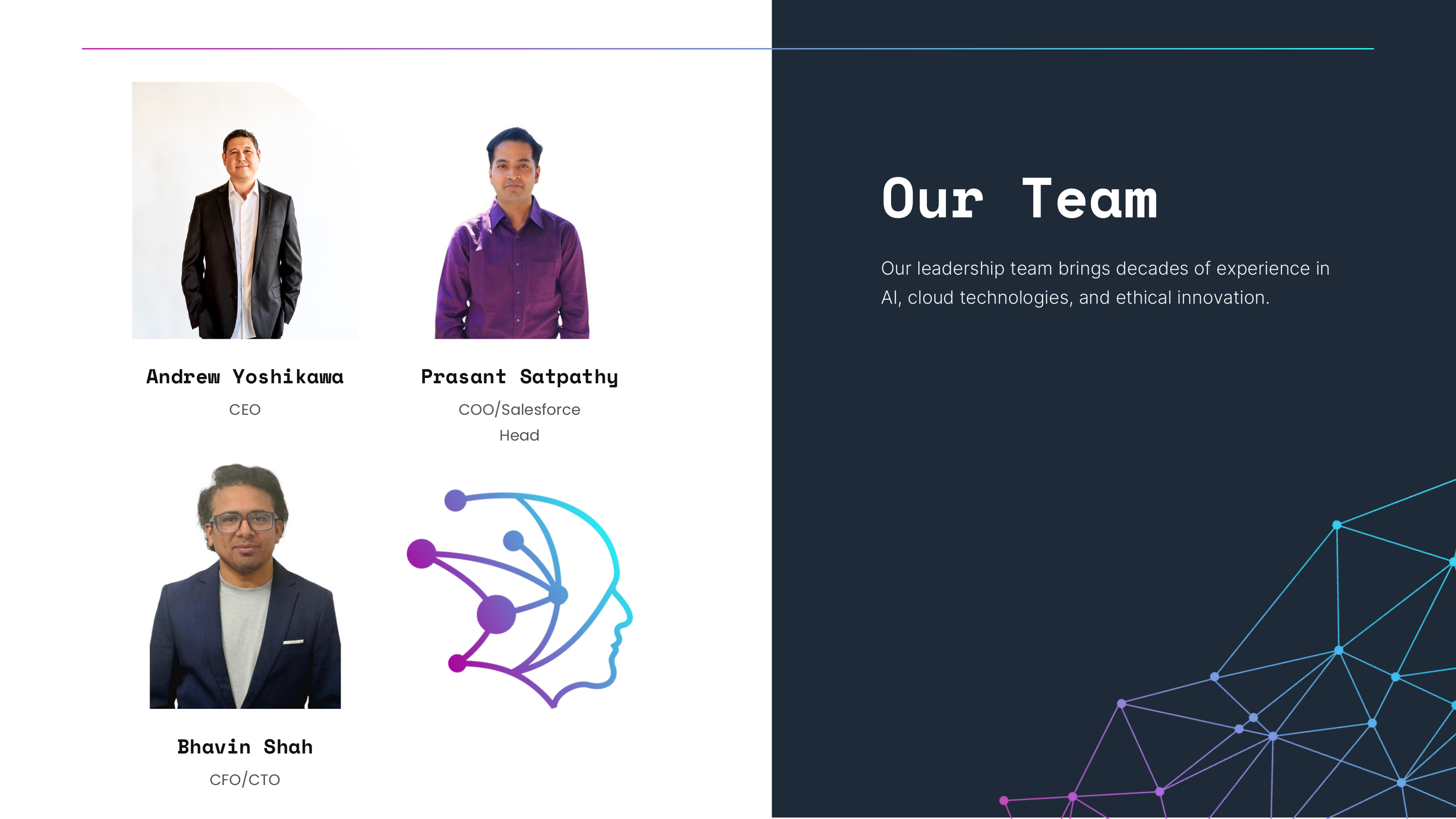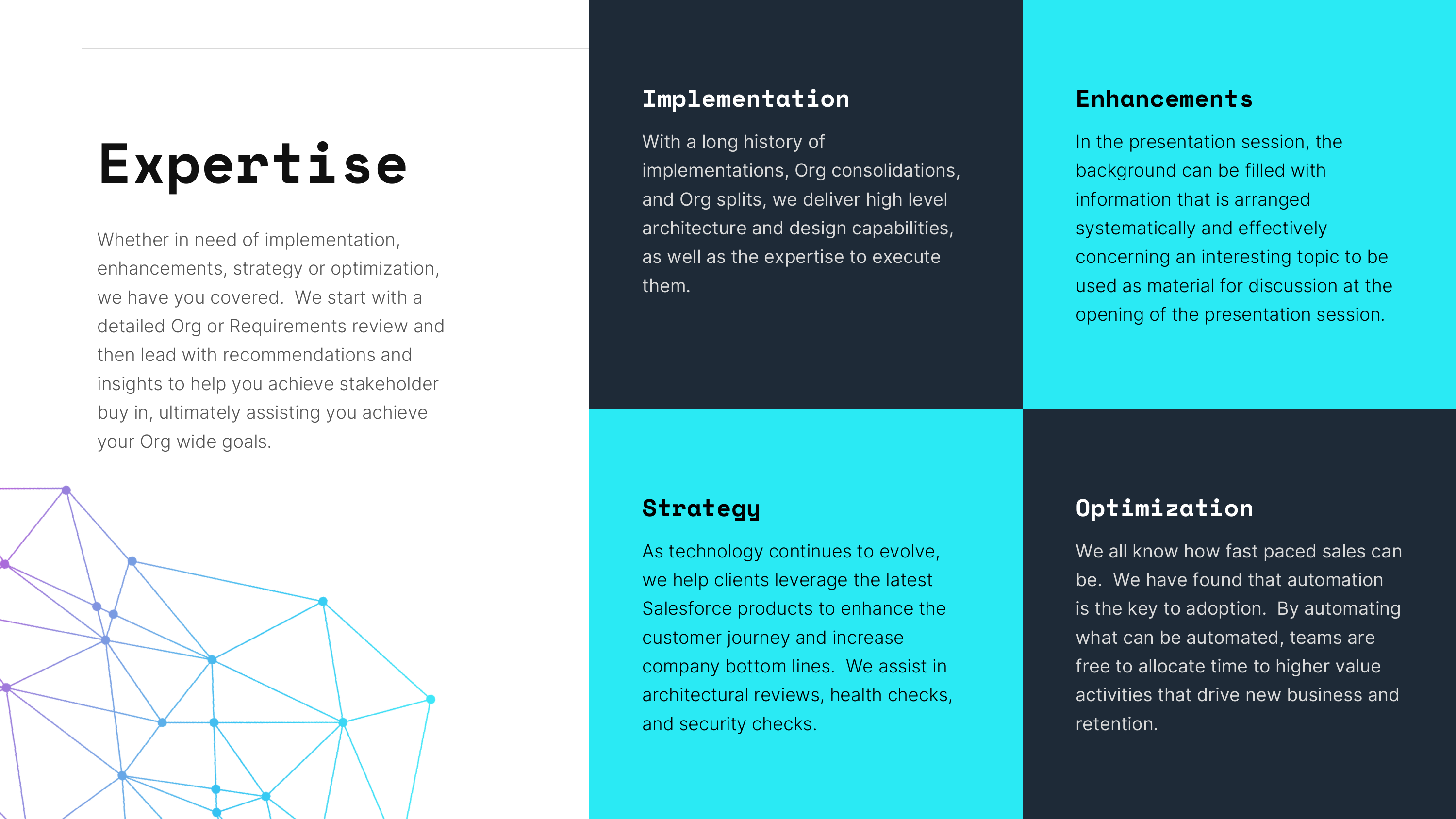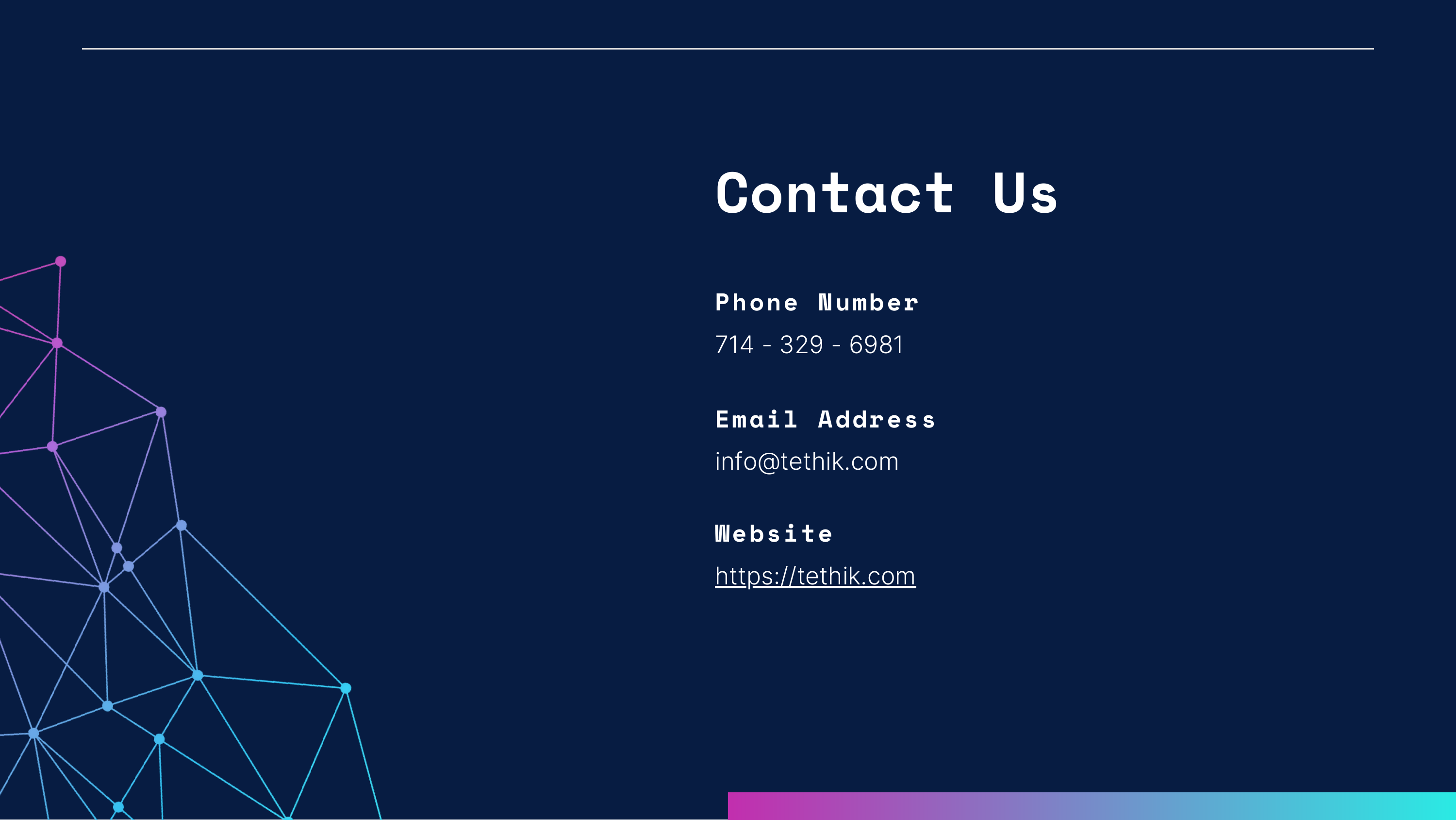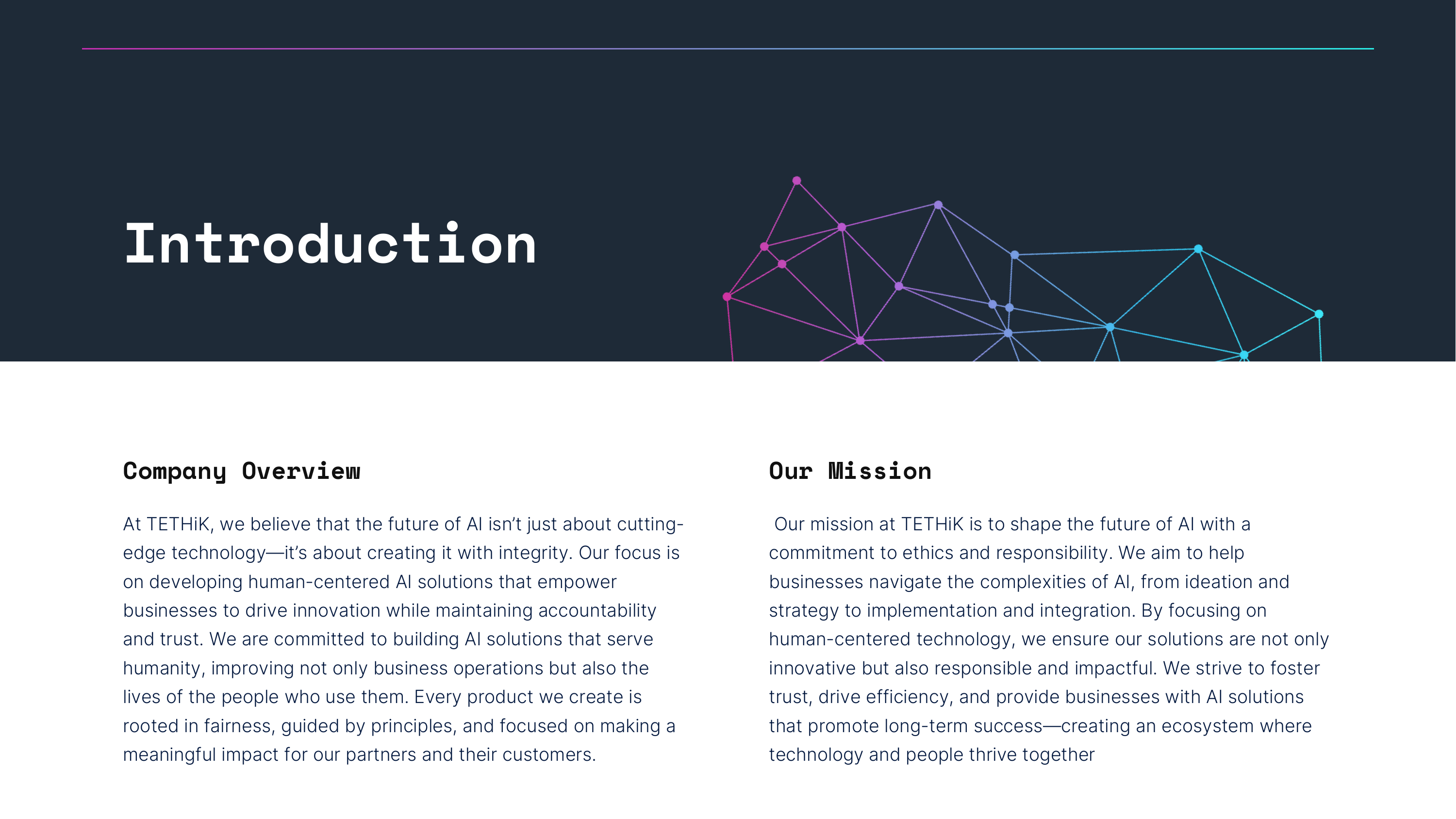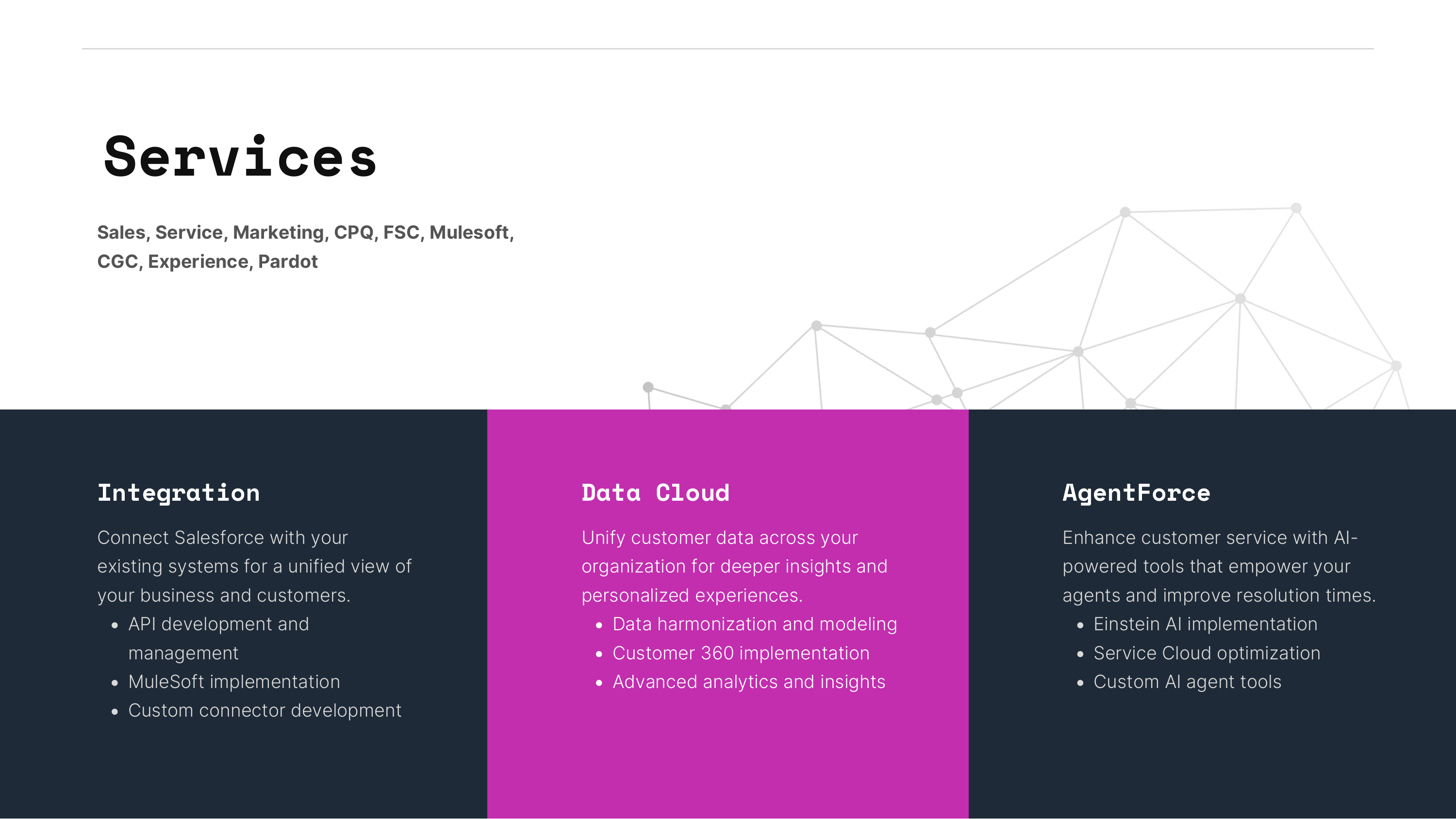 About TETHiK, llc. With TETHiK, we deliver cutting-edge technology solutions with a human-first approach, ensuring that businesses harness the full potential of AI, cloud, and enterprise platforms while fostering a culture of innovation and sustainability.####Salesforce Solutions##Optimizing Salesforce to drive revenue, enhance customer experiences, and maximize sales potential:####Implementation & Integration - Custom Salesforce solutions tailored to your business needs.##Salesforce Data Cloud - Unlock the power of unified data for deeper customer insights.####Agentforce - Enhance sales enablement with AI-driven automation and intelligence.####AI Consulting & Strategy##adoption to AI-native product development, we help businesses navigate the evolving AI landscape:####AI Integration for Workforce Optimization - Automate, streamline, and empower your teams with AI.##AI Adoption & Change Management - Ensure smooth implementation and user buy-in for AI solutions.##AI-Native Product Development - Build intelligent, future-ready products from the ground up.