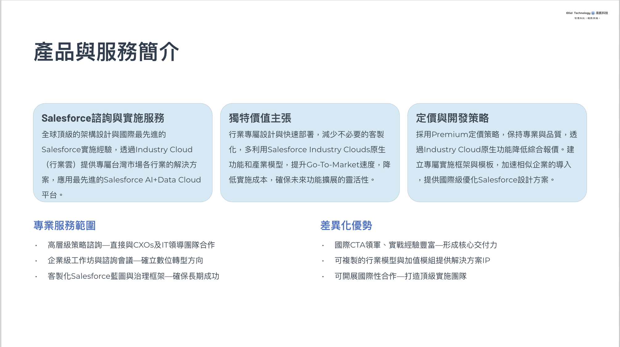 About EKel Technology Co. LTD. EKel Technology(易凱科技)是一家專注於 Salesforce 諮詢與實施的專業團隊,由世界級 CTA(Certified Technical Architect)級架構師領導。 我們致力於協助企業完成數位轉型,提供從策略規劃、系統設計、到落地實施的一條龍服務。 ####我們深耕 Industry Cloud、Sales Cloud、Service Cloud 等 Salesforce 核心功能,並靈活整合資料管理與 AI 方案,協助企業最大化 CRM 投資價值,提升營運效率與客戶體驗。 ####我們的核心價值是「以客戶為中心」、「以原生功能為主體」與「技術卓越執行」。我們理解每家公司業務模式不同,因此提供量身打造的解決方案,優先使用 Salesforce 原生 (OOTB) 功能,減少過度客製化,以確保系統穩定、易維護且具擴展性。 ####迄今為止,我們已協助超過 10 家企業成功導入 Salesforce 解決方案,涵蓋零售、金融、保險、法律、教育等多種產業 — 不論是中小企業或大型組織,都能在我們的專業指導下快速落地並提升營運成果。 ####選擇 EKel Technology,代表選擇值得信賴的 Salesforce 專家、穩健可擴展的技術架構、以及專注於客戶成功的夥伴。我們期待與您攜手共創數位轉型新高度。####EKel Technology is a specialized Salesforce consulting and implementation firm led by top-tier CTA (Certified Technical Architect) professionals. We are committed to guiding businesses through full-cycle digital transformation — from strategic planning and architecture design to seamless deployment and long-term support. ####Leveraging Salesforce core and Industry Cloud capabilities, as well as data and AI integrations, we deliver scalable CRM solutions that maximize the value of your investment, streamline operations, and enhance customer experience.